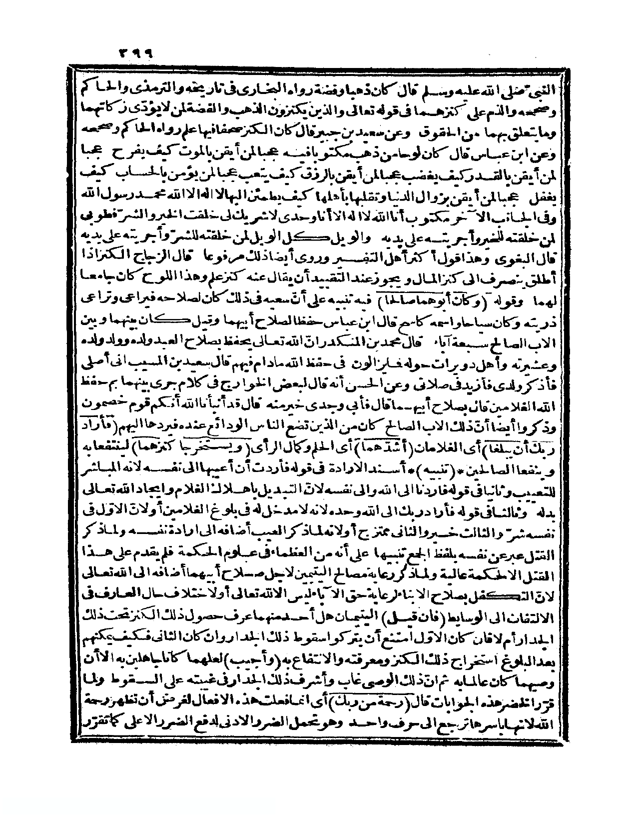 لمن لا يؤدي زكاتهما وما يتعلق بهما من الحقوق، وعن سعيد بن جبير قال: كان الكنز صحفاً فيها علم رواه الحاكم وصححه، وعن ابن عباس قال: كان لوحاً من ذهب مكتوباً فيه عجباً لمن أيقن بالموت كيف يفرح عجباً لمن أيقن بالقدر كيف يغضب عجباً لمن أيقن بالرزق كيف يتعب عجباً لمن يؤمن بالحساب كيف يغفل، عجباً لمن أيقن بزوال الدنيا وتقلبها بأهلها كيف يطمئن إليها، لا إله إلا الله محمد رسول الله، وفي الجانب الآخر مكتوب أنا الله لا إله إلا أنا وحدي لا شريك لي خلقت الخير والشر فطوبى لمن خلقته للخير وأجريته على يديه، والويل كل الويل لمن خلقته للشر وأجريته على يديه، قال البغوي: وهذا قول أكثر أهل التفسير وروي أيضاً ذلك مرفوعاً. قال الزجاج: الكنز إذا أطلق ينصرف إلى كنز المال ويجوز عند التقييد أن يقال عنه كنز علم وهذا اللوح كان جامعاً لهما، وقوله: {وكان أبوهما صالحاً} فيه تنبيه على أن سعيه في ذلك كان لصلاحه فيراعى وتراعى ذريته، وكان سياحاً واسمه كاسح، قال ابن عباس: حفظا لصلاح أبيهما وقيل: كان بينهما وبين الأب الصالح سبعة آباء، قال محمد بن المنكدر: إن الله تعالى يحفظ بصلاح العبد ولده وولد ولده وعشيرته وأهل دويرات حوله فما يزالون في حفظ الله ما دام فيهم، قال سعيد بن المسيب: إني أصلي فأذكر ولدي فأزيد في صلاتي، وعن الحسن أنه قال لبعض الخوارج في كلام جرى بينهما: بم حفظ الله الغلامين قال: بصلاح أبيهما، قال: فأبي وجدي خير منه، قال: قد أنبأنا الله أنكم قوم خصمون وذكروا أيضاً أن ذلك الأب الصالح كان من الذين تضع الناس الودائع عنده فيردها إليهم {فأراد ربك أن يبلغا} أي: الغلامان {أشدّهما} أي: الحلم وكمال الرأي {ويستخرجا كنزهما} لينتفعا به وينفعا الصالحين.