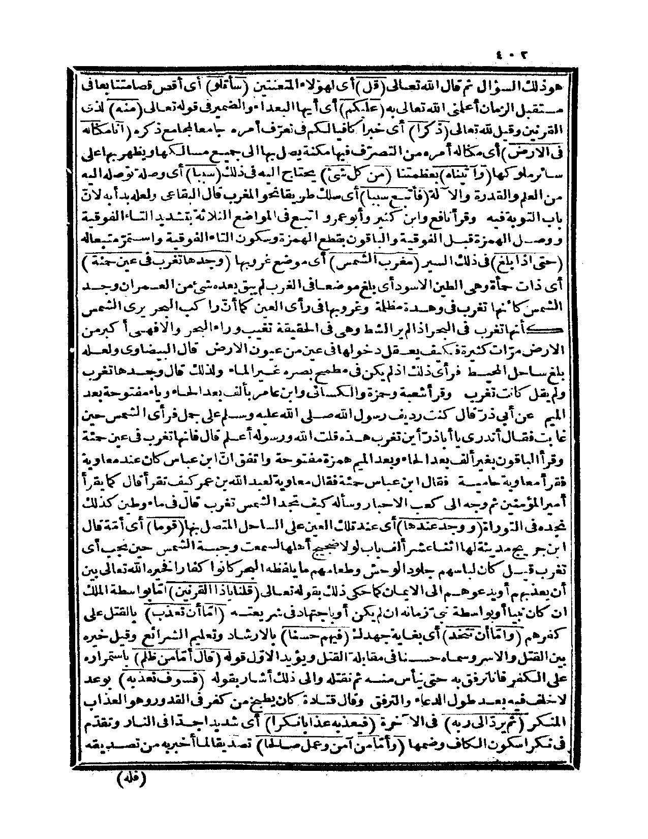 {حتى إذا بلغ} في ذلك السير {مغرب الشمس} أي: موضع غروبها {وجدها تغرب في عين حمئة} أي: ذات حمأة وهي الطين الأسود أي: بلغ موضعاً في الغرب لم يبق بعده شيء من العمران وجد الشمس كأنها تغرب في وهدة مظلمة وغروبها في رأي العين كما أن راكب البحر يرى الشمس كأنها تغرب في البحر إذا لم ير الشط وهي في الحقيقة تغيب وراء البحر وإلا فهي أكبر من الأرض مرّات كثيرة فكيف يعقل دخولها في عين من عيون الأرض، قال البيضاوي: ولعله بلغ ساحل المحيط فرأى ذلك إذ لم يكن في مطمح بصره غير الماء ولذلك قال: وجدها تغرب ولم يقل كانت تغرب، وقرأ شعبة وحمزة والكسائي وابن عامر بألف بعد الحاء وياء مفتوحة بعد الميم. عن أبي درّ قال: كنت رديف رسول الله صلى الله عليه وسلم على جمل فرأى الشمس حين غابت فقال: أتدري يا أبا ذرّ أين تغرب هذه؟ قلت: الله ورسوله أعلم قال: فإنها تغرب في عين حمئة، وقرأ الباقون بغير ألف بعد الحاء وبعد الميم همزة مفتوحة، واتفق أن ابن عباس كان عند معاوية فقرأ معاوية حامية فقال ابن عباس: حمئة فقال معاوية لعبد الله بن عمر: كيف تقرأ قال: كما يقرأ أمير المؤمنين ثم وجه إلى كعب الأحبار وسأله كيف تجد الشمس تغرب؟ قال: في ماء وطين كذلك نجده في التوراة {ووجد عندها} أي: عند تلك العين على الساحل المتصل بها {قوماً} أي: أمة، قال ابن جريج: مدينة لها اثنا عشر ألف باب لولا ضجيج أهلها لسمعت وجبة الشمس حين تجب أي: تغرب، قيل: كان لباسهم جلود الوحش وطعامهم ما يلفظه البحر كانوا كفاراً فخيره الله تعالى بين أن يعذبهم أو يدعوهم إلى الإيمان كما حكى ذلك بقوله تعالى: {قلنا يا ذا
