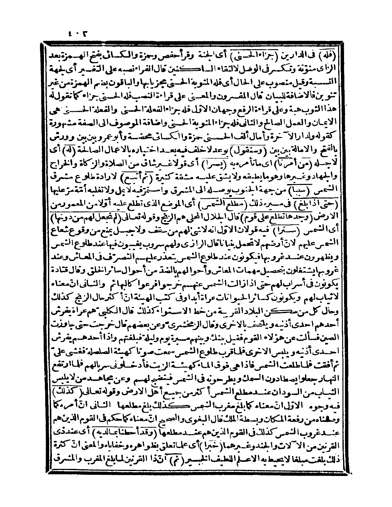 {حتى إذا بلغ} في مسيره ذلك {مطلع الشمس} أي: الموضع الذي تطلع عليه أولاً من المعمور من الأرض {وجدها تطلع على قوم} ، قال الجلال المحلى: هم الزنج وقوله تعالى: {لم نجعل لهم من دونها} أي: الشمس {ستراً} فيه قولان، الأول: أنه لا شيء لهم من سقف ولا جبل يمنع من وقوع شعاع الشمس عليهم لأن أرضهم لا تحمل بنياناً، قال الرازي: ولهم سروب يغيبون فيها عند طلوع الشمس ويظهرون عند غروبها فيكونون عند طلوع الشمس يتعذر عليهم التصرّف في المعاش وعند غروبها يشتغلون بتحصيل مهمات المعاش وأحوالهم بالضدّ من أحوال سائر الخلق، وقال قتادة: يكونون في أسراب لهم حتى إذا زالت الشمس عنهم خرجوا فرعوا كالبهائم، والثاني: أن معناه لا ثياب لهم ويكونون كسائر الحيوانات عراة أبداً وفي كتب الهيئة أن أكثر حال الزنج كذلك وحال كل من سكن البلاد القريبة من خط الاستواء، كذلك قال الكلبي: هم عراة يفرش أحدهم إحدى أذنيه ويلتحف بالأخرى، وقال الزمخشري وعن بعضهم قال: خرجت حتى جاوزت الصين فسألت عن هؤلاء القوم فقيل: بينك وبينهم مسيرة يوم وليلة فبلغتهم وإذا أحدهم يفرش إحدى أذنيه ويلبس الأخرى، فلما قرب طلوع الشمس سمعت صوتاً كهيئة الصلصلة فغشى عليّ ثم أفقت فلما طلعت الشمس فإذا هي فوق الماء كهيئة الزيت فأدخلوني سربالهم فلما ارتفع النهار جعلوا يصطادون السمك ويطرحونه في الشمس فينضج لهم، وعن مجاهد من لا يلبس الثياب من السودان عند مطلع الشمس أكثر من جميع أهل الأرض وقوله تعالى: