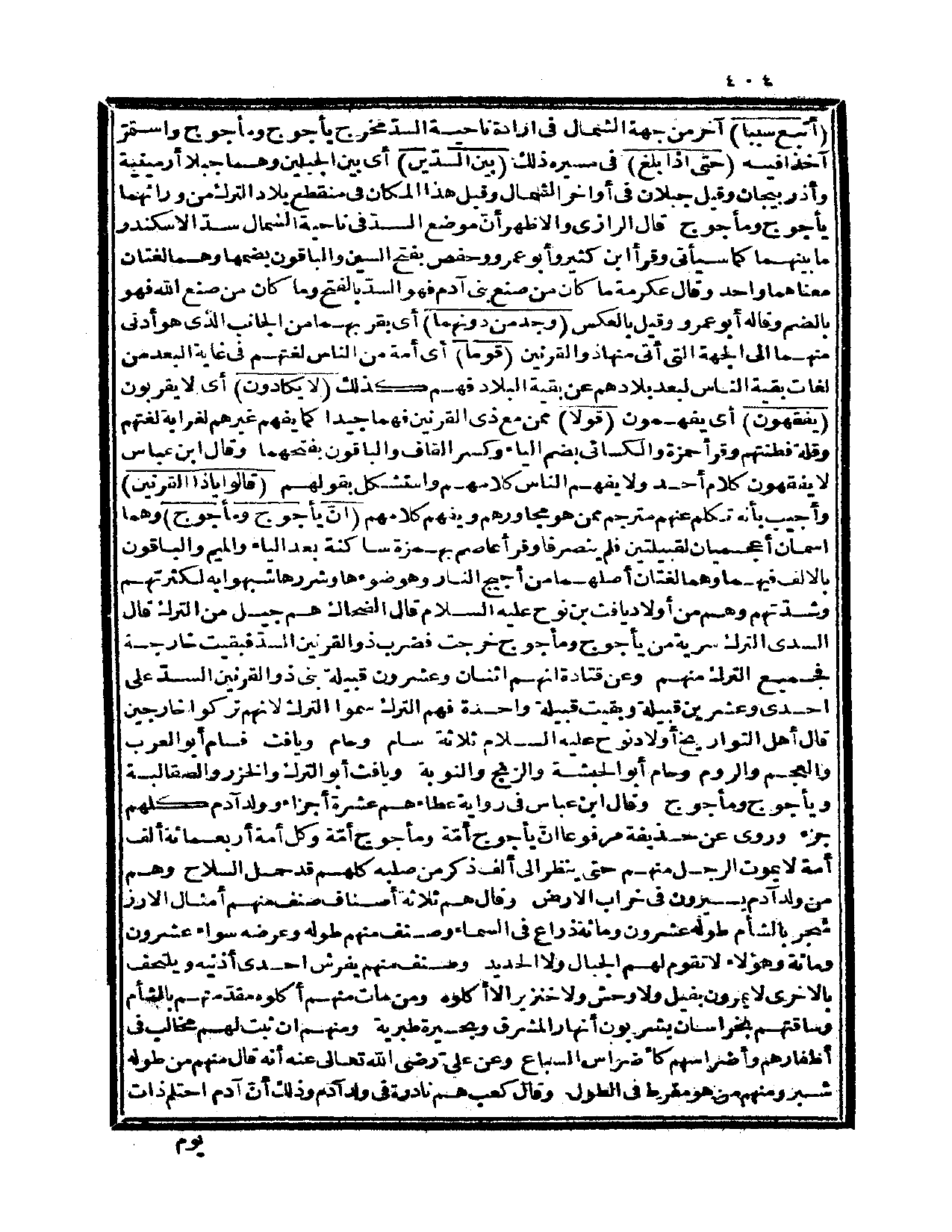 {قالوا يا ذا القرنين} وأجيب بأنه تكلم عنهم مترجم ممن هو مجاورهم ويفهم كلامهم {إن يأجوج ومأجوج} وهما اسمان أعجميان لقبيلتين فلم ينصرفا، وقرأ عاصم بهمزة ساكنة بعد الياء والميم والباقون بالألف فيهما وهما لغتان أصلهما من أجيج النار وهو ضوءها وشررها شبهوا به لكثرتهم وشدتهم وهم من أولاد يافث بن نوح عليه السلام، قال الضحاك: هم جيل من الترك، قال السدي: الترك سرية من يأجوج ومأجوج خرجت فضرب ذو القرنين السدّ فبقيت خارجة فجميع الترك منهم، وعن قتادة أنهم اثنان وعشرون قبيلة بنى ذو القرنين السدّ على إحدى وعشرين قبيلة وبقيت قبيلة واحدة فهم الترك سموا الترك لأنهم تركوا خارجين، قال: أهل التواريخ أولاد نوح عليه السلام ثلاثة: سام وحام ويافث، فسام أبو العرب والعجم والروم، وحام أبو الحبشة والزنج والنوبة، ويافث أبو الترك والخزر والصقالبة ويأجوج ومأجوج، وقال ابن عباس في رواية عطاء هم عشرة أجزاء وولد آدم كلهم جزء، وروي عن حذيفة مرفوعاً أن يأجوج أمة ومأجوج أمة وكل أمة أربعمائة ألف أمة لا يموت الرجل منهم حتى ينظر إلى ألف ذكر من صلبه كلهم قد حمل السلاح وهم من ولد آدم يسيرون في خراب الأرض، وقال: هم ثلاثة أصناف صنف منهم أمثال الأرز شجر بالشام طوله عشرون ومائة ذراع في السماء، وصنف منهم طوله وعرضه سواء عشرون ومائة وهؤلاء لا تقوم لهم الجبال ولا الحديد، وصنف منهم يفرش إحدى أذنيه ويلتحف بالأخرى لا يمرون بفيل ولا وحش ولا خنزير إلا أكلوه ومن مات منهم أكلوه مقدمتهم بالشام وساقتهم بخراسان يشربون أنهار المشرق وبحيرة طبرية، ومنهم أن ثبت لهم مخالب في أظفارهم وأضراسهم كأضراس السباع، وعن علي رضي الله تعالى عنه أنه قال: منهم من طوله شبر ومنهم من هو مفرط في الطول، وقال كعب: هم نادرة في ولد آدم وذلك أن آدم احتلم ذات