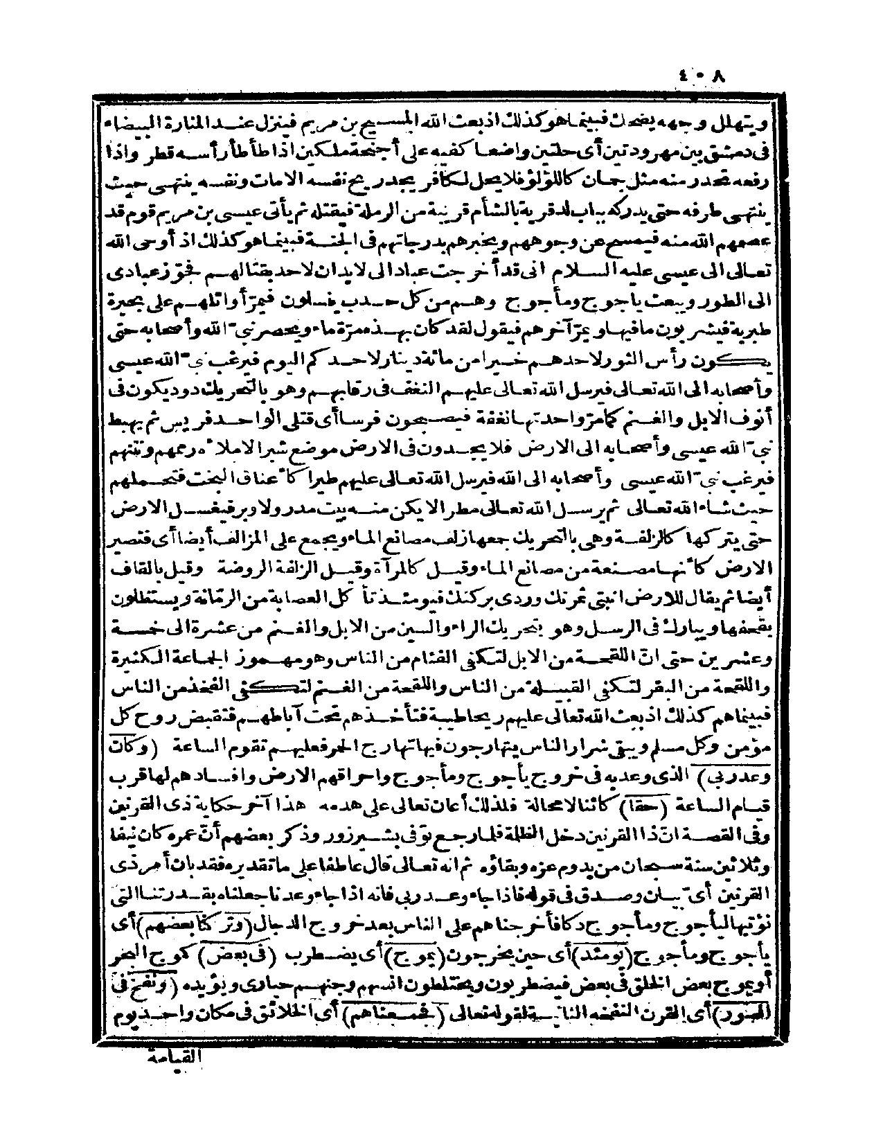 ويتهلل وجهه يضحك فبينما هو كذلك إذ بعث الله المسيح بن مريم فينزل عند المنارة البيضاء في دمشق بين مهرودتين أي: حلتين واضعاً كفيه على أجنحة ملكين إذا طأطأ رأسه قطر، وإذا رفعه تحدر منه مثل جمان كاللؤلؤ فلا يحل لكافر يجد ريح نفسه إلا مات ونفسه ينتهي حيث ينتهي طرفه حتى يدركه بباب لد قرية بالشام قريبة من الرملة فيقتله ثم يأتي عيسى بن مريم قوم قد عصمهم الله منه فيمسح عن وجوههم ويخبرهم بدرجاتهم في الجنة فبينما هو كذلك إذ أوحى الله تعالى إلى عيسى عليه السلام إني قد أخرجت عباداً لي لا يدان لأحد بقتالهم فجوّز عبادي إلى الطور ويبعث يأجوج ومأجوج وهم من كل حدب ينسلون فيمرّ أوائلهم على بحيرة طبرية فيشربون ما فيها ويمرّ آخرهم فيقول: لقد كان بهذه مرّة ماء ويحصر نبي الله وأصحابه حتى يكون رأس الثور لأحدهم خيراً من مائة دينار لأحدكم اليوم فيرغب نبي الله عيسى وأصحابه إلى الله تعالى فيرسل الله تعالى عليهم النغف في رقابهم وهو بالتحريك دود يكون في أنوف الإبل والغنم كما مرّ واحدتها نغفة فيصبحون فرساً أي: قتلى الواحد فريس، ثم يهبط نبي الله عيسى وأصحابه إلى الأرض فلا يجدون في الأرض موضع شبر إلا ملأه رممهم ونتنهم فيرغب نبيّ الله عيسى وأصحابه إلى الله فيرسل الله تعالى عليهم طيراً كأعناق البخت فتحملهم حيث شاء الله تعالى، ثم يرسل