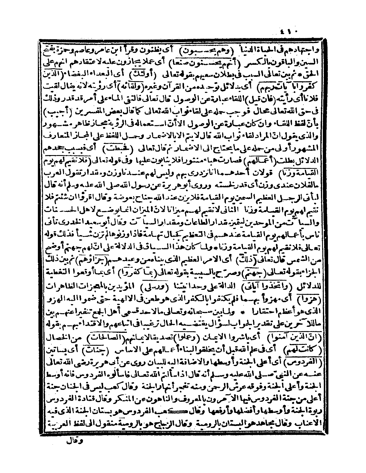 {إن الذين آمنوا} أي: باشروا الإيمان {وعملوا} تصديقاً لإيمانهم {الصالحات} من الخصال {كانت لهم} أي: في علم الله قبل أن يخلقوا البناء أعمالهم على الأساس {جنات} أي: بساتين {الفردوس} أي: أعلى الجنة وأوسطها والإضافة إليه للبيان، روي عن أبي هريرة رضي الله تعالى عنه عن النبي صلى الله عليه وسلم أنه قال: «إذا سألتم الله تعالى فاسألوه الفردوس فإنه أوسط الجنة وأعلى الجنة وفوقه عرش الرحمن ومنه تفجر أنهار الجنة» وقال كعب: ليس في الجنان جنة أعلى من جنة الفردوس فيها الآمرون بالمعروف والناهون عن المنكر، وقال قتادة: الفردوس ربوة الجنة وأوسطها وأفضلها وأرفعها، وقال كعب: الفردوس هو بستان الجنة الذي فيه الأعناب، وقال مجاهد: هو البستان بالرومية، وقال الزجاج: هو بالرومية منقول إلى لفظ العربية،