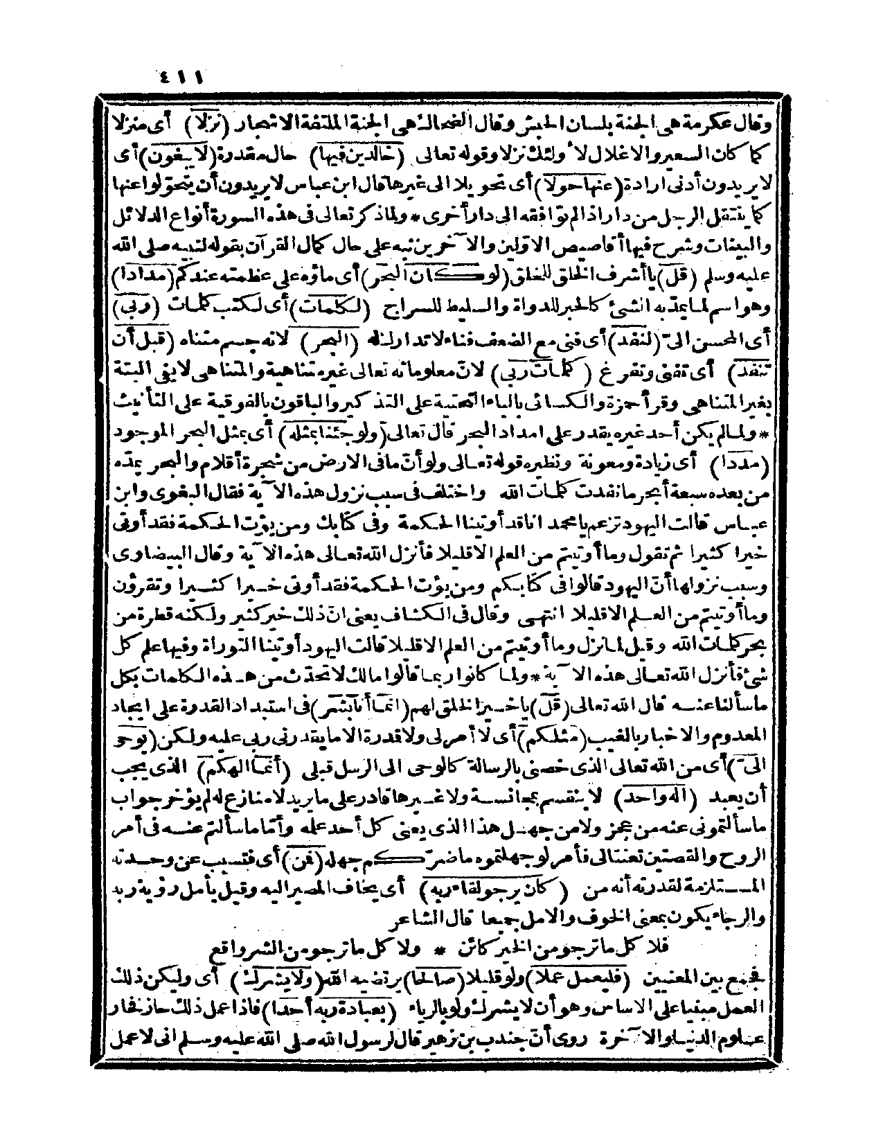 {قل} يا أشرف الخلق للخلق {لو كان البحر} أي: ماؤه على عظمته عندكم {مداداً} وهو اسم لما يمدّ به الشيء كالحبر للدواة والسليط للسراج {لكلمات} أي: لكتب كلمات {ربي} أي: المحسن إليّ {لنفد} أي: فني مع الضعف فناء لا تدارك له {البحر} لأنه جسم متناه {قبل أن تنفذ} أي: تفنى وتفرغ {كلمات ربي} لأنّ معلوماته تعالى غير متناهية والمتناهي لا يفي البتة بغير المتناهي، وقرأ حمزة والكسائي بالياء التحتية على التذكير والباقون بالفوقية على التأنيث. ولما لم يكن أحد غيره يقدر على إمداد البحر قال تعالى: {ولو جئنا بمثله} أي: بمثل البحر الموجود {مدداً} أي: زيادة ومعونة ونظيره قوله تعالى: {ولو أن ما في الأرض من شجرة أقلام، والبحر يمدّه من بعده سبعة أبحر ما نفدت كلمات الله} (لقمان، 27) ، واختلف في سبب نزول هذه الآية، فقال البغوي وابن عباس: قالت اليهود: تزعم يا محمد أنا قد أوتينا الحكمة، وفي كتابك {ومن يؤت الحكمة فقد أوتي خيراً كثيراً} (النبوة، 269) ، ثم تقول: {وما أوتيتم من العلم إلا قليلاً} ، فأنزل الله تعالى هذه الآية، وقال البيضاوي: وسبب نزولها أن اليهود قالوا: في كتابكم ومن يؤت الحكمة فقد أوتي خيراً كثيراً وتقرؤون وما أوتيتم من العلم إلا قليلاً انتهى. وقال في «الكشاف» يعني أن ذلك خير كثير ولكنه قطرة من بحر كلمات الله، وقيل: لما نزل وما أوتيتم من العلم إلا قليلاً، قالت اليهود: أوتينا التوراة وفيها علم كل شيء فأنزل الله تعالى هذه الآية. ولما كانوا ربما قالوا: مالك لا تحدّث من
