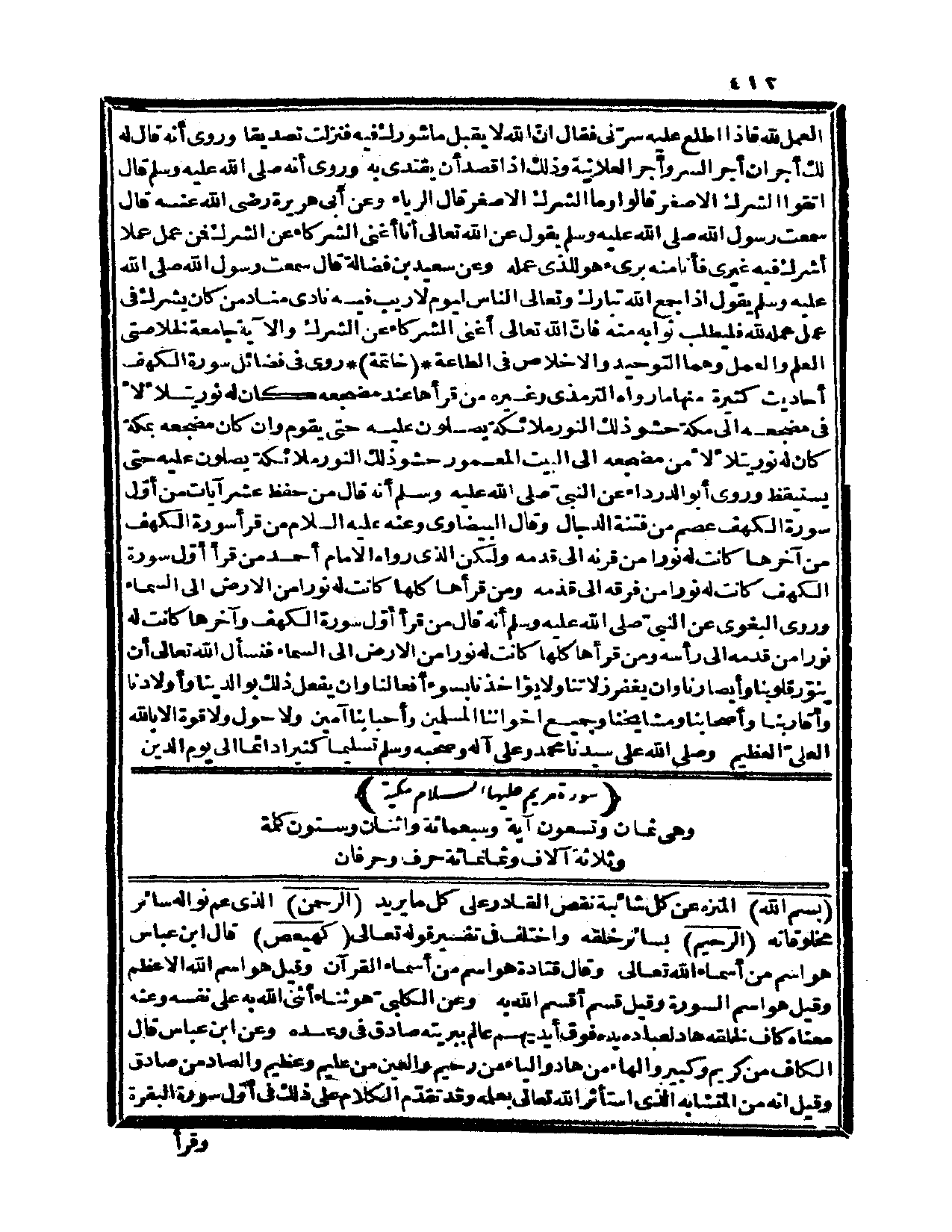 خاتمة: روي في فضائل سورة الكهف أحاديث كثيرة منها ما رواه الترمذي وغيره من قرأها عند مضجعه كان له نور يتلألأ في مضجعه إلى مكة حشو ذلك النور ملائكة يصلون عليه حتى يقوم وإن كان مضجعه بمكة كان له نور يتلألأ من مضجعه إلى البيت المعمور حشو ذلك النور ملائكة يصلون عليه حتى يستيقظ، وروي أبو الدرداء عن النبي صلى الله عليه وسلم أنه قال: «من حفظ عشر آيات من أول سورة الكهف عصم من فتنة الدجال» ، وقال البيضاوي وعنه عليه السلام: «من قرأ سورة الكهف من آخرها كانت له نوراً من قرنه إلى قدمه» ، ولكن الذي رواه الإمام أحمد: «من قرأ أول سورة الكهف كانت له نوراً من فرقه إلى قدمه، ومن قرأها كلها كانت له نوراً من الأرض إلى السماء» ، وروى البغوي عن النبي صلى الله عليه وسلم أنه قال: «من قرأ أوّل سورة الكهف وآخرها كانت له نوراً من قدمه إلى رأسه، ومن قرأها كلها كانت له نوراً من الأرض إلى السماء» فنسأل الله تعالى أن ينوّر قلوبنا وأبصارنا وأن يغفر زلاتنا ولا يؤاخذنا بسوء أفعالنا، وأن يفعل ذلك بوالدينا وأولادنا وأقاربنا وأصحابنا ومشايخنا وجميع إخواننا المسلمين وأحبابنا آمين ولا حول ولا قوة إلا بالله العليّ العظيم وصلى الله على سيدنا محمد وعلى آله وصحبه وسلم تسليماً كثيراً دائماً إلى يوم الدين.
