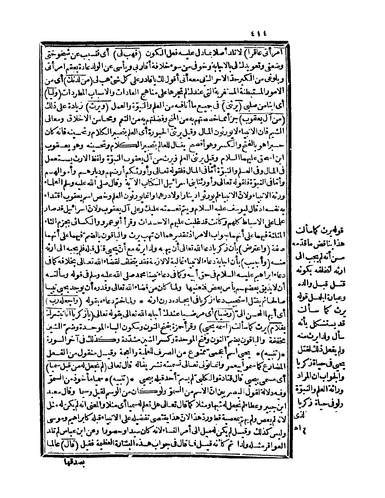 الآية، وقال صلى الله عليه وسلم «العلماء ورثة الأنبياء» ولأن الأنبياء لم يورثوا ديناراً ولا درهماً وإنما يورثون العلم وخص اسم يعقوب اقتداء به نفسه إذ قال ليوسف عليه السلام: {ويتم نعمته عليك وعلى آل يعقوب} (يوسف، 6)