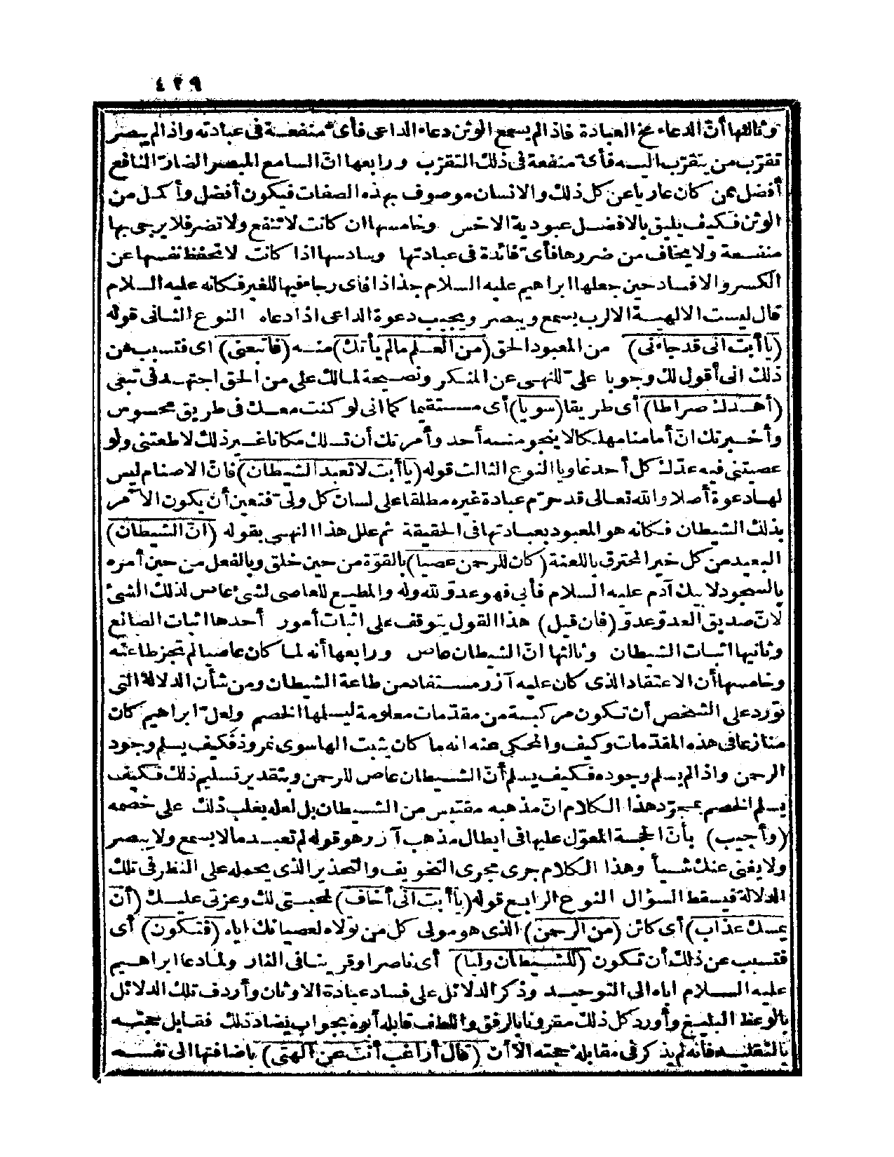 فإن قيل: هذا القول يتوقف على إثبات أمور؛ أحدها: إثبات الصانع، وثانيها: إثبات الشيطان، وثالثها: أنّ الشيطان عاص، ورابعها: أنه لما كان عاصياً لم تجز طاعته، وخامسها: أن الاعتقاد الذي كان عليه آزر مستفاد من طاعة الشيطان ومن شأن الدلالة التي تورد على الشخص أن تكون مركبة من مقدّمات معلومة ليسلمها الخصم ولعلّ إبراهيم كان منازعاً في هذه المقدّمات وكيف والمحكي عنه أنه ما كان يثبت إلهاً سوى نمروذ فكيف يسلم وجود الرحمن وإذا لم يسلم وجوده فكيف يسلم أنّ الشيطان عاص للرحمن وبتقدير تسليم ذلك فكيف يسلم الخصم بمجرّد هذا الكلام أنّ مذهبه مقتبس من الشيطان بل لعله يغلب ذلك على خصمه؟ وأجيب: بأنّ الحجة المعوّل عليها في إبطال مذهب آزر هو قوله: {لم تعبد ما لا يسمع ولا يبصر ولا يغنى عنك شيئاً} وهذا الكلام جرى مجرى التخويف والتحذير الذي يحمله على النظر في تلك الدلالة فيسقط السؤال. النوع الرابع قوله: