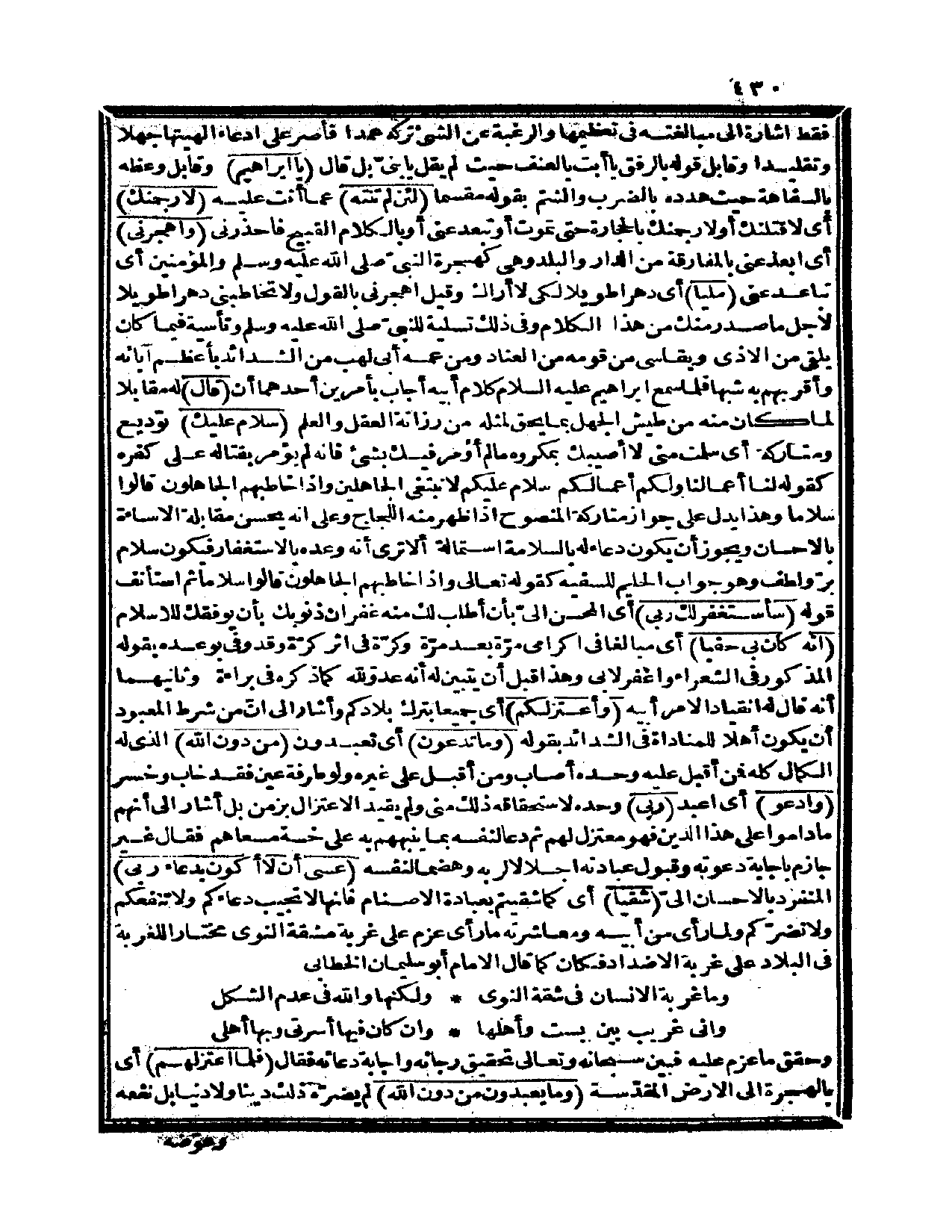 فقط إشارة إلى مبالغته في تعظيمها والرغبة عن الشيء تركه عمداً فأصر على ادعاء إلهيتها جهلاً وتقليداً وقابل قوله بالرفق يا أبت بالعنف حيث لم يقل يا بنيّ بل قال {يا إبراهيم} وقابل وعظه بالسفاهة حيث هدده بالضرب والشتم بقوله مقسماً {لئن لم تنته} عما أنت عليه {لأرجمنك} أي: لأقتلنك أو لأرجمنك بالحجارة حتى تموت أو تبعد عني أو بالكلام القبيح فاحذرني {واهجرني} أي: بعد عني بالمفارقة من الدار والبلد وهي كهجرة النبيّ صلى الله عليه وسلم والمؤمنين أي: تباعد عني {ملياً} أي: دهراً طويلاً لكي لا أراك، وقيل: اهجرني بالقول ولا تخاطبني دهراً طويلاً لأجل ما صدر منك من هذا الكلام وفي ذلك تسلية للنبيّ صلى الله عليه وسلم وتأسية فيما كان يلقى من الأذى ويقاسي من قومه من العناد ومن عمه أبي لهب من الشدائد بأعظم آبائه وأقربهم به شبهاً، فلما سمع إبراهيم عليه السلام كلام أبيه أجاب بأمرين أحدهما أن