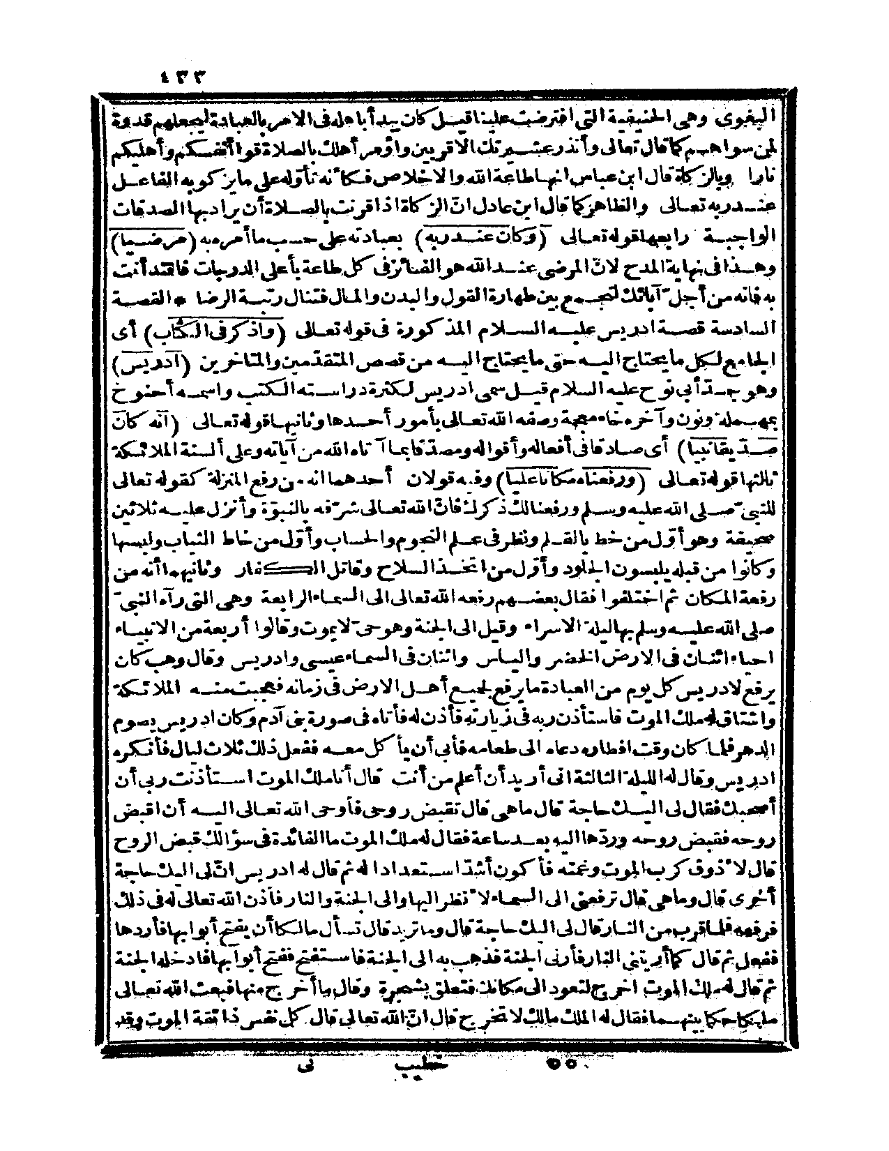 وثانيهما: أنه من رفعة المكان ثم اختلفوا فقال بعضهم: رفعه الله تعالى إلى السماء الرابعة وهي التي رآه النبيّ صلى الله عليه وسلم بها ليلة الإسراء وقيل: إلى الجنة وهو حيّ لا يموت وقالوا أربعة من الأنبياء أحياء اثنان في الأرض الخضر وإلياس واثنان في السماء عيسى وإدريس وقال وهب كان يرفع لإدريس كل يوم من العبادة ما يرفع لجميع أهل الأرض في زمانه فعجبت منه الملائكة واشتاق له ملك الموت فاستأذن ربه في زيارته فأذن له فأتاه في صورة بني آدم وكان إدريس يصوم الدهر فلما كان وقت إفطاره دعاه إلى طعامه فأبى أن يأكل معه ففعل ذلك ثلاث ليال فأنكره إدريس وقال له الليلة الثالثة: إني أريد أن أعلم من أنت، قال أنا ملك الموت استأذنت ربي أن أصحبك فقال: لي إليك حاجة قال ما هي قال تقبض روحي فأوحى الله تعالى إليه أن اقبض روحه، فقبض روحه وردّها إليه بعد ساعة، فقال له ملك الموت: ما الفائدة في سؤالك قبض الروح؟ قال لأذوق كرب الموت وغمته فأكون أشدّ استعداد له، ثم قال له إدريس: إنّ لي إليك حاجة أخرى، قال: وما هي قال ترفعني إلى السماء لأنظر إليها وإلى الجنة والنار فأذن الله تعالى له في ذلك فرفعه فلما قرب من النار قال: لي إليك حاجة، قال: وما تريد؟ قال: تسأل مالكاً أن يفتح أبوابها فأردها، ففعل ثم قال: كما أريتني النار فأرني الجنة فذهب به إلى الجنة فاستفتح ففتح أبوابها فأدخله الجنة ثم قال له ملك الموت اخرج لتعود إلى مكانك فتعلق بشجرة وقال ما أخرج منها فبعث الله تعالى ملكاً حكماً بينهما، فقال له الملك: ما لك لا تخرج؟ قال: إنّ الله تعالى قال: {كل نفس ذائقة الموت} (آل عمران، 185)