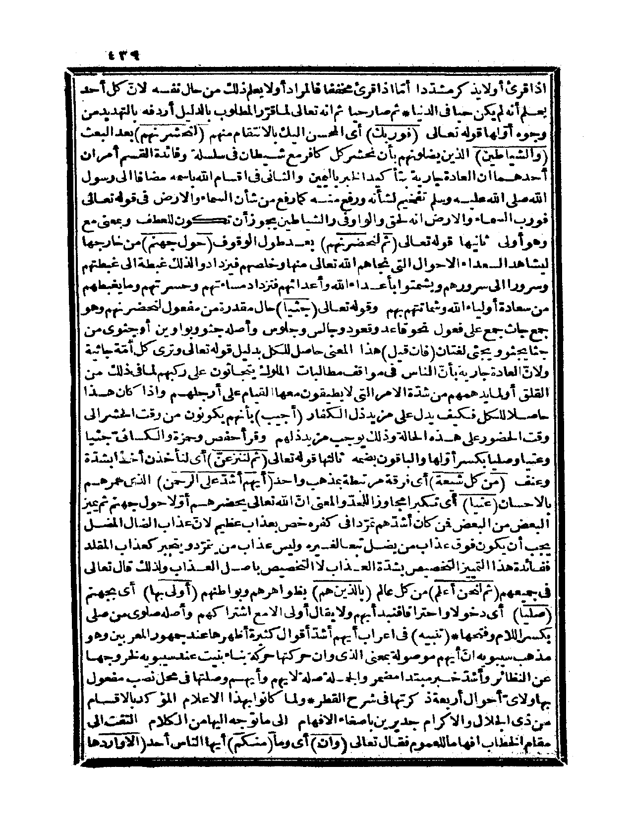 والواو في والشياطين يجوز أن تكون للعطف وبمعنى مع وهو أولى. ثانيها: قوله تعالى {ثم لنحضرنهم} بعد طول الوقوف {حول جهنم} من خارجها ليشاهد السعداء الأحوال التي نجاهم الله تعالى منها وخلصهم فيزدادوا لذلك غبطة إلى غبطتهم وسروراً إلى سرورهم ويشمتوا بأعداء الله وأعدائهم فتزداد مساءتهم وحسرتهم وما يغبطهم من سعادة أولياء الله وشماتتهم بهم وقوله تعالى {جثياً} حال مقدرة من مفعول لنحضرنهم وهو جمع جاث جمع على فعول نحو قاعد وقعود وجالس وجلوس وأصله جثوو بواوين أو جثوى من جثاً يجثو ويجثى لغتان.