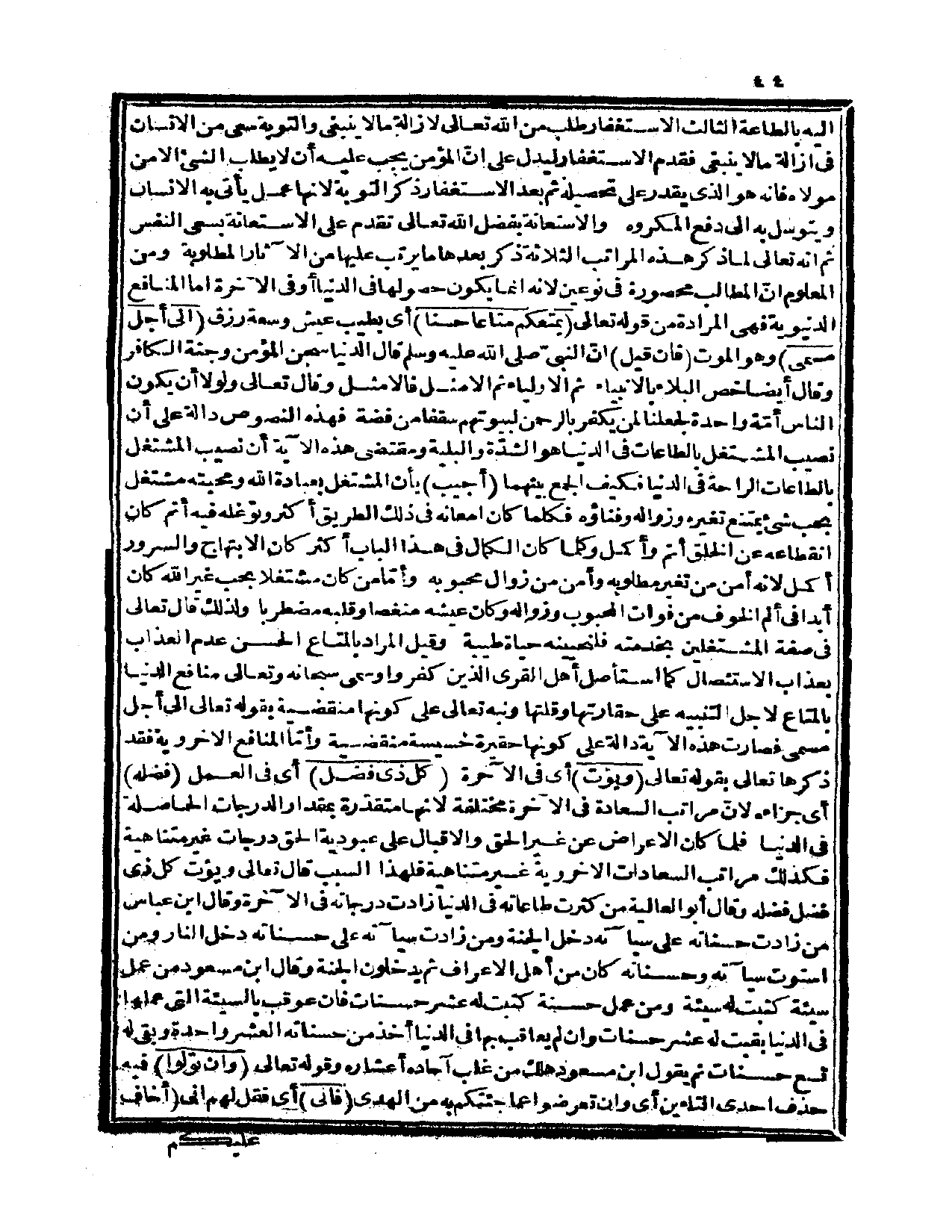 إليه بالطاعة. الثالث: الاستغفار طلب من الله تعالى لإزالة ما لا ينبغي والتوبة سعي من الإنسان في إزالة ما لا ينبغي فقدم الاستغفار ليدل على أنّ المؤمن يجب عليه أن لا يطلب الشيء إلا من مولاه فإنه هو الذي يقدر على تحصيله، ثم بعد الاستغفار ذكر التوبة؛ لأنها عمل يأتي به الإنسان ويتوسل به إلى دفع المكروه، والاستعانة بفضل الله تعالى تقدم على الاستعانة بسعي النفس، ثم إنه تعالى لما ذكر هذه المراتب الثلاثة ذكر بعدها ما يرتب عليها من الآثار المطلوبة، ومن المعلوم أنّ المطالب محصورة في نوعين؛ لأنه إنما يكون حصولها في الدنيا أو في الآخرة أما المنافع الدنيوية فهي المرادة من قوله تعالى: {يمتعكم متاعاً حسناً} أي: بطيب عيش وسعة رزق {إلى أجل مسمى} وهو الموت. فإن قيل: إنّ النبيّ صلى الله عليه وسلم قال: «الدنيا سجن المؤمن وجنة الكافر» . وقال أيضاً: «خص البلاء بالأنبياء ثم الأولياء ثم الأمثل فالأمثل» . وقال تعالى: {ولولا أن يكون الناس أمّة واحدة لجعلنا لمن يكفر بالرحمن لبيوتهم سقفاً من فضة} (الزخرف، 33) فهذه النصوص دالة على أن نصيب المشتغل بالطاعات في الدنيا هو الشدّة والبلية، ومقتضى هذه الآية أن نصيب المشتغل بالطاعات الراحة في الدنيا فكيف الجمع بينهما؟