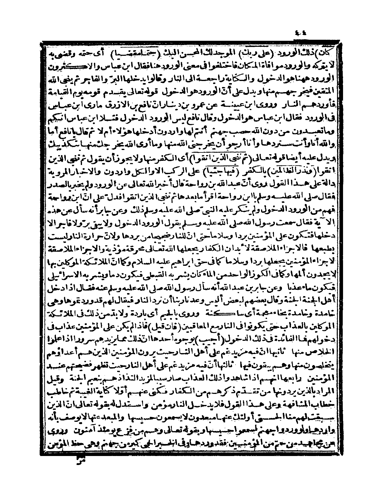 وروى ابن عيينة عن عمرو بن دينار أنّ نافع بن الأزرق مارى ابن عباس في الورود فقال ابن عباس: هو الدخول وقال نافع ليس الورود الدخول، فتلا ابن عباس {إنكم وما تعبدون من دون الله حصب جهنم أنتم لها واردون} (الأنبياء، 98)
