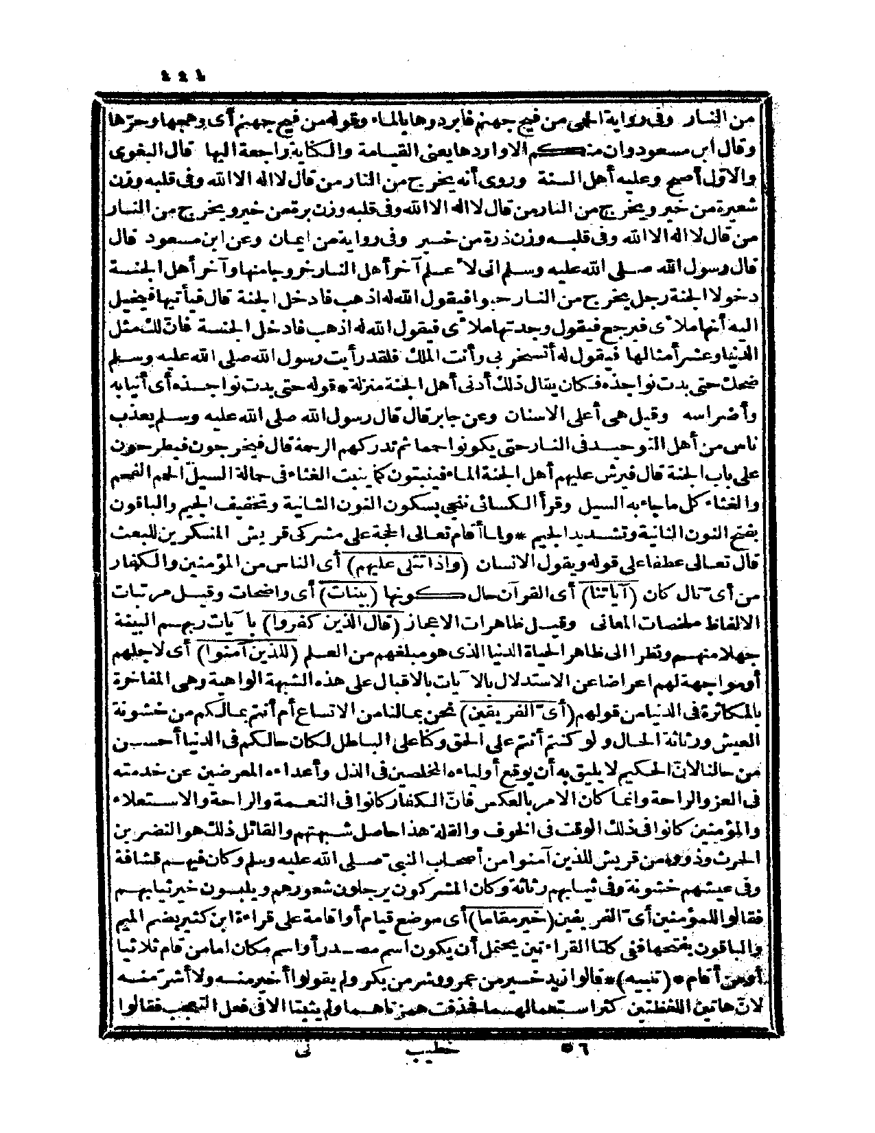من النار وفي رواية الحمى من فيح جهنم فأبردوها بالماء وقوله من فيح جهنم أي: وهجها وحرّها وقال ابن مسعود وإن منكم إلا واردها يعني القيامة والكناية راجعة إليها قال البغوي والأوّل أصح وعليه أهل السنة وروي أنه يخرج من النار من قال لا إله إلا الله وفي قلبه وزن شعيرة من خير ويخرج من النار من قال لا إله إلا الله وفي قلبه وزن برة من خير ويخرج من النار من قال لا إله إلا الله وفي قلبه وزن ذرة من خير وفي رواية من إيمان وعن ابن مسعود قال قال رسول الله صلى الله عليه وسلم «إني لأعلم آخر أهل النار خروجاً منها وآخر أهل الجنة دخولاً الجنة رجل يخرج من النار حبواً فيقول الله له: اذهب فادخل الجنة قال فيأتيها فيخيل إليه أنها ملأى فيرجع فيقول وجدتها ملأى فيقول الله: له اذهب فادخل الجنة فإنّ لك مثل الدنيا وعشر أمثالها فيقول له أتسخر بي وأنت الملك فلقد رأيت رسول الله صلى الله عليه وسلم ضحك حتى بدت نواجذه» فكان يقال ذلك أدنى أهل الجنة منزلة قوله حتى بدت نواجذه أي: أنيابه وأضراسه وقيل: هي أعلى الأسنان.