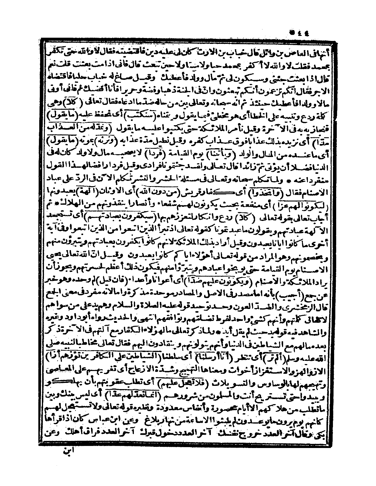أنها في العاص بن وائل قال خباب بن الأرت كان لي عليه دين فاقتضيته فقال: لا والله حتى تكفر بمحمد فقلت: لا والله لا أكفر بمحمد حياً ولا ميتاً ولا حين تبعث قال: فإني إذا مت بعثت قلت: نعم قال: إذا بعثت جئني وسيكون لي ثمّ مال وولد فأعطيك وقيل: صاغ له خباب حُلياً فاقتضاه الأجر فقال: إنكم تزعمون أنكم تبعثون وأنّ في الجنة ذهباً وفضة وحريراً فأنا أقضيك ثم فإني أوتي مالاً وولداً فأعطيك حينئذٍ ثم إنه سبحانه وتعالى بيّن من حاله ضدّ ما ادعاه فقال تعالى: