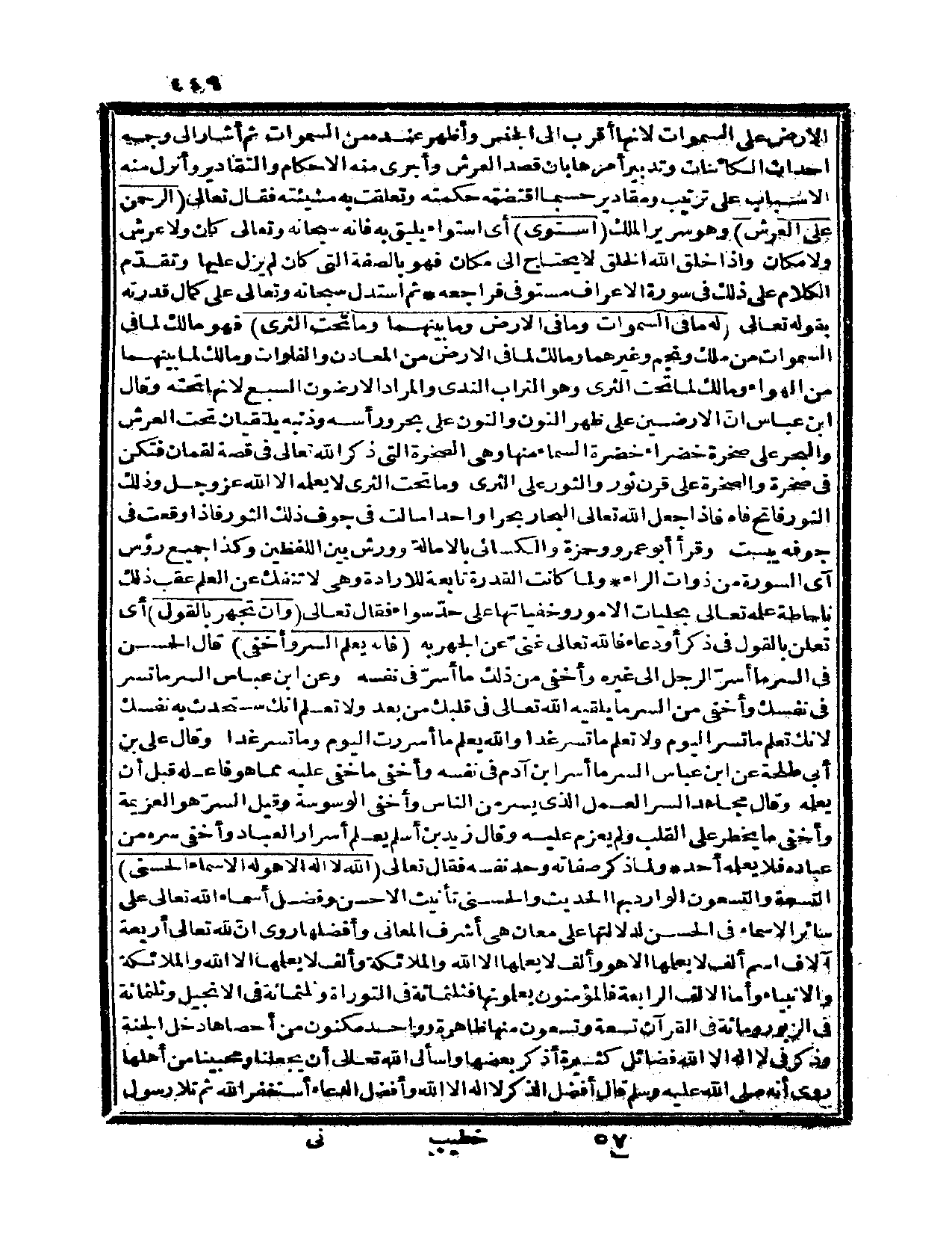 روي أنّ لله تعالى أربعة آلاف اسم ألف لا يعلمها إلا هو وألف لا يعلمها إلا الله والملائكة وألف لا يعلمها إلا الله والملائكة والأنبياء وأما الألف الرابعة فالمؤمنون يعلمونها فثلاثمائة في التوراة وثلاثمائة في الإنجيل وثلاثمائة في الزبور ومائة في القرآن تسعة وتسعون منها ظاهرة وواحد مكنون من أحصاها دخل الجنة وذكر في لا إله إلا الله فضائل كثيرة أذكر بعضها وأسأل الله تعالى أن يجعلنا ومحبينا من أهلها.