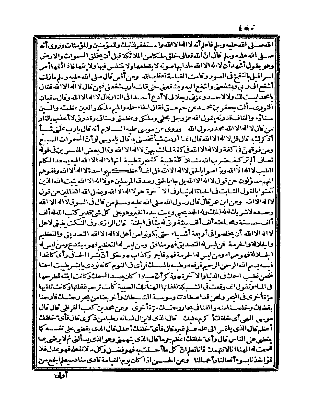 وعن ابن عمر قال: قال رسول الله صلى الله عليه وسلم «من قال في السوق لا إله إلا الله وحده لا شريك له له الملك وله الحمد يحيي ويميت بيده الخير وهو على كل شيء قدير كتب الله له ألف ألف حسنة ومحا عنه ألف ألف سيئة وبنى له بيتاً في الجنة» قال الرازي وفي النكت ينبغي لأهل لا إله إلا الله أن يخلصوا في أربعة أشياء حتى يكونوا من أهل لا إله إلا الله التصديق والتعظيم والجلالة والحرمة فمن ليس له التصديق فهو منافق ومن ليس له التعظيم فهو مبتدع ومن ليس له الجلالة فهو مراء ومن ليس له الحرمة فهو فاجر وكذاب.