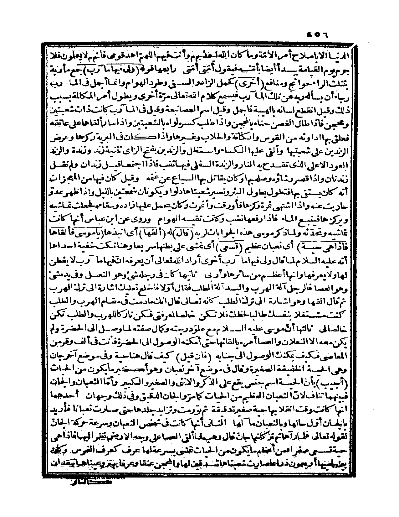 ثالثها: أنّ موسى عليه السلام مع علوّ درجته وكمال صفته لما وصل إلى الحضرة ولم يكن معه إلا النعلان والعصا أمره بإلقائها حتى أمكنه الوصول إلى الحضرة فأنت في ألف وقر من المعاصي فكيف يمكنك الوصول إلى جنابه؟ فإن قيل: كيف قال هنا حية وفي موضع آخر جان وهي الحية الخفيفة الصغيرة وقال في موضع آخر ثعبان وهو أكبر ما يكون من الحيات؟ أجيب: بأنّ الحية اسم جنس يقع على الذكر والأنثى والصغير والكبير وأمّا الثعبان والجان فبينهما تناف لأنّ الثعبان العظيم من الحيات كما مرّو الجان الدقيق وفي ذلك وجهان؛ أحدهما: أنها كانت وقت انقلابها حية صغيرة دقيقة ثم تورمت وتزايد جلدها حتى صارت ثعباناً فأريد بالجان أوّل حالها وبالثعبان مآلها. الثاني: أنها كانت في شخص الثعبان وسرعة حركة الجانّ لقوله تعالى: {فلما رآها تهتز كأنها جانّ} (النمل، 10)