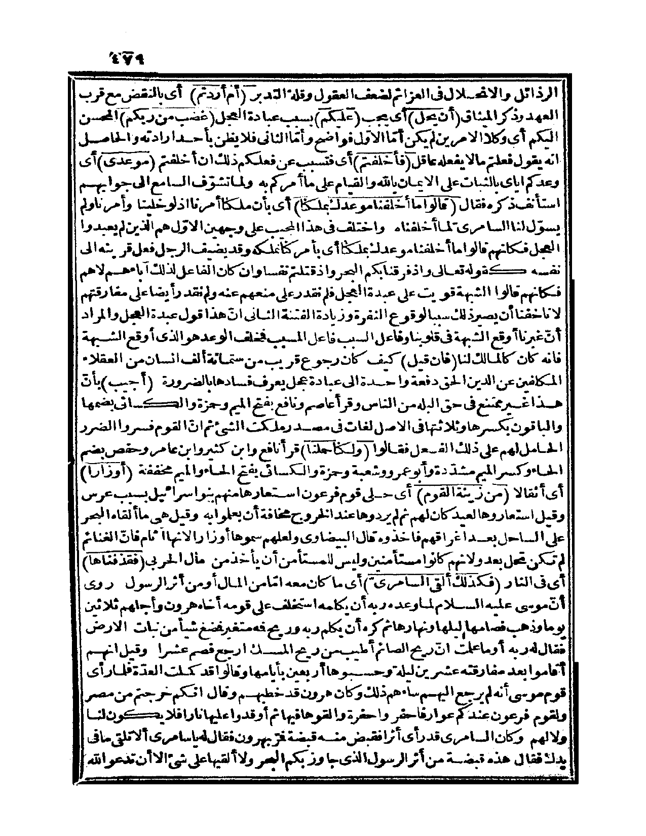 ربه، وريح فمه متغير، فمضغ شيئاً من نبات الأرض، فقال له ربه: أوما علمت أن ريح الصائم أطيب من ريح المسك، ارجع فصم عشراً، وقيل: إنهم أقاموا بعد مفارقته عشرين ليلة، وحسبوها أربعين بأيامها، وقالوا: قد كملت العدة، فلما رأى قوم موسى أنه لم يرجع إليهم ساءهم ذلك، وكان هارون قد خطبهم وقال: إنكم خرجتم من مصر، ولقوم فرعون عندكم عوار، فاحفروا حفرة وألقوها فيها، ثم أوقدوا عليها ناراً، فلا يكون لنا ولا لهم، وكان السامري قد رأى أثراً، فقبض منه قبضة، فمر بهارون فقال له: يا سامري ألا تلقي ما في يدك، فقال: هذه قبضة من أثر الرسول الذي جاوز بكم البحر، ولا ألقيها على شيء إلا أن تدعوا الله