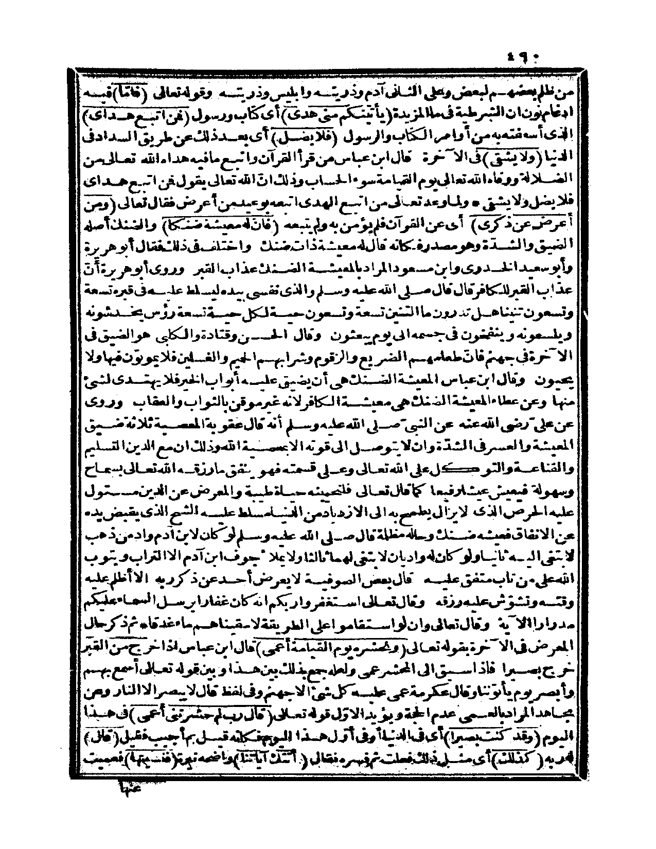 {ومن أعرض عن ذكري} أي: عن القرآن، فلم يؤمن به ولم يتبعه {فإن له معيشة ضنكاً} والضنك أصله الضيق والشدة، وهو مصدر، فكأنه قال: له معيشة ذات ضنك، واختلف في ذلك، فقال أبو هريرة وأبو سعيد الخدري وابن مسعود: المراد بالمعيشة الضنك عذاب القبر، وروى أبو هريرة أنَّ عذاب القبر للكافر، قال: قال صلى الله عليه وسلم «والذي نفسي بيده ليسلط عليه في قبره تسعة وتسعون تنيناً هل تدرون ما التنين؟ تسعة وتسعون حية لكل حية تسعة رؤوس يخدشونه ويلسعونه، وينفخون في جسمه إلى يوم يبعثون» ، وقال الحسن وقتادة والكلبي: هو الضيق في الآخرة في جهنم، فإنّ طعامهم الضريع والزقوم، وشرابهم الحميم والغسلين، فلا يموتون فيها ولا يحيون، وقال ابن عباس: المعيشة الضنك هي أن يضيق عليه أبواب الخير فلا يهتدي لشيء منها، وعن عطاء: المعيشة الضنك هي معيشة الكافر؛ لأنه غير موقن بالثواب والعقاب، وروي عن علي رضي الله عنه عن النبي صلى الله عليه وسلم أنه قال: «عقوبة المعصية ثلاثة؛ ضيق المعيشة والعسر في الشدة، وأن لا يتوصل إلى قوته إلا بمعصية الله» ، وذلك أن مع الدين التسليم والقناعة والتوكل على الله تعالى، وعلى قسمته، فهو ينفق ما رزقه الله تعالى بسماح وسهولة، فيعيش عيشاً رفيعاً كما قال الله تعالى: {فلنحيينه حياة طيبة} (النحل، 97) ، والمعرض عن الدين مستول عليه الحرص الذي لا يزال يطمح به إلى الازدياد من الدنيا مسلط عليه الشح الذي يقبض يده عن الانفاق فعيشه ضنك، وحاله مظلمة، قال صلى الله عليه وسلم «لو كان لابن آدم وادٍ من ذهب لابتغى إليه ثانياً، ولو كان له واديان لابتغى لهما ثالثاً، ولا يملأ جوف ابن آدم إلا التراب، ويتوب الله على من تاب» متفق عليه. قال بعض الصوفية: لا يعرض أحد عن ذكر ربه إلا أظلم عليه وقته، وتشوش عليه رزقه، وقال تعالى: {استغفروا ربكم إنه كان غفاراً يرسل السماء عليكم مدراراً} (نوح: 10، 11)