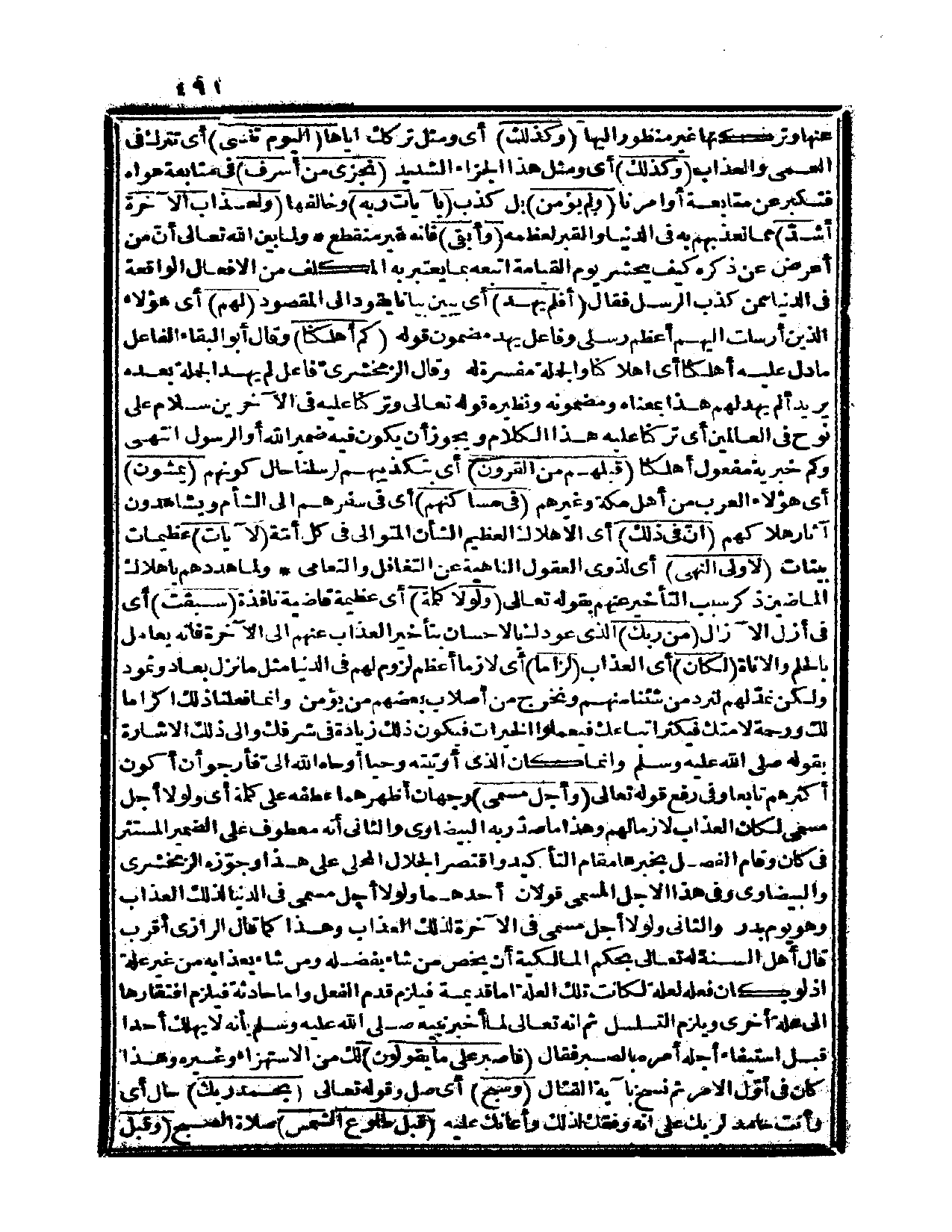 {ولولا كلمة} أي: عظيمة قاضية نافذة {سبقت} أي: في أزل الآزال {من ربك} الذي عودك بالإحسان بتأخير العذاب عنهم إلى الآخرة فإنه يعامل بالحلم والأناة {لكان} أي: العذاب {لزاماً} أي: لازماً أعظم لزوم لهم في الدنيا مثل ما نزل بعاد وثمود، ولكن نمدُّ لهم لنرد من شئنا منهم، ونخرج من أصلاب بعضهم من يؤمن، وإنما فعلنا ذلك إكراماً لك ورحمة لأمتك، فيكثر أتباعك، فيعملوا الخيرات، فيكون ذلك زيادة في شرفك، وإلى ذلك الإشارة بقوله صلى الله عليه وسلم «وإنما كان الذي أوتيته وحياً أوحاه الله إليَّ، فأرجو أن أكون أكثرهم تابعاً» ، وفي رفع قوله تعالى {وأجل مسمى} وجهان؛ أظهرهما: عطفه على كلمة أي، ولولا أجل مسمى لكان العذاب لازماً لهم، وهذا ما صدَّر به البيضاوي، والثاني: أنه معطوف على الضمير المستتر في كان، وقام الفصل بخبرها مقام التأكيد، واقتصر الجلال المحلي على هذا، وجوَّزه الزمخشري والبيضاوي، وفي هذا الأجل المسمى قولان؛ أحدهما: ولولا أجل مسمى في الدنيا لذلك العذاب، وهو يوم بدر، والثاني: ولولا أجل مسمى في الآخرة لذلك العذاب، وهذا كما قال الرازي أقرب قال أهل السنة تعالى بحكم المالكية أن يخص من شاء بفضله، ومن شاء بعذابه من غير علة إذ لو كان فعله لعلة لكانت تلك العلة إما قديمة، فيلزم قدم الفعل، وإما حادثة، فيلزم افتقارها إلى علة أخرى، ويلزم التسلسل، ثم إنه تعالى لما أخبر نبيه صلى الله عليه وسلم بأنه لا يهلك أحداً قبل استيفاء أجله أمره بالصبر، فقال: