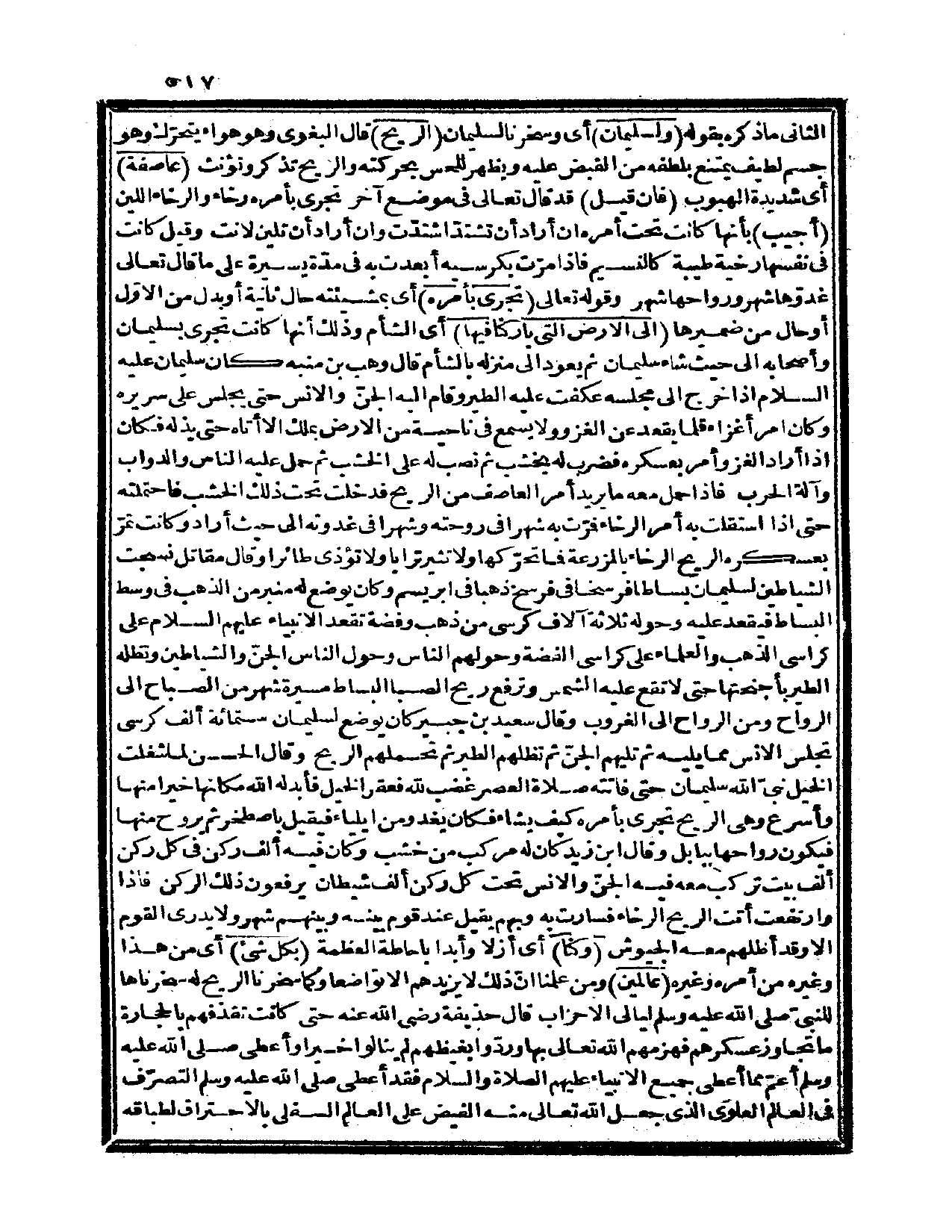وقال مقاتل: نسجت الشياطين لسليمان بساطاً فرسخاً في فرسخ ذهباً في إبريسم، وكان يوضع له منبر من الذهب في وسطه البساط، فيقعد عليه وحوله ثلاثة آلاف كرسي من ذهب وفضة تقعد الأنبياء عليهم السلام على كراسي الذهب، والعلماء على كراسي الفضة وحولهم الناس وحول الناس الجنّ والشياطين، وتظله الطير بأجنحتها حتى لا تقع عليه الشمس وترفع ريح الصبا البساط مسيرة شهر من الصباح إلى الرواح، ومن الرواح إلى الغروب.