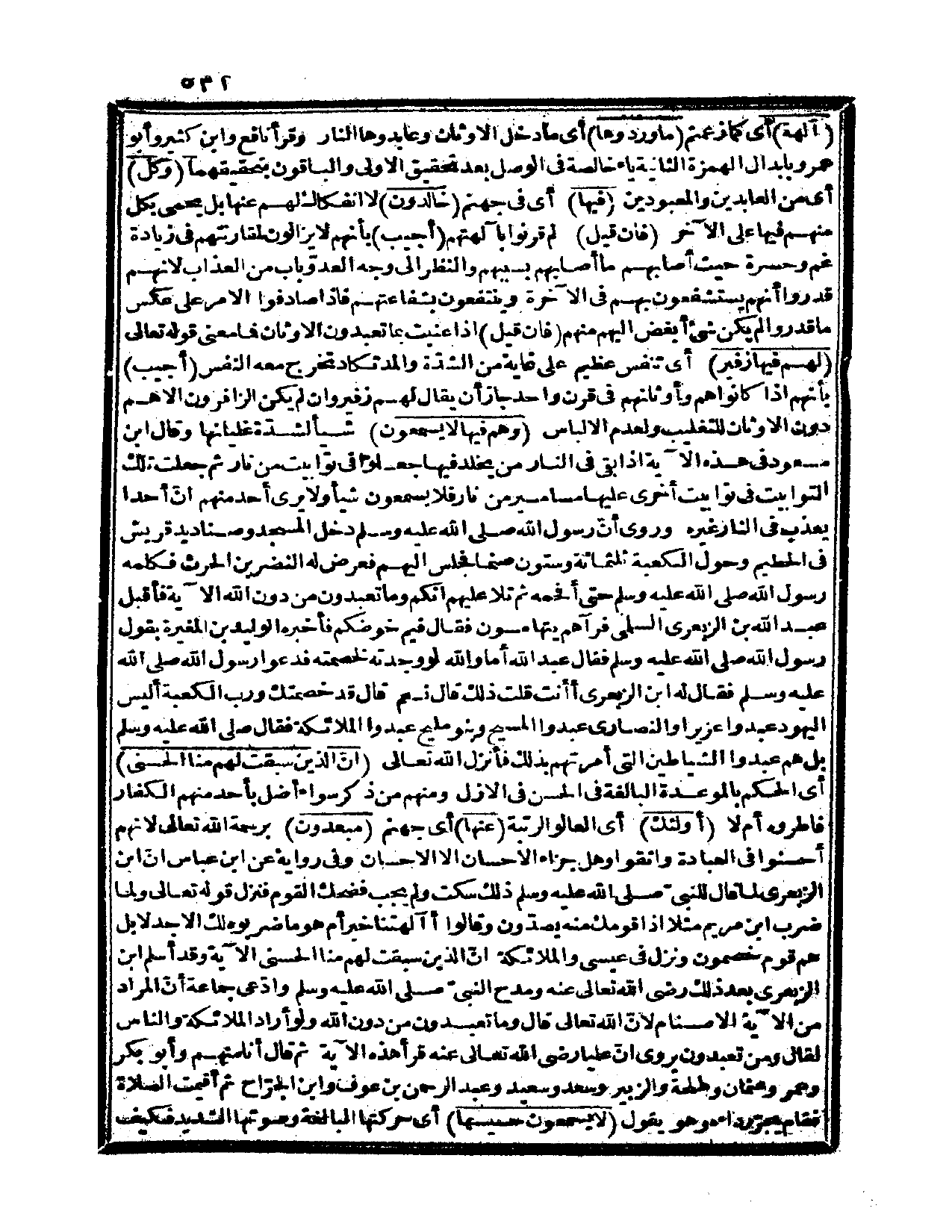 {لهم فيها زفير} أي: تنفس عظيم على غاية من الشدّة والمد تكاد تخرج معه النفس؟ أجيب: بأنهم إذا كانوا هم وأوثانهم في قرن واحد جاز أن يقال لهم: زفير، وإن لم يكن الزافرون إلا هم دون الأوثان للتغليب ولعدم الإلباس {وهم فيها لا يسمعون} شيئاً لشدّة غليانها، وقال ابن مسعود في هذه الآية: إذا بقي في النار من يخلد فيها جعلوا في توابيت من نار، ثم جعلت تلك التوابيت في توابيت أخرى عليها مسامير من نار فلا يسمعون شيئاً، ولا يرى أحد منهم أنّ أحداً يعذب في النار غيره، وروي «أن رسول الله صلى الله عليه وسلم دخل المسجد وصناديد قريش في الحطيم وحول الكعبة ثلاثمائة وستون صنماً فجلس إليهم، فعرض له النضر بن الحارث فكلمه رسول الله صلى الله عليه وسلم حتى أفحمه، ثم تلا عليهم إنكم وما تعبدون من دون الله الآية، فأقبل عبد الله بن الزبعري السلمي، فرآهم يتهامسون فقال: فيم خوضكم، فأخبره الوليد بن المغيرة بقول رسول الله صلى الله عليه وسلم فقال عبد الله: أما والله لو وجدته لخصمته، فدعوا رسول الله صلى الله عليه وسلم فقال له ابن الزبعري: أأنت قلت ذلك؟ قال: نعم، قال: قد خصمتك ورب الكعبة أليس اليهود عبدوا عزيراً والنصارى عبدوا المسيح، وبنو مليح عبدوا الملائكة، فقال صلى الله عليه وسلم بل هم عبدوا الشياطين التي أمرتهم بذلك، فأنزل الله تعالى: