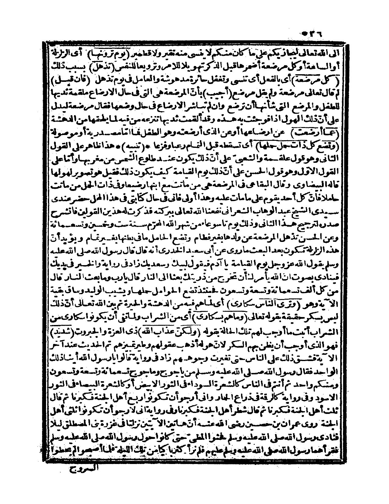 تنبيه: هذا ظاهر على القول الثاني وهو قول علقمة والشعبيّ على أنّ ذلك يكون عند طلوع الشمس من مغربها، وأمّا على القول الأوّل وهو قول الحسن على أنّ ذلك يوم القيامة كيف يكون ذلك؟ فقيل: هو تصوير لهولها، قاله البيضاوي، وقال البقاعي في المرضعة: هي من ماتت مع ابنها رضيعاً، وفي ذات الحمل: من ماتت حاملاً، فإنّ كل أحد يقوم على ما مات عليه، وهذا أولى فإني في حال كتابتي في هذا المحل حضر عندي سيدي الشيخ عبد الوهاب الشعراني نفعنا الله تعالى ببركته، فذكرت له هذين القولين، فانشرح صدره لترجيح هذا الثاني، وذلك يوم تاسوعاء من شهر الله المحرّم سنة ست وخمسين وتسعمائة، وعن الحسن تذهل المرضعة عن ولدها بغير فطام، وتضع الحامل ما في بطنها بغير تمام.