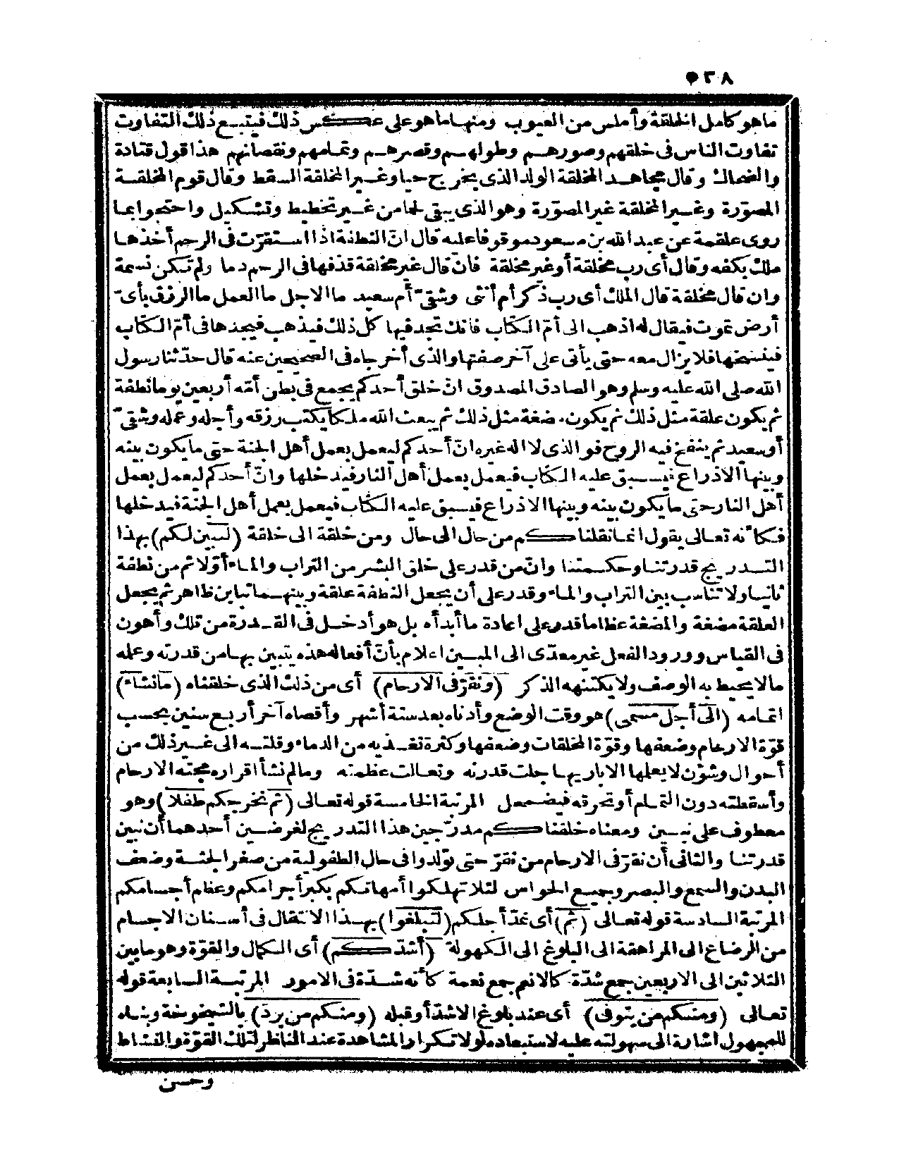 ما هو كامل الخلقة وأملس من العيوب ومنها ما هو على عكس ذلك فيتبع ذلك التفاوت تفاوت الناس في خلقهم وصورهم وطولهم وقصرهم وتمامهم ونقصانهم، هذا قول قتادة والضحاك، وقال مجاهد: المخلقة الولد الذي يخرج حياً وغير المخلقة السقط، وقال قوم: المخلقة المصوّرة وغير المخلقة غير المصوّرة، وهو الذي يبقى لحماً من غير تخطيط وتشكيل، واحتجوا بما روى علقمة عن عبد الله بن مسعود موقوفاً عليه قال: إن النطفة إذا استقرّت في الرحم أخذها ملك بكفه، وقال: أي رب مخلقة أو غير مخلقة، فإن قال: غير مخلقة قذفها في الرحم دماً، ولم تكن نسمة، وإن قال: مخلقة قال الملك: أي رب ذكر أم أنثى، وشقيّ أم سعيد، ما الأجل ما العمل ما الرزق بأي أرض تموت؟ فيقال له: اذهب إلى أمّ الكتاب فإنك تجد فيها كل ذلك فيذهب فيجدها في أمّ الكتاب فينسخها، فلا يزال معه حتى يأتي على آخر صفتها، والذي أخرجاه في الصحيحين عنه قال: حدّثنا رسول الله صلى الله عليه وسلم وهو الصادق المصدوق: «إن خلق أحدكم يجمع في بطن أمّه أربعين يوماً نطفه، ثم يكون علقة مثل ذلك، ثم يكون مضغة مثل ذلك، ثم يبعث الله ملكاً يكتب رزقه وأجله وعمله وشقيّ أو سعيد، ثم ينفخ فيه الروح، فوالذي لا إله غيره إنّ أحدكم ليعمل بعمل أهل الجنة حتى ما يكون بينه وبينها إلا ذراع فيسبق عليه الكتاب، فيعمل بعمل أهل النار فيدخلها، وإنّ أحدكم ليعمل بعمل أهل النار حتى ما يكون بينه وبينها إلا ذراع فيسبق عليه الكتاب، فيعمل بعمل أهل الجنة فيدخلها» فكأنه تعالى يقول: إنما نقلناكم من حال إلى حال، ومن خلقه إلى خلقة {لنبيّن لكم} بهذا التدريج