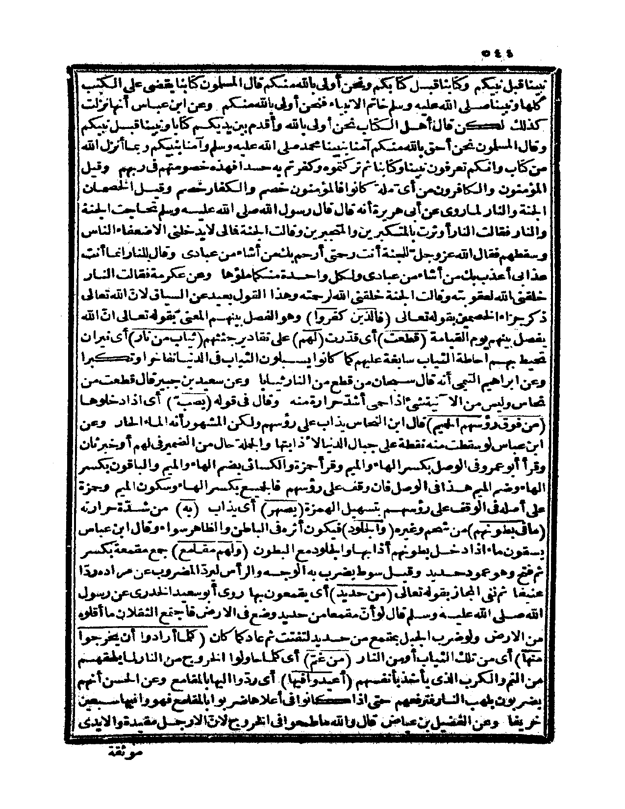 عبادي ولكل واحدة منكما ملؤها» وعن عكرمة فقالت النار خلقني الله لعقوبته وقال الجنة خلقني الله لرحمته وهذا القول بعيد عن لاسياق لأنّ الله تعالى ذكر جزاء الخصمين بقوله تعالى: {فالذين كفروا} وهو الفصل بينهم المعني بقوله تعالى: {إنّ الله يفصل بينهم يوم القيامة} {قطعت} أي: قدّرت {لهم} على تقادير جثثهم {ثبات من نار} أي: نيران تحيط بهم إحاطة الثياب سابغة عليهم كما كانوا يسبلون الثياب في الدنيا تفاخراً وتكبراً وعن إبراهيم التيمي أنه قال: سبحان من قطع من النار ثياباً. وعن سعيد بن جبير قال: قطعت من نحاس وليس من الآنية شيء إذا حمى أشدّ حرارة منه. وقال في قوله: {يصبّ} أي: ادخلوها {من فوق رؤوسهم الحميم} قال ابن النحاس يذاب على رؤوسهم ولكن المشهور أنه الماء الحار وعن ابن عباس: لو سقطت منه نقطة على جبال الدنيا لأذابتها، والجملة حال من الضمير في لهم، أو خبر ثان وقرأ أبو عمرو في الوصل بكسر الهاء والميم وقرأ حمزة والكسائي بضم الهاء والميم والباقون بكسر الهاء وضم الميم هذا في الوصل، فإن وقف على رؤوسهم فالجميع بكسر الهاء وسكون الميم وحمزة على أصله في الوقف على رؤوسهم بتسهيل الهمزة {يصهر} أي: يذاب {به} من شدّة حرارته {ما في بطونهم} من شحم وغيره {والجلود} فيكون أثره في الباطن والظاهر سواء وقال ابن عباس يسقون ماء إذا دخل بطونهم أذابها والجلود مع البطون {ولهم مقامع} جمع مقمعة بكسر ثم فتح وهو عمود حديد وقيل: سوط يضرب به الوجه والرأس ليردّ المضروب عن مراده ردّا عنيفاً ثم نفي المجاز بقوله تعالى: {من حديد} أي: يقمعون بها روى أبو سعيد الخدري عن رسول الله صلى الله عليه وسلم قال لو أنّ مقمعاً من حديد وضع في الأرض فاجتمع الثقلان ما أقلوه من الأرض ولو ضرب الجبل بمقمع من حديد لتفتت ثم عاد كما كان {كلما أرادوا أن يخرجوا منها} أي: من تلك الثياب أو من النار {من غمّ} أي: كلما حاولوا الخروج من النار