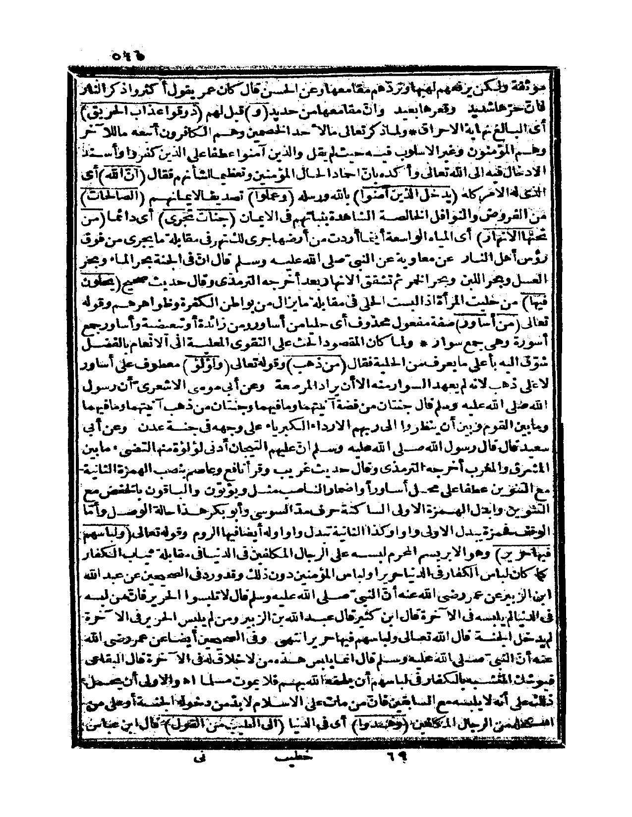 ولما كان المقصود الحث على التقوى المعلية إلى الإنعام بالفضل شوّق إليه بأعلى ما يعرف من الحلية فقال {من ذهب} وقوله تعالى: {ولؤلؤ} معطوف على أساور لا على ذهب لأنه لم يعهد السوار منه إلا أن يراد المرصعة وعن أبي موسى الأشعري أن رسول الله صلى الله عليه وسلم قال: «جنتان من فضة آنيتهما وما فيهما وجنتان من ذهب آنيتهما وما فيهما وما بين القوم وبين أن ينظروا إلى ربهم إلا رداء الكبرياء على وجهه في جنة عدن» وعن أبي سعيد قال: قال رسول الله صلى الله عليه وسلم «إنّ عليهم التيجان أدنى لؤلؤة منها لتضىء ما بين المشرق والمغرب» أخرجه الترمذي وقال: حديث غريب وقرأ نافع وعاصم بنصب الهمزة الثانية مع التنوين عطفاً على محل أساور أو إضمار الناصب مثل ويؤتون والباقون بالخفض مع التنوين وأبدل الهمزة الأولى الساكنة حرف مدّ السوسي وأبو بكر هذا حالة الوصل، وأمّا الوقف فحمزة يبدل الأولى واواً وكذا الثانية تبدل واواً له أيضاً فيها الرَّوْم وقوله تعالى: {ولباسهم فيها حرير} وهو الإبريسم المحرم لبسه على الرجال المكلفين في الدنيا في مقابلة ثياب الكفار كما كان لبسا الكفار في الدنيا حريراً ولباس المؤمنين دون ذلك، وقد ورد في الصحيحين عن عبد الله ابن الزبير عن عمر رضي الله عنه أنّ النبيّ صلى الله عليه وسلم قال «لا تلبسوا الحرير فإنّ من لبسه في الدنيا لم يلبسه في الآخرة»