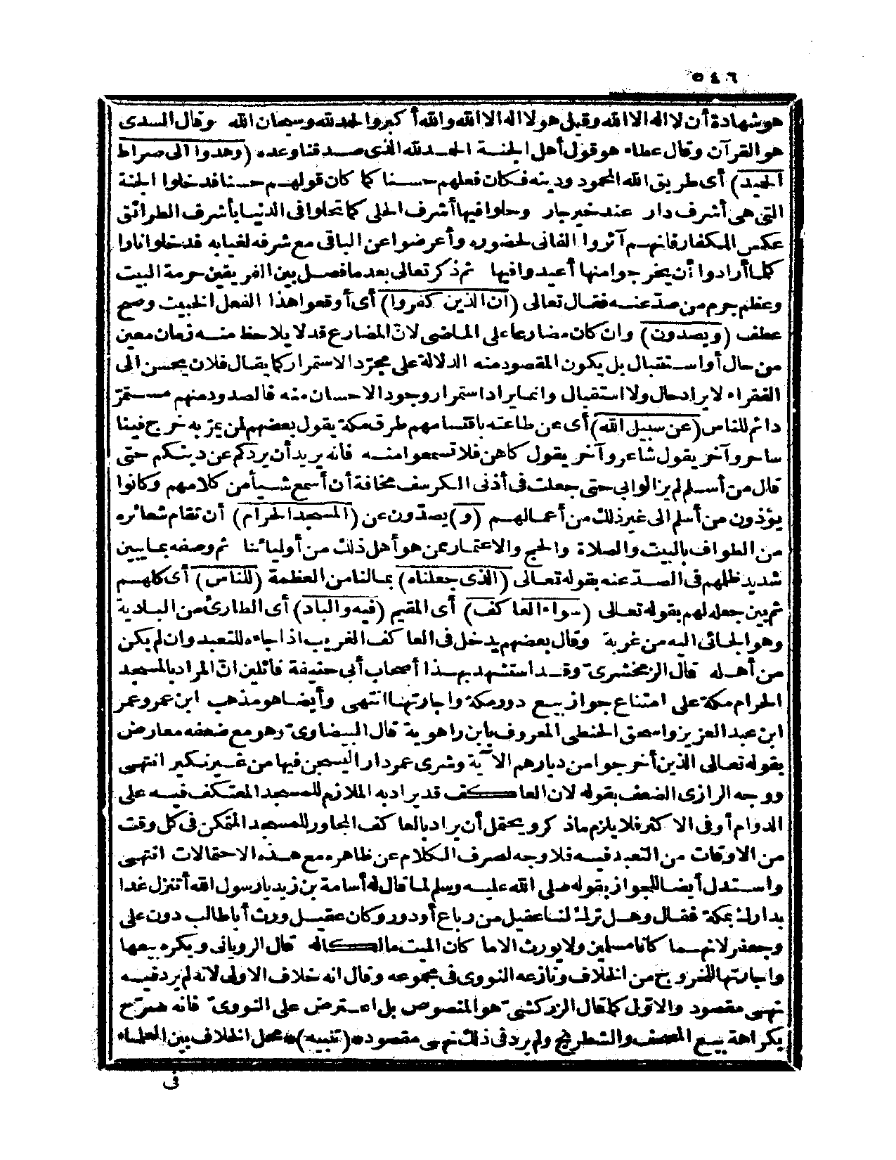 شيئاً من كلامهم وكانوا يؤذون من أسلم إلى غير ذلك من أعمالهم {و} يصدّون عن {المسجد الحرام} أن تقام شعائره من الطواف بالبيت، والصلاة، والحج، والاعتمار ممن هو أهل ذلك من أوليائنا، ثم وصفه بما يبين شديد ظلمهم في الصدّ عنه بقوله تعالى: {الذين جعلناه} بما لنا من العظمة {للناس} أي: كلهم ثم بين جعله لهم بقوله تعالى: {سواء العاكف} أي: المقيم {فيه والباد} أي: الطارىء من البادية وهو الجائي إليه من غربة، وقال بعضهم: يدخل في العاكف الغريب إذا جاءه للتعبد وإن لم يكن من أهله قال الزمخشري: وقد استشهد بهذا أصحاب أبي حنيفة قائلين إنّ المراد بالمسجد الحرام مكة على امتناع جواز بيع دور مكة وإجارتها انتهى. وأيضاً هو مذهب ابن عمر وعمر ابن عبد العزيز وإسحاق الحنطي المعروف بابن راهويه قال البيضاويّ وهو مع ضعفه معارض بقوله تعالى: {الذين أخرجوا من ديارهم} الآية. وشرى عمر داراً ليسجن فيها من غير نكير انتهى ووجه الرازي الضعيف بقوله: لأن العاكف قد يراد به الملازم للمسجد المعتكف فيه على الدوام أو في الأكثر فلا يلزم ما ذكر ويحتمل أن يراد بالعاكف المجاور للمسجد المتمكن في كل وقت من الأوقات من التعبد فيه فلا وجه لصرف الكلام عن ظاهره مع هذه الاحتمالات انتهى واستدل أيضاً للجواز بقوله صلى الله عليه وسلم لما قال له أسامة بن زيد «يا رسول الله أتنزل غداً بدارك بمكة فقال وهل ترك لنا عقيل من رباع أو دور» وكان عقيل ورث أبا طالب دون علي وجعفر لأنهما كانا مسلمين ولا يورث إلا ما كان الميت مالكاً له قال الروياني: ويكره بيعها وإجارتها للخروج من الخلاف ونازعه النووي في مجموعه وقال: إنه خلاف الأولى لأنه لم يرد فيه نهي مقصود والأوّل كما قال الزركشيّ هو المنصوص بل اعترض على النوويّ فإنه صرّح بكراه بيع المصحف والشطرنج ولم يرد في ذلك نهي مقصود.