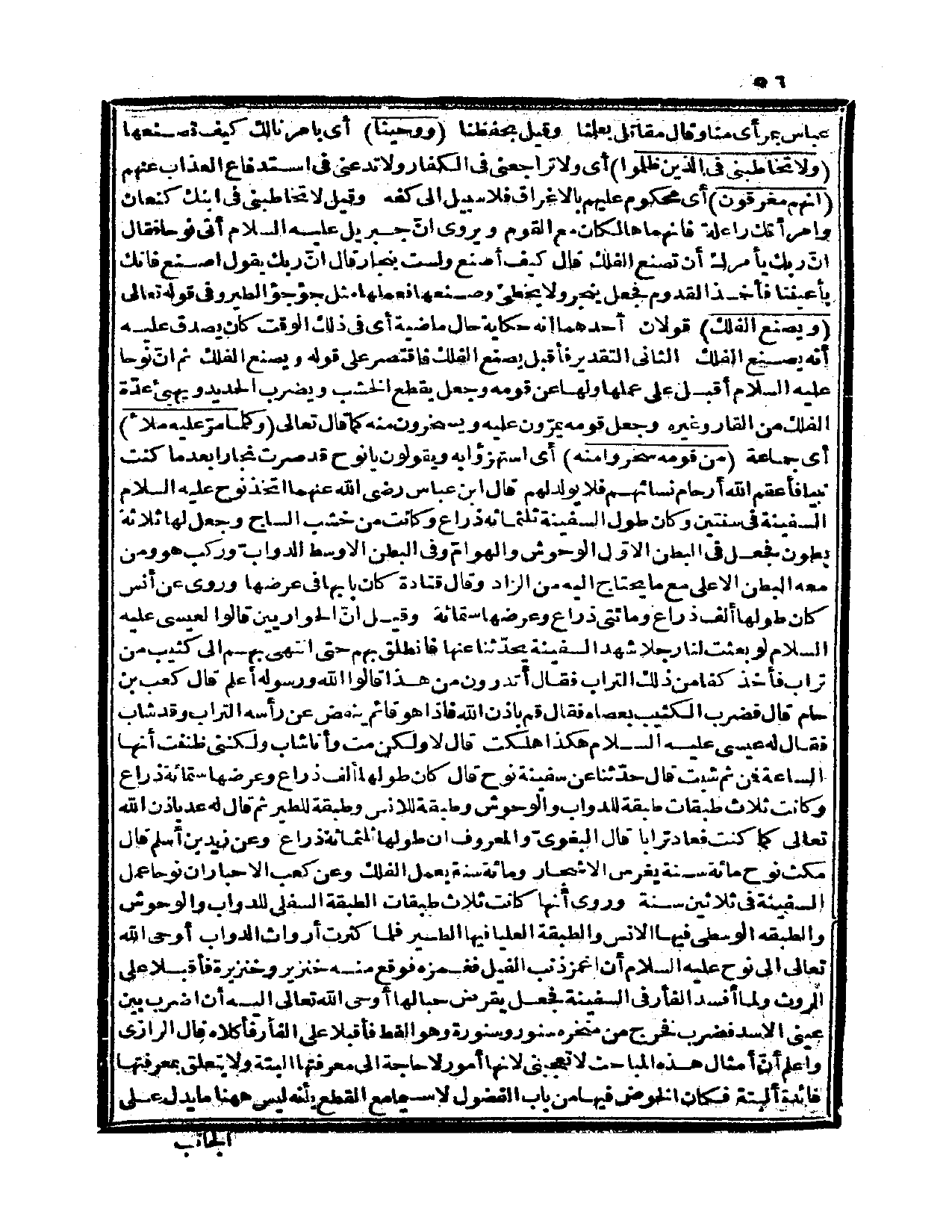 وعن كعب الأحبار: أنّ نوحاً عمل السفينة في ثلاثين سنة. وروي أنها كانت ثلاث طبقات: الطبقة السفلى للدواب والوحوش، والطبقة الوسطى فيها الإنس، والطبقة العليا فيها الطير، فلما كثرت أرواث الدواب أوحى الله تعالى إلى نوح عليه السلام أن اغمز ذنب الفيل فغمزه فوقع منه خنزير وخنزيرة فأقبلا على الروث، ولما أفسد الفأر في السفينة فجعل يقرض حبالها؛ أوحى الله تعالى إليه أن اضرب بين عيني الأسد فضرب فخرج من منخره سنور وسنورة وهو القط فأقبلا على الفأر فأكلاه. قال الرزاي: واعلم أنّ أمثال هذه المباحث لا تعجبني لأنها أمور لا حاجة إلى معرفتها البتة، ولا يتعلق بمعرفتها فائدة البتة، فكان الخوض فيها من باب الفضول، لا سيما مع القطع بأنه ليس ههنا ما يدل على