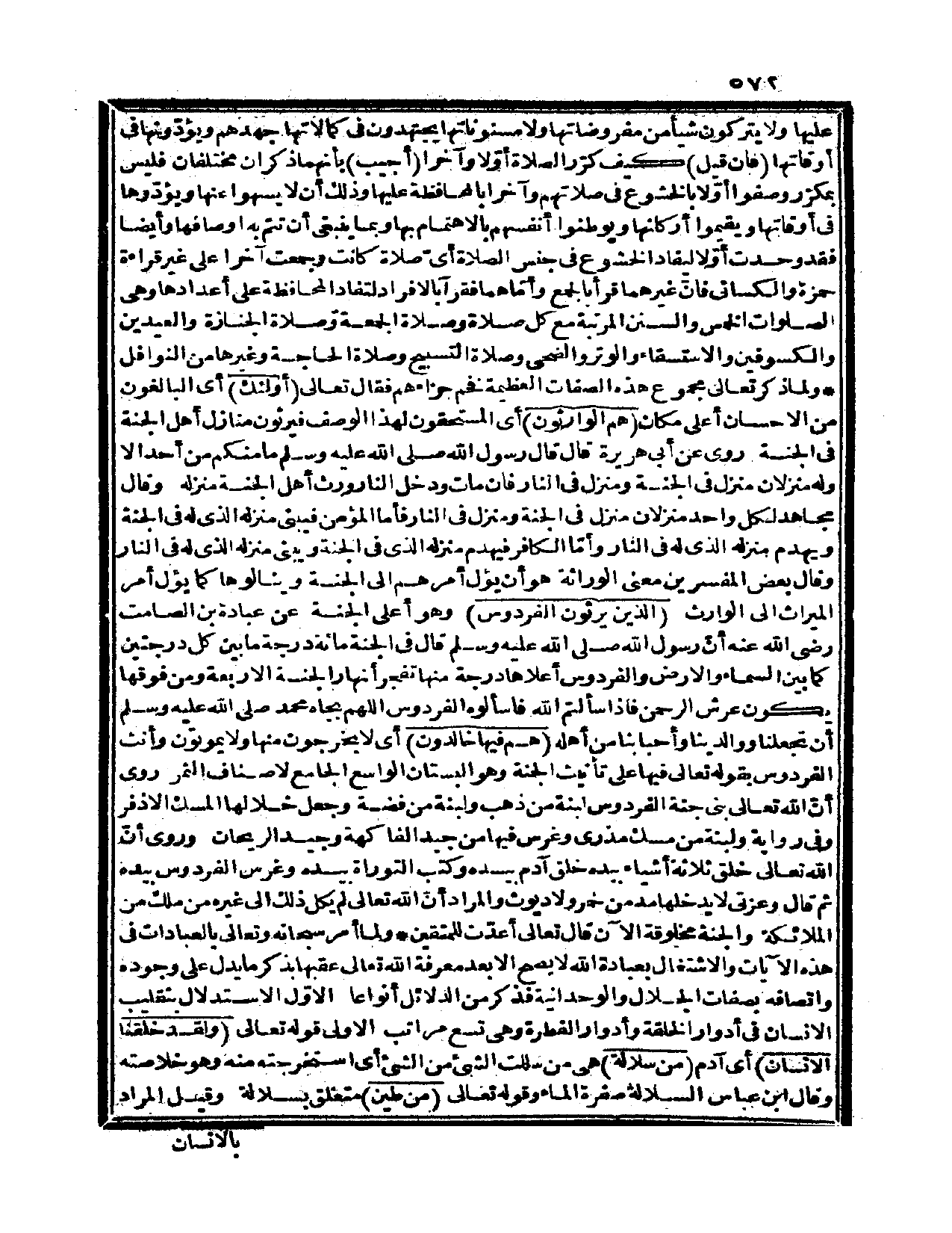 {الذين يرثون الفردوس} وهو أعلى الجنة، عن عبادة بن الصامت رضي الله عنه أنّ رسول الله صلى الله عليه وسلم قال: «في الجنة مائة درجة ما بين كل درجتين كما بين السماء والأرض، والفردوس أعلاها درجة، منها تفجر أنهار الجنة الأربعة ومن فوقها يكون عرش الرحمن، فإذا سألتم الله فاسألوه الفردوس» اللهمّ بجاه محمد صلى الله عليه وسلم أنّ تجعلنا ووالدينا وأحبابنا من أهله {هم فيها خالدون} أي: لا يخرجون منها ولا يموتون وأنث الفردوس بقوله تعالى: {فيها} ، على تأنيث الجنة، وهو البستان الواسع الجامع لأصناف الثمر، روي «أنّ الله تعالى بنى جنة الفردوس لبنة من ذهب ولبنة من فضة، وجعل خلالها المسك الإذفر ـ وفي رواية: ولبنة من مسك مذرى ـ وغرس فيها من جيد الفاكهة وجيد الريحان» ، وروي «أنّ الله تعالى خلق ثلاثة أشياء بيده خلق آدم بيده وكتب التوراة بيده، وغرس الفردوس بيده، ثم قال: وعزتي لا يدخلها مدمن خمر ولا ديوث» ، والمراد أنّ الله تعالى لم يكل ذلك إلى غيره من ملك من الملائكة، والجنة مخلوقة الآن؛ قال تعالى: {أعدت للمتقين} (آل عمران، 133) ، ولما أمر سبحانه وتعالى بالعبادات في هذه الآيات والاشتغال بعبادة الله لا يصح إلا بعد معرفة الله تعالى عقبها بذكر ما يدل على وجوده واتصافه بصفات الجلال والوحدانية فذكر من الدلائل أنواعاً: