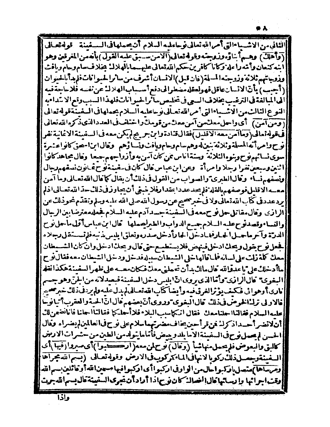 فيه، وأيضاً كتاب الله تعالى لم يدل عليه ولم يرد في ذلك خبر صحيح فالأولى ترك الخوض في ذلك. قال البغويّ: وروي أنّ بعضهم قال: إنّ الحية والعقرب أتيا نوحاً عليه السلام فقالتا احملنا معك، فقال: إنكما سبب البلاء فلا أحملكما فقالتا: احملنا فإنا نضمن لك أن لا نضر أحداً ذكرك. فمن قرأ حين يخاف مضرتهما {سلام على نوح في العالمين} (الصافات، 79) لم يضراه. وقال الحسن: لم يحمل نوح في السفينة إلا ما يلد ويبيض، فأمّا ما يتولد من الطين من حشرات الأرض كالبق والبعوض فلم يحمل منها شيئاً.