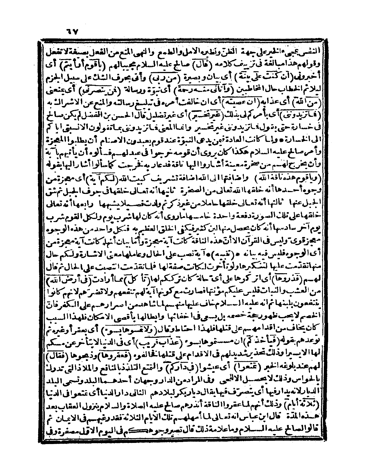 إلى الخسارة. ولما كانت العادة فيمن يدعي النبوّة عند قوم يعبدون الأصنام أن يطلبوا المعجزة وأمر صالح عليه السلام. هكذا كان يروى أن قومه خرجوا في عيد لهم فسألوه أن يأتيهم بآية وأن يخرج لهم من صخرة معينة أشاروا إليها ناقة، فدعا ربه فخرجت كما سألوا. أشار إليها بقوله: {ويا قوم هذه ناقة الله} وإضافتها إلى الله إضافة تشريف كبيت الله {لكم آية} ، أي: معجزة من وجوه: أحدها: أنه خلقها الله تعالى من الصخرة. ثانيها: أنه تعالى خلقها في جوف الجبل ثم شق الجبل عنها. ثالثها: أنه تعالى خلقها حاملاً من غير ذكر ثم ولدت فصيلاً يشبهها. رابعها: أنه تعالى خلقها على تلك الصورة دفعة واحدة. خامسها: ما روي أنه كان لها شرب يوم ولكل القوم شرب يوم آخر. سادسها: أنه كان يحصل منها لبن كثير فيكفي الخلق العظيم به، فكل واحد من هذه الوجوه معجز قويّ، وليس في القرآن إلا أنّ هذه الناقة كانت آية معجزة، وأمّا بيان أنها كانت آية معجزة من أي الوجوه فليس فيه بيانه.