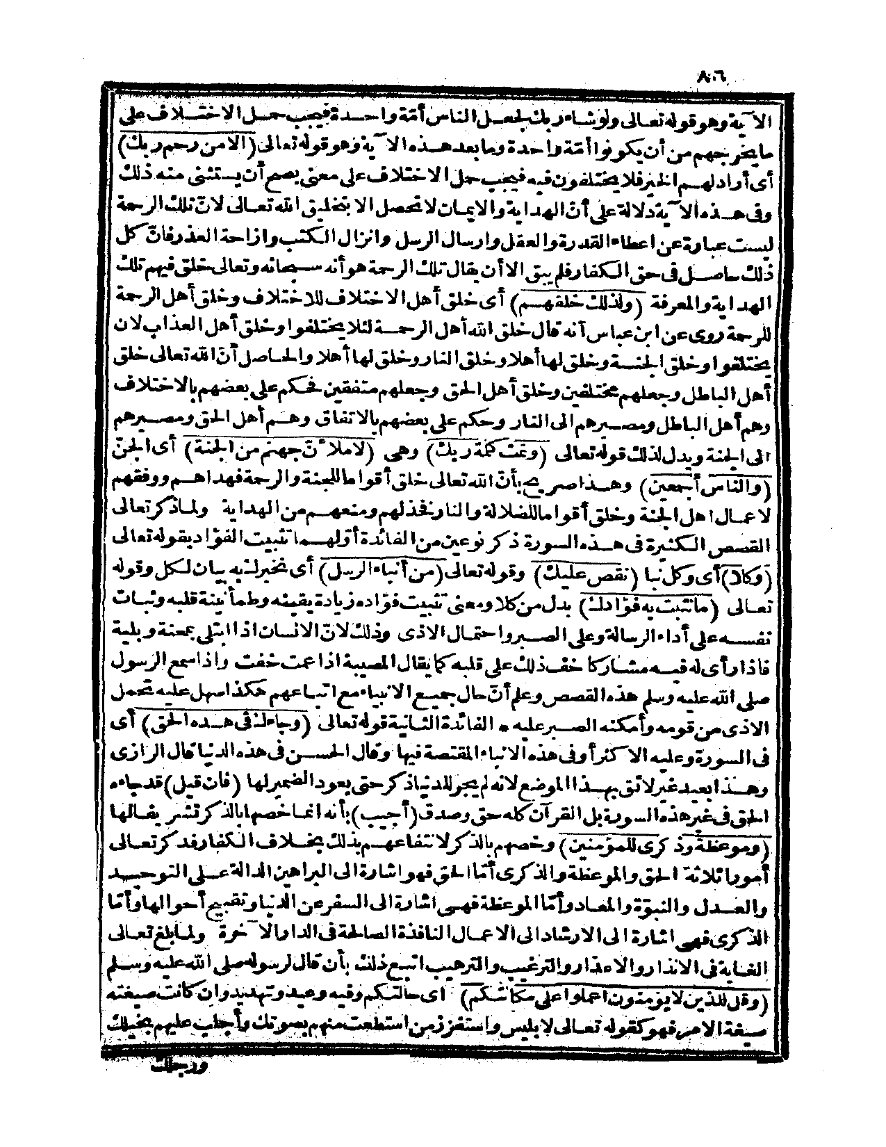 الآية وهو قوله تعالى: {ولو شاء ربك لجعل الناس أمّة واحدة} (هود، 118) فيجب حمل الاختلاف على ما يخرجهم من أن يكونوا أمّة واحدة وما بعد هذه الآية وهو قوله تعالى: {إلا من رحم ربك} ، أي: أراد لهم الخير فلا يختلفون فيه، فيجب حمل الاختلاف على معنى يصح أن يستثنى منه ذلك، وفي هذه الآية دلالة على أنّ الهداية والإيمان لا تحصل إلا بتخليق الله تعالى؛ لأنّ تلك الرحمة ليست عبارة عن إعطاء القدرة والعقل وإرسال الرسل وإنزال الكتب وإزاحة العذر، فإنّ كل ذلك حاصل في حق الكفار فلم يبق إلا أن يقال: تلك الرحمة هو أنه سبحانه وتعالى خلق فيهم تلك الهداية والمعرفة {ولذلك خلقهم} ، أي: خلق أهل الاختلاف للاختلاف، وخلق أهل الرحمة للرحمة. روي عن ابن عباس أنه قال: خلق الله أهل الرحمة لئلا يختلفوا، وخلق أهل العذاب لأن يختلفوا، وخلق الجنة وخلق لها أهلاً، وخلق النار وخلق لها أهلاً، والحاصل: أنّ الله تعالى خلق أهل الباطل وجعلهم مختلفين، وخلق أهل الحق وجعلهم متفقين، فحكم على بعضهم بالاختلاف وهم أهل الباطل ومصيرهم إلى النار، وحكم على بعضهم بالاتفاق وهم أهل الحق ومصيرهم إلى الجنة، ويدل لذلك قوله تعالى: {وتمت كلمة ربك} وهي {لأملأنّ جهنم من الجنة} ، أي: الجنّ {والناس أجمعين} وهذا صريح بأنّ الله تعالى خلق أقواماً للجنة والرحمة فهداهم ووفقهم لأعمال أهل الجنة، وخلق أقواماً للضلالة والنار فخذلهم ومنعهم من الهداية، ولما ذكر تعالى القصص الكثيرة في هذه السورة ذكر نوعين من الفائدة أوّلهما تثبيت الفؤاد بقوله تعالى: