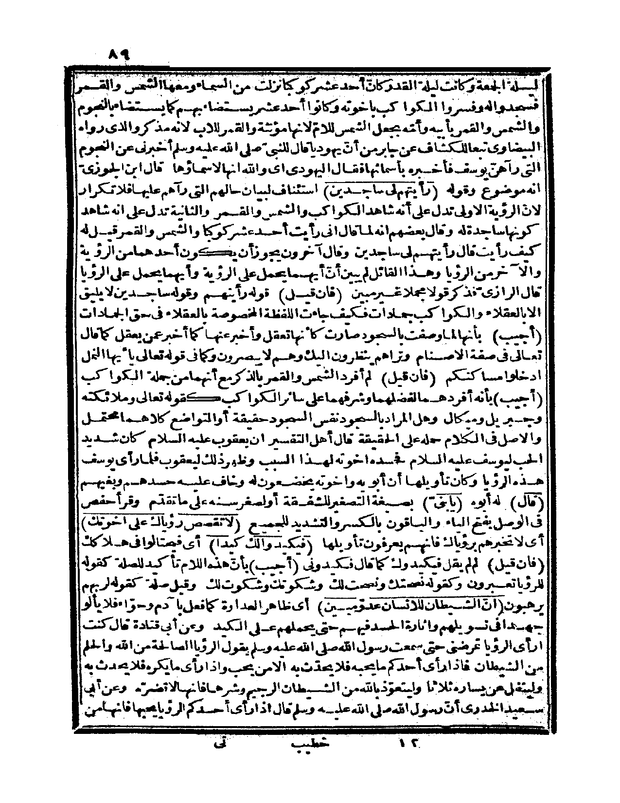 ليلة الجمعة، وكانت ليلة القدر كأنّ أحد عشر كوكباً نزلت من السماء ومعها الشمس والقمر، فسجدوا له وفسروا الكواكب بإخوته، وكانوا أحد عشر يستضاء بهم كما يستضاء بالنجوم، والشمس والقمر بأبيه وأمّه بجعل الشمس للأمّ؛ لأنها مؤنثة والقمر للأب؛ لأنه مذكر. والذي رواه البيضاوي تبعاً «للكشاف» عن جابر من أنّ يهودياً قال للنبيّ صلى الله عليه وسلم أخبرني عن النجوم التي رآهن يوسف فأخبره بأسمائها فقال اليهودي:، أي: والله إنها لأسماؤها. قال ابن الجوزي: إنه موضوع، وقوله: {رأيتهم لي ساجدين} استئناف لبيان حالهم التي رآهم عليها فلا تكرار؛ لأنّ الرؤية الأولى تدل على أنه شاهد الكواكب والشمس والقمر والثانية تدل على أنه شاهد كونها ساجدة له.