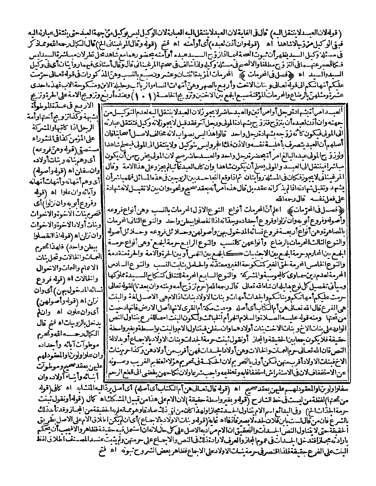 قَالَ - رَحِمَهُ اللَّهُ - (فَصْلٌ فِي الْمُحَرَّمَاتِ) اعْلَمْ أَنَّ الْمُحَرَّمَاتِ أَنْوَاعٌ النَّوْعُ الْأَوَّلُ الْمُحَرَّمَاتُ بِالنَّسَبِ وَهُنَّ أَنْوَاعٌ فُرُوعُهُ وَأُصُولُهُ وَفُرُوعُ أَبَوَيْهِ وَإِنْ نَزَلُوا وَفُرُوعُ أَجْدَادِهِ وَجَدَّاتِهِ إذَا انْفَصَلُوا بِبَطْنٍ وَاحِدٍ، وَالنَّوْعُ الثَّانِي: الْمُحَرَّمَاتُ بِالْمُصَاهَرَةِ، وَهُنَّ أَنْوَاعٌ أَرْبَعَةٌ فُرُوعُ نِسَائِهِ الْمَدْخُولِ بِهِنَّ وَأُصُولُهُنَّ وَحَلَائِلُ فُرُوعِهِ وَحَلَائِلُ أُصُولِهِ وَالنَّوْعُ الثَّالِثُ الْمُحَرَّمَاتُ بِالرَّضَاعِ وَأَنْوَاعُهُنَّ كَالنَّسَبِ وَالنَّوْعُ الرَّابِعُ حُرْمَةُ الْجَمْعِ، وَهِيَ أَنْوَاعٌ حُرْمَةُ الْجَمْعِ بَيْنَ الْمَحَارِمِ، وَحُرْمَةُ الْجَمْعِ بَيْنَ الْأَجْنَبِيَّاتِ كَالْجَمْعِ بَيْنَ الْخَمْسِ أَوْ بَيْنَ الْحُرَّةِ وَالْأَمَةِ، وَالْحُرَّةُ مُتَقَدِّمَةٌ، وَالنَّوْعُ الْخَامِسُ: الْمُحَرَّمَةُ لِحَقِّ الْغَيْرِ كَمَنْكُوحَةِ الْغَيْرِ وَمُعْتَدَّتِهِ وَالْحَامِلِ بِثَابِتِ النَّسَبِ، وَالنَّوْعُ السَّادِسُ الْمُحَرَّمَةُ لِعَدَمِ دِينٍ سَمَاوِيٍّ كَالْمَجُوسِيَّةِ وَالْمُشْرِكَةِ، وَالنَّوْعُ السَّابِعُ الْمُحَرَّمَةُ لِلتَّنَافِي كَنِكَاحِ السَّيِّدَةِ مَمْلُوكَهَا وَسَيَأْتِي تَفْصِيلُ كُلِّ نَوْعٍ بِدَلِيلِهِ إنْ شَاءَ اللَّهُ - تَعَالَى - قَالَ - رَحِمَهُ اللَّهُ - (حَرُمَ تَزَوُّجُ أُمِّهِ وَبِنْتِهِ وَإِنْ بَعُدَتَا) لِقَوْلِهِ تَعَالَى {حُرِّمَتْ عَلَيْكُمْ أُمَّهَاتُكُمْ وَبَنَاتُكُمْ} [النساء: 23] وَالْجَدَّاتُ أُمَّهَاتٌ وَبَنَاتُ الْأَوْلَادِ بَنَاتٌ؛ إذْ الْأُمُّ هِيَ الْأَصْلُ لُغَةً، وَالْبِنْتُ هِيَ الْفَرْعُ قَالَ اللَّهُ تَعَالَى {هُنَّ أُمُّ الْكِتَابِ} [آل عمران: 7] أَيْ أَصْلُهُ وَسُمِّيَتْ مَكَّةُ أُمَّ الْقُرَى؛ لِأَنَّهَا أَصْلُ الْأَرْضِ فَإِنَّهَا دُحِيَتْ مِنْ تَحْتِهَا، وَمِنْهُ قَوْلُهُ - عَلَيْهِ الصَّلَاةُ وَالسَّلَامُ - «الْخَمْرُ أُمُّ الْخَبَائِثِ» وَلِكَوْنِ الْبِنْتِ اسْمًا لِلْفَرْعِ يَتَنَاوَلُ النَّصُّ الْوَارِدُ عَلَى بَنَاتِ الْأَخِ وَبَنَاتِ الْأُخْتِ بَنَاتِ أَوْلَادِهِمَا وَإِنْ سَفَلْنَ فَيَتَنَاوَلُ الْأُمَّ وَالْبِنْتَ بِوَاسِطَةٍ وَبِغَيْرِ وَاسِطَةٍ حَقِيقَةً فَلَا يَكُونُ جَمْعًا بَيْنَ الْحَقِيقَةِ وَالْمَجَازِ أَوْ نَقُولُ: ثَبَتَتْ حُرْمَةُ الْجَدَّاتِ وَبَنَاتِ الْأَوْلَادِ بِالْإِجْمَاعِ أَوْ بِدَلَالَةِ النَّصِّ فَإِنَّ اللَّهَ - تَعَالَى - حَرَّمَ الْعَمَّاتِ وَالْخَالَاتِ، وَهُنَّ أَوْلَادُ الْجَدَّاتِ فَهُنَّ أَقْرَبُ مِنْ أَوْلَادِهِنَّ، وَكَذَا حَرَّمَ بَنَاتِ الْأَخِ فَبَنَاتُ الْأَوْلَادِ أَقْرَبُ مِنْهُنَّ فَكُنَّ أَوْلَى بِالتَّحْرِيمِ؛ لِأَنَّ الْحِكْمَةَ فِي تَحْرِيمِ هَؤُلَاءِ تَعْظِيمُ الْقَرِيبِ وَصَوْنُهُ عَنْ الِاسْتِخْفَافِ؛ لِأَنَّ فِي الِاسْتِفْرَاشِ اسْتِخْفَافًا بِهِ، وَتَعْظِيمُهُ وَاجِبٌ شَرْعًا وَلِأَنَّ نِكَاحَهُنَّ يُفْضِي إلَى قَطْعِ الرَّحِمِ