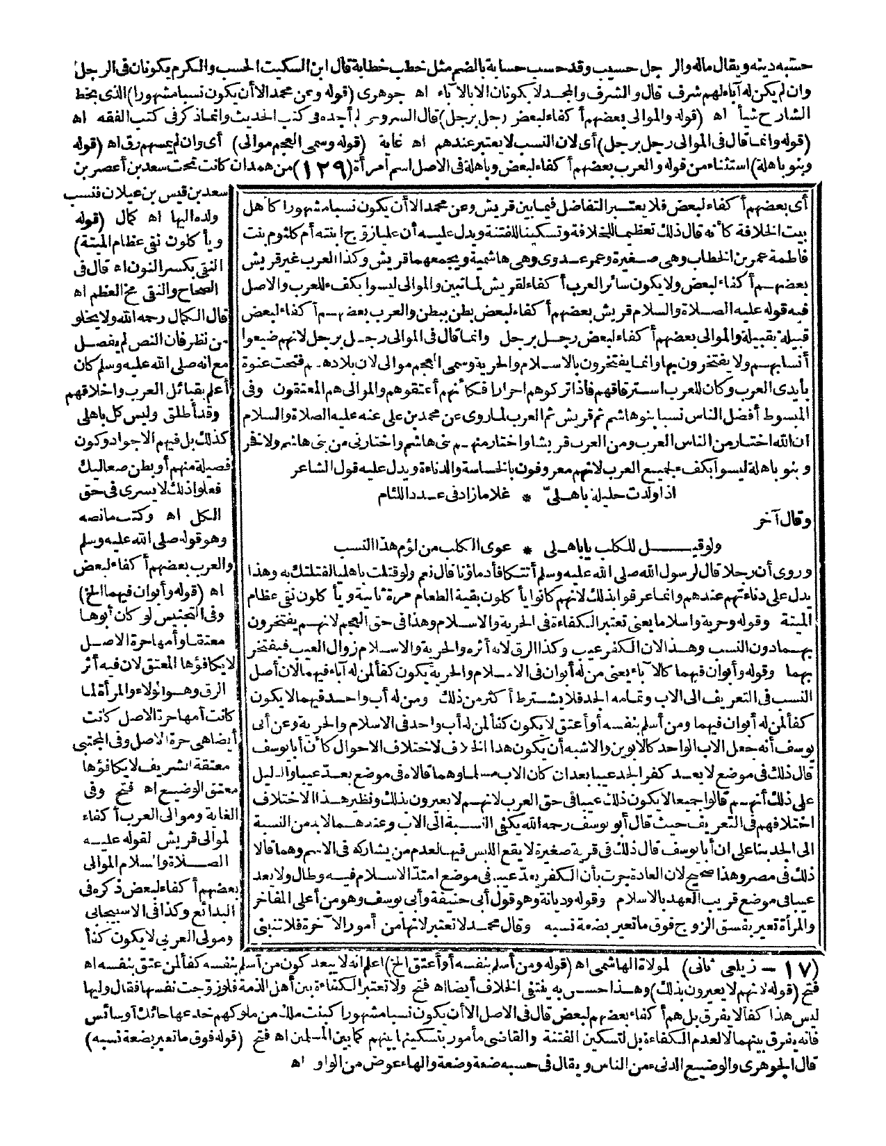 وَعَنْ مُحَمَّدٍ إلَّا أَنْ يَكُونَ نَسَبًا مَشْهُورًا كَأَهْلِ بَيْتِ الْخِلَافَةِ كَأَنَّهُ قَالَ ذَلِكَ تَعْظِيمًا لِلْخِلَافَةِ وَتَسْكِينًا لِلْفِتْنَةِ وَيَدُلُّ عَلَيْهِ أَنَّ عَلِيًّا زَوَّجَ ابْنَتَهُ أُمَّ كُلْثُومِ بِنْتَ فَاطِمَةَ عُمَرَ بْنَ الْخَطَّابِ وَهِيَ صَغِيرَةٌ وَعُمَرُ عَدَوِيٌّ وَهِيَ هَاشِمِيَّةٌ وَيَجْمَعُهُمَا قُرَيْشٌ، وَكَذَا الْعَرَبُ غَيْرُ قُرَيْشٍ بَعْضُهُمْ أَكْفَاءٌ لِبَعْضٍ وَلَا يَكُونُ سَائِرُ الْعَرَبِ أَكْفَاءً لِقُرَيْشٍ لِمَا تَبَيَّنَ، وَالْمَوَالِي لَيْسُوا بِكُفْءٍ لِلْعَرَبِ وَالْأَصْلُ فِيهِ قَوْلُهُ - عَلَيْهِ الصَّلَاةُ وَالسَّلَامُ -: «قُرَيْشٌ بَعْضُهُمْ أَكْفَاءٌ لِبَعْضٍ بَطْنٌ بِبَطْنٍ وَالْعَرَبُ بَعْضُهُمْ أَكْفَاءٌ لِبَعْضٍ قَبِيلَةٌ بِقَبِيلَةٍ وَالْمَوَالِي بَعْضُهُمْ أَكْفَاءٌ لِبَعْضٍ رَجُلٌ بِرَجُلٍ» وَإِنَّمَا قَالَ فِي الْمَوَالِي رَجُلٌ بِرَجُلٍ؛ لِأَنَّهُمْ ضَيَّعُوا أَنْسَابَهُمْ وَلَا يَفْتَخِرُونَ بِهَا وَإِنَّمَا يَفْتَخِرُونَ بِالْإِسْلَامِ وَالْحُرِّيَّةِ وَسُمِّيَ الْعَجَمُ مَوَالِيَ؛ لِأَنَّ بِلَادَهُمْ فُتِحَتْ عَنْوَةً بِأَيْدِي الْعَرَبِ وَكَانَ لِلْعَرَبِ اسْتِرْقَاقُهُمْ فَإِذَا تَرَكُوهُمْ أَحْرَارًا فَكَأَنَّهُمْ أَعْتَقُوهُمْ وَالْمَوَالِي هُمْ الْمُعْتَقُونَ