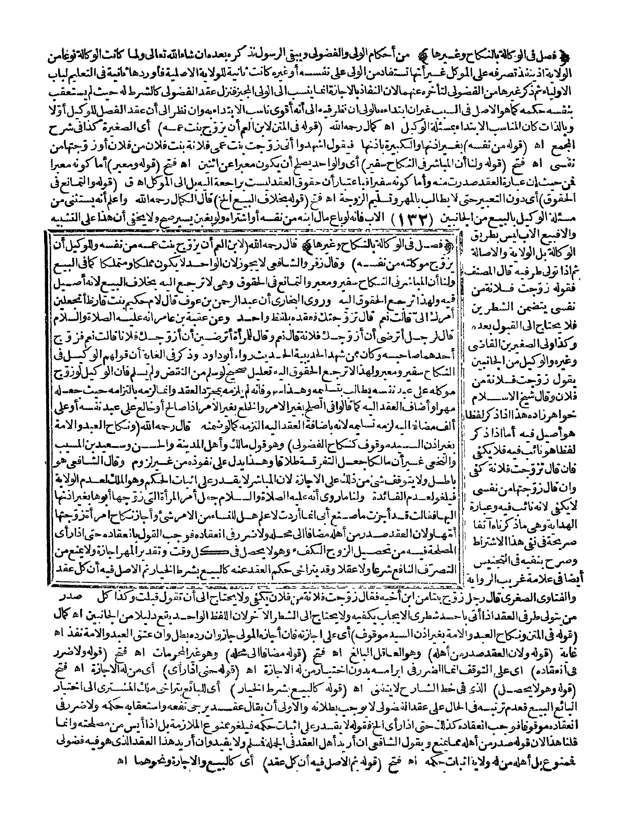مِنْ أَحْكَامِ الْوَلِيِّ وَالْفُضُولِيِّ وَيَبْقَى الرَّسُولُ نَذْكُرُهُ بَعْدَهُ إنْ شَاءَ اللَّهُ تَعَالَى وَلَمَّا كَانَتْ الْوَكَالَةُ نَوْعًا مِنْ الْوِلَايَةِ إذْ يَنْفُذُ تَصَرُّفُهُ عَلَى الْمُوَكِّلِ، غَيْرَ أَنَّهَا تُسْتَفَادُ مِنْ الْوَلِيِّ عَلَى نَفْسِهِ أَوْ غَيْرِهِ كَانَتْ ثَانِيَةً لِلْوِلَايَةِ الْأَصْلِيَّةِ فَأَوْرَدَهَا ثَانِيَةً فِي التَّعْلِيمِ لِبَابِ الْأَوْلِيَاءِ، ثُمَّ ذَكَرَ غَيْرَهَا مِنْ الْفُضُولِيِّ لِتَأَخُّرِهِ عَنْهُمَا؛ لِأَنَّ النَّفَاذَ بِالْإِجَازَةِ إنَّمَا يُنْسَبُ إلَى الْوَلِيِّ الْمُجِيزِ فَنَزَلَ عَقْدُ الْفُضُولِيِّ كَالشَّرْطِ لَهُ حَيْثُ لَمْ يَسْتَعْقِبْ بِنَفْسِهِ حُكْمَهُ كَمَا هُوَ الْأَصْلُ فِي السَّبَبِ غَيْرَ أَنَّ ابْتِدَاءَهُ بِالْوَلِيِّ إنْ نُظِرَ فِيهِ إلَى أَنَّهُ أَقْوَى نَاسَبَ الِابْتِدَاءَ بِهِ وَإِنْ نُظِرَ إلَى أَنَّ عَقْدَ الْفَصْلِ لِلْوَكِيلِ أَوْ لَا وَبِالذَّاتِ كَانَ الْمُنَاسِبُ الِابْتِدَاءَ بِمَسْأَلَةِ الْوَكِيلِ اهـ. كَمَالٌ - رَحِمَهُ اللَّهُ - (قَوْلُهُ فِي الْمَتْنِ: لِابْنِ الْعَمِّ أَنْ يُزَوِّجَ بِنْتَ عَمِّهِ) أَيْ الصَّغِيرَةَ كَذَا فِي شَرْحِ الْمَجْمَعِ اهـ. (قَوْلُهُ: مِنْ نَفْسِهِ) بِغَيْرِ إذْنِهَا فَيَقُولُ اشْهَدُوا أَنِّي زَوَّجْت بِنْتَ عَمِّي فُلَانَةَ بِنْتَ فُلَانٍ مِنْ فُلَانٍ أَوْ زَوَّجْتهَا مِنْ نَفْسِي. اهـ. فَتْحٌ. (قَوْلُهُ: وَلَنَا أَنَّ الْمُبَاشِرَ فِي النِّكَاحِ سَفِيرٌ) أَيْ وَالْوَاحِدُ يَصْلُحُ أَنْ يَكُونَ مُعَبِّرًا عَنْ اثْنَيْنِ اهـ. فَتْحٌ (قَوْلُهُ: وَمُعَبِّرٌ) أَمَّا كَوْنُهُ مُعَبِّرًا فَمِنْ حَيْثُ إنَّ عِبَارَةَ الْعَقْدِ صَدَرَتْ مِنْهُ وَأَمَّا كَوْنُهُ سَفِيرًا فَبِاعْتِبَارِ أَنَّ حُقُوقَ الْعَقْدِ لَيْسَتْ بِرَاجِعَةٍ إلَيْهِ بَلْ إلَى الْمُوَكِّلِ اهـ. ق (قَوْلُهُ: وَالتَّمَانُعُ فِي الْحُقُوقِ) أَيْ دُونَ التَّعْبِيرِ حَتَّى لَا يُطَالَبَ بِالْمَهْرِ وَتَسْلِيمِ الزَّوْجَةِ اهـ. فَتْحٌ (قَوْلُهُ: بِخِلَافِ الْبَيْعِ إلَخْ) قَالَ الْكَمَالُ - رَحِمَهُ اللَّهُ - وَاعْلَمْ أَنَّهُ يُسْتَثْنَى مِنْ مَسْأَلَةِ الْوَكِيلِ بِالْبَيْعِ مِنْ الْجَانِبَيْنِ الْأَبُ فَإِنَّهُ لَوْ بَاعَ مَالَ ابْنِهِ مِنْ نَفْسِهِ أَوْ اشْتَرَاهُ وَلَوْ بِغَبْنٍ يَسِيرٍ صَحَّ وَلَا يَخْفَى أَنَّ هَذَا عَلَى التَّشْبِيهِ وَإِلَّا فَبَيْعُ الْأَبِ لَيْسَ بِطَرِيقِ الْوَكَالَةِ بَلْ الْوِلَايَةُ وَالْأَصَالَةُ، ثُمَّ إذَا تَوَلَّى طَرَفَيْهِ قَالَ الْمُصَنِّفُ فَقَوْلُهُ: زَوَّجْت فُلَانَةَ مِنْ نَفْسِي يَتَضَمَّنُ الشَّطْرَيْنِ فَلَا يُحْتَاجُ إلَى الْقَبُولِ بَعْدَهُ، وَكَذَا وَلِيُّ الصَّغِيرَيْنِ الْقَاضِي وَغَيْرُهُ وَالْوَكِيلُ مِنْ الْجَانِبَيْنِ يَقُولُ زَوَّجْت فُلَانَةَ مِنْ فُلَانٍ، وَقَالَ شَيْخُ الْإِسْلَامِ خُوَاهَرْ زَادَهْ إذَا ذَكَرَ لَفْظًا هُوَ أَصِيلٌ فِيهِ أَمَّا إذَا ذَكَرَ لَفْظًا هُوَ نَائِبٌ فِيهِ فَلَا يَكْفِي فَإِنْ قَالَ تَزَوَّجْت فُلَانَةَ كَفَى وَإِنْ قَالَ زَوَّجْتهَا مِنْ نَفْسِي لَا يَكْفِي؛ لِأَنَّهُ نَائِبٌ فِيهِ وَعِبَارَةُ الْهِدَايَةِ وَهِيَ مَا ذَكَرْنَاهُ آنِفًا صَرِيحَةٌ فِي نَفْيِ هَذَا الِاشْتِرَاطِ وَصَرَّحَ بِنَفْيِهِ فِي التَّجْنِيسِ أَيْضًا فِي عَلَامَةِ غَرِيبِ الرِّوَايَةِ وَالْفَتَاوَى الصُّغْرَى قَالَ رَجُلٌ زَوَّجَ بِنْتًا مِنْ ابْنِ أَخِيهِ فَقَالَ زَوَّجْت فُلَانَةَ مِنْ فُلَانٍ يَكْفِي وَلَا يَحْتَاجُ إلَى أَنْ تَقُولَ قَبِلْت، وَكَذَا كُلُّ مَنْ يَتَوَلَّى طَرَفَيْ الْعَقْدِ إذَا أَتَى بِأَحَدِ شَطْرَيْ الْإِيجَابِ يَكْفِيهِ وَلَا يَحْتَاجُ إلَى الشَّطْرِ الْآخَرِ اللَّفْظُ الْوَاحِدُ يَقَع