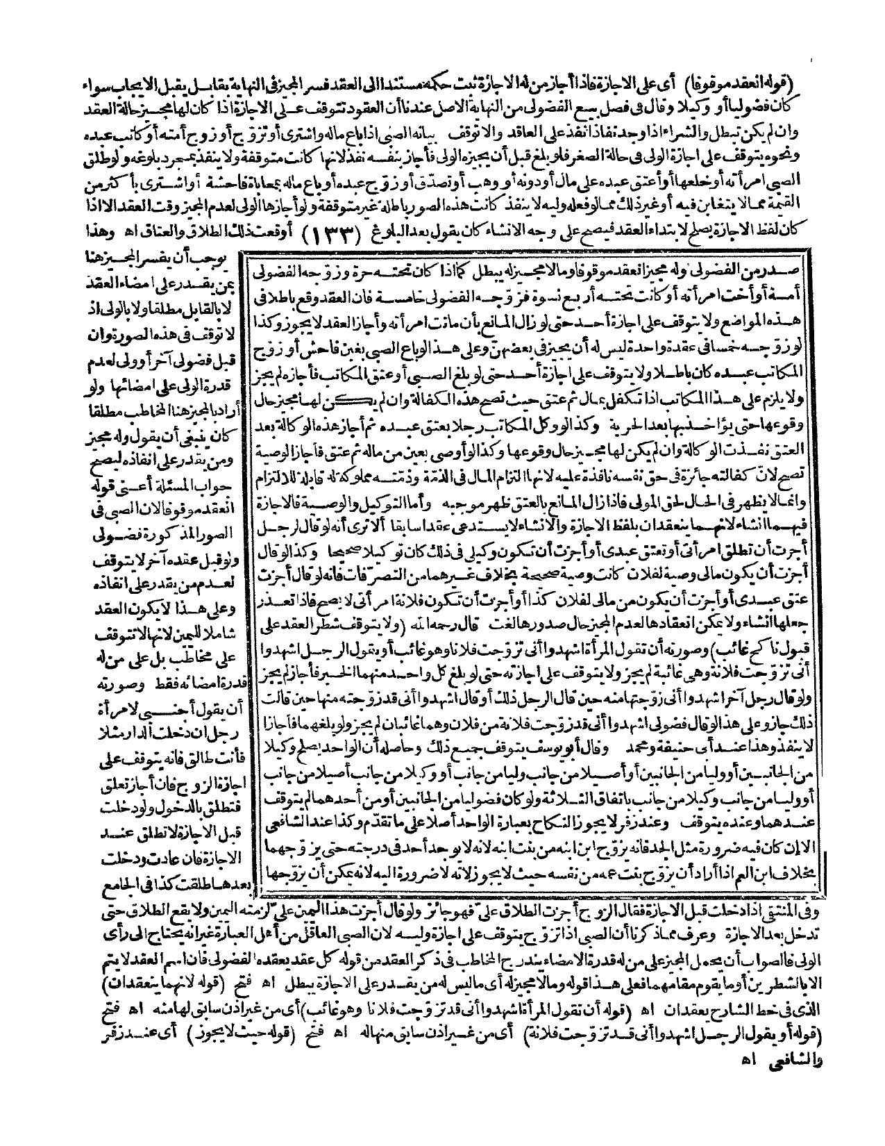 صَدَرَ مِنْ الْفُضُولِيِّ وَلَهُ مُجِيزٌ انْعَقَدَ مَوْقُوفًا وَمَا لَا مُجِيزَ لَهُ يَبْطُلُ كَمَا إذَا كَانَ تَحْتَهُ حُرَّةٌ وَزَوَّجَهُ الْفُضُولِيُّ أَمَةً أَوْ أُخْتَ امْرَأَتِهِ أَوْ كَانَتْ تَحْتَهُ أَرْبَعُ نِسْوَةٍ فَزَوَّجَهُ الْفُضُولِيُّ خَامِسَةً فَإِنَّ الْعَقْدَ وَقَعَ بَاطِلًا فِي هَذِهِ الْمَوَاضِعِ وَلَا يَتَوَقَّفُ عَلَى إجَازَةِ أَحَدٍ حَتَّى لَوْ زَالَ الْمَانِعُ بِأَنْ مَاتَتْ امْرَأَتُهُ وَأَجَازَ الْعَقْدَ لَا يَجُوزُ، وَكَذَا لَوْ زَوَّجَهُ خَمْسًا فِي عُقْدَةٍ وَاحِدَةٍ لَيْسَ لَهُ أَنْ يُجِيزَ فِي بَعْضِهِنَّ وَعَلَى هَذَا لَوْ بَاعَ الصَّبِيَّ بِغَبْنٍ فَاحِشٍ أَوْ زَوَّجَ الْمُكَاتَبُ عَبْدَهُ كَانَ بَاطِلًا وَلَا يَتَوَقَّفُ عَلَى إجَازَةِ أَحَدٍ حَتَّى لَوْ بَلَغَ الصَّبِيُّ أَوْ عَتَقَ الْمُكَاتَبُ فَأَجَازَهُ لَمْ يَجُزْ وَلَا يَلْزَمُ عَلَى هَذَا الْمُكَاتِبِ إذَا تَكَفَّلَ بِمَالٍ، ثُمَّ عَتَقَ حَيْثُ تَصِحُّ هَذِهِ الْكَفَالَةُ، وَإِنْ لَمْ يَكُنْ لَهَا مُجِيزٌ حَالَ وُقُوعِهَا حَتَّى يُؤَاخَذَ بِهَا بَعْدَ الْحُرِّيَّةِ