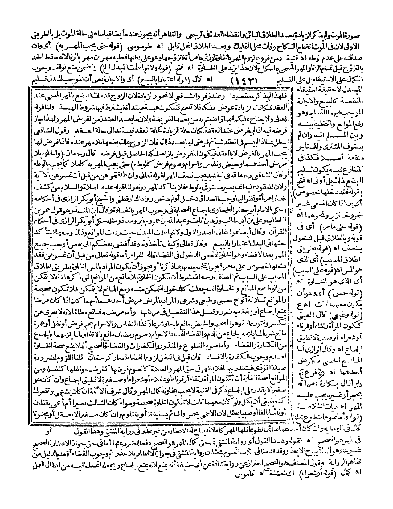 (قَوْلُهُ: حَتَّى يَجِبَ الْمَهْرُ بِهِ) أَيْ وَإِنْ صَدَّقَتْهُ عَلَى عَدَمِ الْوَطْءِ اهـ. قُنْيَةٌ وَمِنْ فُرُوعِ لُزُومِ الْمَهْرِ بِالْخَلْوَةِ لَوْ زَنَى بِامْرَأَةٍ فَتَزَوَّجَهَا وَهُوَ عَلَى بَطْنِهَا فَعَلَيْهِ مَهْرَانِ مَهْرٌ بِالزِّنَا؛ لِأَنَّهُ سَقَطَ الْحَدُّ بِالتَّزَوُّجِ قَبْلَ تَمَامِ الزِّنَا وَالْمَهْرُ الْمُسَمَّى بِالنِّكَاحِ؛ لِأَنَّ هَذَا يَزِيدُ عَلَى الْخَلْوَةِ اهـ. فَتْحٌ (قَوْلُهُ: وَلِأَنَّهَا سَلَّمَتْ الْمُبْدَلَ إلَخْ) يَتَضَمَّنُ مَنْعَ تَوَقُّفِ وُجُوبِ الْكَمَالِ عَلَى الِاسْتِيفَاءِ بَلْ عَلَى التَّسْلِيمِ اهـ. كَمَالٌ (قَوْلُهُ: اعْتِبَارًا بِالْبَيْعِ) أَيْ وَالْإِجَارَةِ يَعْنِي أَنَّ الْمُوجِبَ لِلْبَدَلِ تَسْلِيمُ الْمُبْدَلِ لَا حَقِيقَةُ اسْتِيفَاءِ الْمَنْفَعَةِ كَالْبَيْعِ وَالْإِجَارَةِ الْمُوجَبُ فِيهِمَا التَّسْلِيمُ وَهُوَ رَفْعُ الْمَوَانِعِ وَالتَّخْلِيَةُ بَيْنَهُ وَبَيْنَ الْمُسَلَّمِ إلَيْهِ وَإِنْ لَمْ يَسْتَوْفِ الْمُشْتَرِي وَالْمُسْتَأْجِرُ مَنْفَعَةً أَصْلًا فَكَذَا فِي الْمُتَنَازَعِ فِيهِ يَكُونُ تَسْلِيمُ الْبُضْعِ بِذَلِكَ بَلْ أَوْلَى اهـ. فَتْحٌ (قَوْلُهُ: فَقَدْ دَخَلَهَا خُصُوصٌ) أَيْ بِمَا إذَا كَانَ الْمُسَمَّى غَيْرَ خَمْرٍ وَخِنْزِيرٍ وَنَحْوِهِمَا اهـ. (قَوْلُهُ: عَلَى مَا مَرَّ) أَيْ فِي قَوْلِهِ وَبِالطَّلَاقِ قَبْلَ الدُّخُولِ يَتَنَصَّفُ اهـ. (قَوْلُهُ: بِطَرِيقِ إطْلَاقِ الْمُسَبَّبِ) أَيْ الَّذِي هُوَ الْمَسُّ اهـ. (قَوْلُهُ: عَلَى السَّبَبِ) أَيْ الَّذِي هُوَ الْخَلْوَةُ اهـ. (قَوْلُهُ: حِسِّيٌّ) أَيْ وَهُوَ أَنْ يَكُونَ مَعَهُمَا ثَالِثٌ اهـ. ع (قَوْلُهُ: وَطَبْعِيٌّ) قَالَ الْعَيْنِيُّ كَكَوْنِ الْمَرْأَةِ رَتْقَاءَ أَوْ قَرْنَاءَ أَوْ شَعْرَاءَ أَوْ صَغِيرَةً لَا تُطِيقُ الْجِمَاعَ اهـ. وَقَالَ الرَّازِيّ أَمَّا الْمَانِعُ الْحِسِّيُّ فَكَمَرَضِ أَحَدِهِمَا اهـ. (فَرْعٌ). وَلَوْ أَزَالَ بَكَارَةَ امْرَأَتِهِ بِحَجَرٍ أَوْ غَيْرِهِ يَجِبُ عَلَيْهِ الْمَهْرُ اهـ. دِيَاتُ الْخُلَاصَةِ (قَوْلُهُ: وَأَمَّا صَوْمُ التَّطَوُّعِ إلَخْ) قَالَ فِي الْهِدَايَةِ وَإِنْ كَانَ أَحَدُهُمَا صَائِمًا تَطَوُّعًا فَلَهَا الْمَهْرُ كُلُّهُ؛ لِأَنَّهُ يُبَاحُ لَهُ الْإِفْطَارُ مِنْ غَيْرِ عُذْرٍ فِي رِوَايَةِ الْمُنْتَقَى، وَهَذَا الْقَوْلُ فِي الْمَهْرِ هُوَ الصَّحِيحُ اهـ. فَقَوْلُهُ: وَهَذَا الْقَوْلُ أَيْ رِوَايَةُ الْمُنْتَقَى فِي حَقِّ كَمَالِ الْمَهْرِ هُوَ الصَّحِيحُ دَفْعًا لِلضَّرَرِ عَنْهَا أَمَّا فِي حَقِّ جَوَازِ الْإِفْطَارِ فَالصَّحِيحُ غَيْرُهَا وَهُوَ أَنَّهُ لَا يُبَاحُ إلَّا بِعُذْرٍ، وَقَدْ قَدَّمْنَا فِي كِتَابِ الصَّوْمِ بَحْثًا أَنَّ رِوَايَةَ الْمُنْتَقَى فِي جَوَازِ الْإِفْطَارِ بِلَا عُذْرٍ، ثُمَّ وُجُوبُ الْقَضَاءِ أَقْعَدُ بِالدَّلِيلِ مِنْ ظَاهِرِ الرِّوَايَةِ وَقَوْلُ الْمُصَنِّفِ هُوَ الصَّحِيحُ احْتِرَازٌ عَنْ رِوَايَةٍ شَاذَّةٍ عَنْ أَبِي حَنِيفَةَ أَنَّهُ يَمْنَعُ؛ لِأَنَّهُ يَمْنَعُ الْجِمَاعَ وَيَجْعَلُهُ إثْمًا لِمَا فِيهِ مِنْ إبْطَالِ الْعَمَلِ اهـ. كَمَالٌ (قَوْلُهُ: أَوْ شَعْرَاءَ) أَيْ خَشِنَةً اهـ. قَامُوسٌ