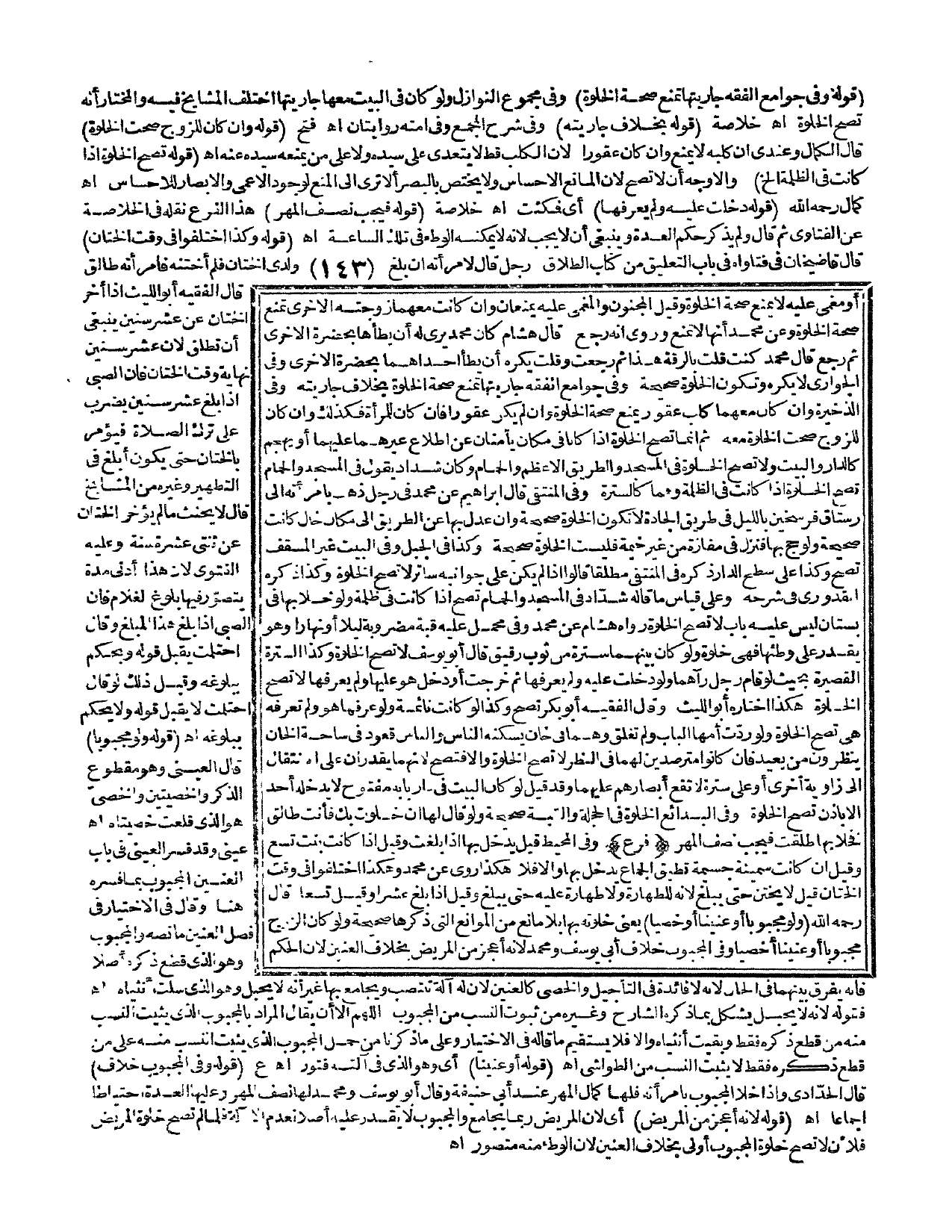 أَوْ مُغْمًى عَلَيْهِ لَا يَمْنَعُ صِحَّةَ الْخَلْوَةِ، وَقِيلَ الْمَجْنُونُ وَالْمُغْمَى عَلَيْهِ يَمْنَعَانِ، وَإِنْ كَانَتْ مَعَهُمَا زَوْجَتُهُ الْأُخْرَى تَمْنَعُ صِحَّةَ الْخَلْوَةِ، وَعَنْ مُحَمَّدٍ أَنَّهَا لَا تَمْنَعُ وَرُوِيَ أَنَّهُ رَجَعَ قَالَ هِشَامٌ كَانَ مُحَمَّدٌ يَرَى لَهُ أَنْ يَطَأَهَا بِحَضْرَةِ الْأُخْرَى، ثُمَّ رَجَعَ قَالَ مُحَمَّدٌ: كُنْت قُلْت بِالرِّقَّةِ هَذَا، ثُمَّ رَجَعْت وَقُلْت يُكْرَهُ أَنْ يَطَأَ إحْدَاهُمَا بِحَضْرَةِ الْأُخْرَى وَفِي الْجَوَارِي لَا يُكْرَهُ وَتَكُونُ الْخَلْوَةُ صَحِيحَةً، وَفِي جَوَامِعِ الْفِقْهِ جَارِيَتُهَا تَمْنَعُ صِحَّةَ الْخَلْوَةِ بِخِلَافِ جَارِيَتِهِ