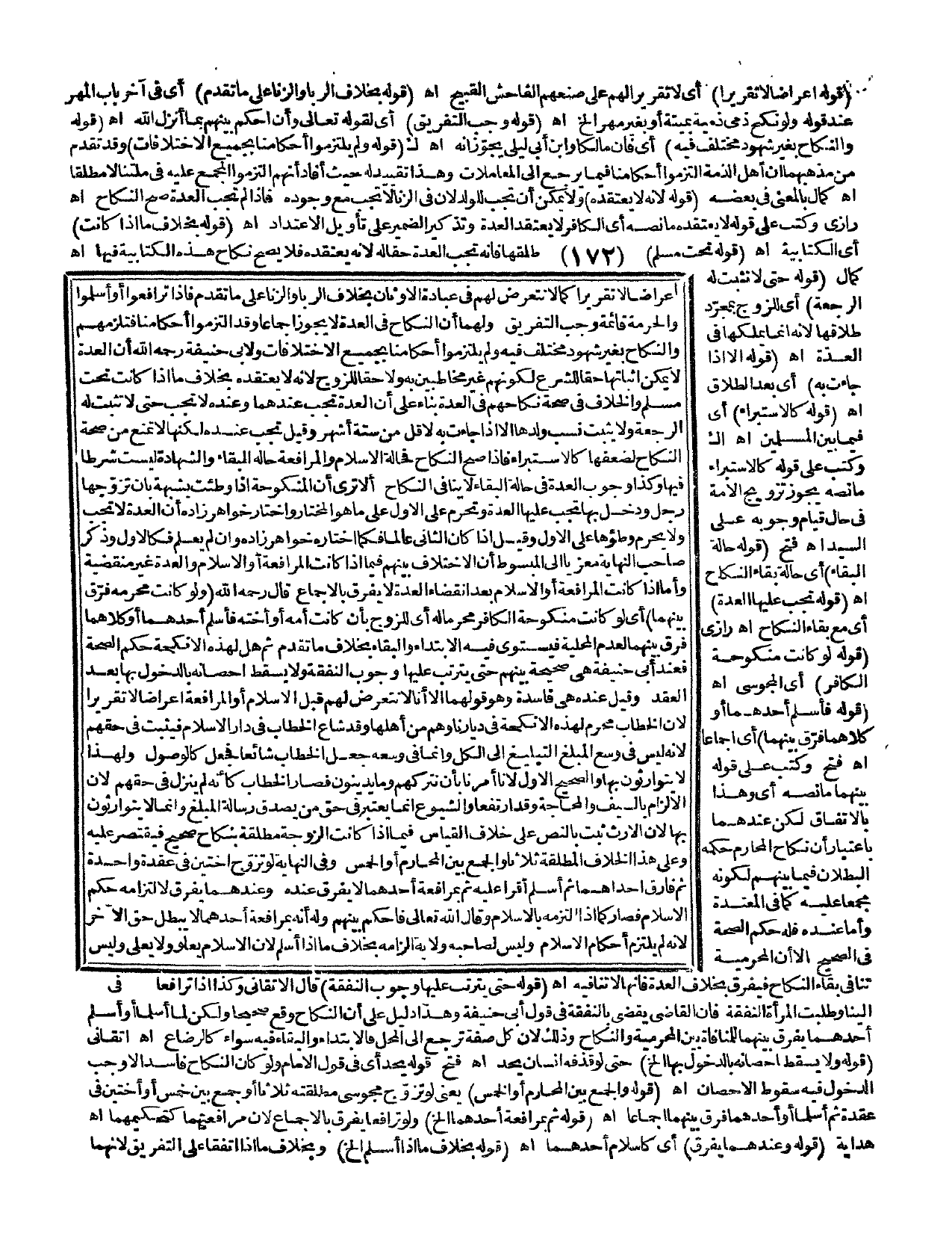 رَازِيٌّ وَكَتَبَ عَلَى قَوْلِهِ لَا يَعْتَقِدُهُ مَا نَصُّهُ أَيْ الْكَافِرُ لَا يَعْتَقِدُ الْعِدَّةَ وَتَذْكِيرُ الضَّمِيرِ عَلَى تَأْوِيلِ الِاعْتِدَادِ اهـ. (قَوْلُهُ: بِخِلَافِ مَا إذَا كَانَتْ) أَيْ الْكِتَابِيَّةُ اهـ. (قَوْلُهُ: تَحْتَ مُسْلِمٍ) طَلَّقَهَا فَإِنَّهُ تَجِبُ الْعِدَّةُ حَقًّا لَهُ؛ لِأَنَّهُ يَعْتَقِدُهُ فَلَا يَصِحُّ نِكَاحُ هَذِهِ الْكِتَابِيَّةِ فِيهَا اهـ. كَمَالٌ (قَوْلُهُ: حَتَّى لَا تَثْبُتَ لَهُ الرَّجْعَةُ) أَيْ لِلزَّوْجِ بِمُجَرَّدِ طَلَاقِهَا؛ لِأَنَّهُ إنَّمَا يَمْلِكُهَا فِي الْعِدَّةِ اهـ. (قَوْلُهُ: إلَّا إذَا جَاءَتْ بِهِ) أَيْ بَعْدَ الطَّلَاقِ اهـ. (قَوْلُهُ: كَالِاسْتِبْرَاءِ) أَيْ فِيمَا بَيْنَ الْمُسْلِمِينَ اهـ. اك وَكَتَبَ عَلَى قَوْلِهِ كَالِاسْتِبْرَاءِ مَا نَصُّهُ: يَجُوزُ تَزْوِيجُ الْأَمَةِ فِي حَالِ قِيَامِ وُجُوبِهِ عَلَى السَّيِّدِ اهـ. فَتْحٌ (قَوْلُهُ: حَالَةَ الْبَقَاءِ) أَيْ حَالَةَ بَقَاءِ النِّكَاحِ اهـ. (قَوْلُهُ: تَجِبُ عَلَيْهَا الْعِدَّةُ) أَيْ مَعَ بَقَاءِ النِّكَاحِ اهـ. رَازِيٌّ (قَوْلُهُ: لَوْ كَانَتْ مَنْكُوحَةُ الْكَافِرِ) أَيْ الْمَجُوسِيِّ اهـ. (قَوْلُهُ: فَأَسْلَمَ أَحَدُهُمَا أَوْ كِلَاهُمَا فُرِّقَ بَيْنَهُمَا) أَيْ إجْمَاعًا اهـ. فَتْحٌ وَكَتَبَ عَلَى قَوْلِهِ بَيْنَهُمَا مَا نَصُّهُ أَيْ وَهَذَا بِالِاتِّفَاقِ لَكِنْ عِنْدَهُمَا بِاعْتِبَارِ أَنَّ نِكَاحَ الْمَحَارِمَ حُكْمُهُ الْبُطْلَانُ فِيمَا بَيْنَهُمْ لِكَوْنِهِ مُجْمَعًا عَلَيْهِ كَمَا فِي الْمُعْتَدَّةِ.