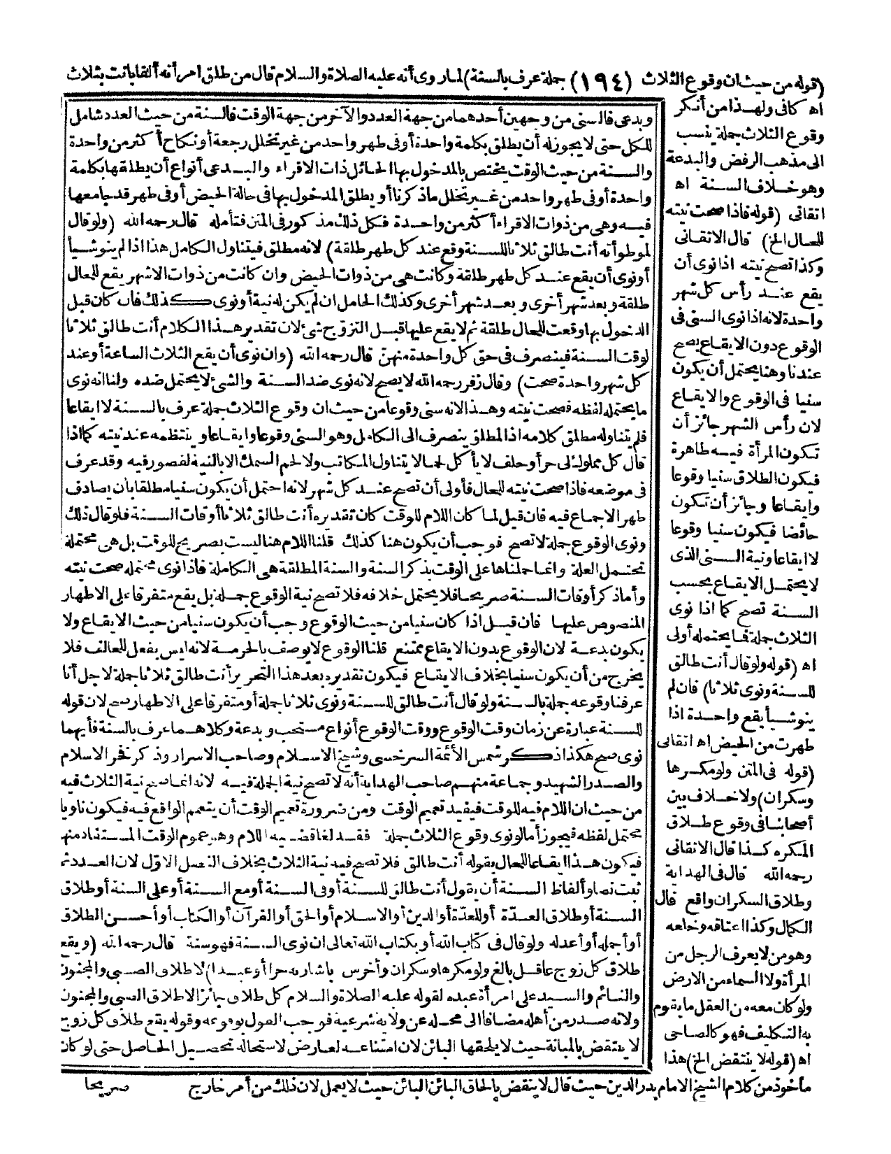 وَالسُّنَّةُ الْمُطْلَقَةُ هِيَ الْكَامِلَةُ فَإِذَا نَوَى مُحْتَمَلَهُ صَحَّتْ نِيَّتُهُ، وَأَمَّا ذِكْرُ أَوْقَاتِ السُّنَّةِ صَرِيحًا فَلَا يَحْتَمِلُ خِلَافَهُ فَلَا تَصِحُّ نِيَّةُ الْوُقُوعِ جُمْلَةً، بَلْ يَقَعُ مُتَفَرِّقًا عَلَى الْأَطْهَارِ الْمَنْصُوصِ عَلَيْهَا فَإِنْ قِيلَ إذَا كَانَ سُنِّيًّا مِنْ حَيْثُ الْوُقُوعُ وَجَبَ أَنْ يَكُونَ سُنِّيًّا مِنْ حَيْثُ الْإِيقَاعُ وَلَا يَكُونُ بِدْعَةً؛ لِأَنَّ الْوُقُوعَ بِدُونِ الْإِيقَاعِ مُمْتَنِعٌ، قُلْنَا الْوُقُوعُ لَا يُوصَفُ بِالْحُرْمَةِ؛ لِأَنَّهُ لَيْسَ بِفِعْلٍ لِلْحَالِفِ فَلَا يَخْرُجُ مِنْ أَنْ يَكُونَ سُنِّيًّا بِخِلَافِ الْإِيقَاعِ، فَيَكُونُ تَقْدِيرُهُ بَعْدَ هَذَا التَّحْرِيرِ أَنْتِ طَالِقٌ ثَلَاثًا جُمْلَةً لِأَجْلِ أَنَّا عَرَفْنَا وُقُوعَهُ جُمْلَةً بِالسُّنَّةِ، وَلَوْ قَالَ أَنْتِ طَالِقٌ لِلسُّنَّةِ وَنَوَى ثَلَاثًا جُمْلَةً أَوْ مُتَفَرِّقًا عَلَى الْأَطْهَارِ صَحَّ؛ لِأَنَّ قَوْلَهُ لِلسُّنَّةِ عِبَارَةٌ عَنْ زَمَانِ وَقْتِ الْوُقُوعِ، وَوَقْتُ الْوُقُوعِ أَنْوَاعُ مُسْتَحَبٌّ وَبِدْعَةٌ وَكِلَاهُمَا عُرِفَ بِالسُّنَّةِ فَأَيُّهُمَا نَوَى صَحَّ هَكَذَا ذَكَرَ شَمْسُ الْأَئِمَّةِ السَّرَخْسِيُّ وَشَيْخُ الْإِسْلَامِ وَصَاحِبُ الْأَسْرَارِ، وَذَكَرَ فَخْرُ الْإِسْلَامِ وَالصَّدْرُ الشَّهِيدُ وَجَمَاعَةٌ مِنْهُمْ صَاحِبُ الْهِدَايَةِ أَنَّهُ لَا تَصِحُّ نِيَّةُ الْجُمْلَةِ فِيهِ؛ لِأَنَّهُ إنَّمَا صَحَّ نِيَّةُ الثَّلَاثِ فِيهِ مِنْ حَيْثُ إنَّ اللَّامَ فِيهِ لِلْوَقْتِ فَيُفِيدُ تَعْمِيمَ الْوَقْتِ وَمِنْ ضَرُورَةِ تَعْمِيمِ الْوَقْتِ أَنْ يَتَعَمَّمَ الْوَاقِعُ فِيهِ، فَيَكُونُ نَاوِيًا مُحْتَمِلَ لَفْظِهِ فَيَجُوزُ أَمَّا لَوْ نَوَى وُقُوعَ الثَّلَاثِ جُمْلَةً فَقَدْ لَغَا قَضِيَّةَ اللَّامِ وَهُوَ عُمُومُ الْوَقْتِ الْمُسْتَفَادِ مِنْهَا، فَيَكُونُ هَذَا إيقَاعًا لِلْحَالِ بِقَوْلِهِ أَنْتِ طَالِقٌ فَلَا تَصِحُّ فِيهِ نِيَّةُ الثَّلَاثِ بِخِلَافِ الْفَصْلِ الْأَوَّلِ؛ لِأَنَّ الْعَدَدَ ثَمَّ ثَبَتَ نَصًّا وَأَلْفَاظُ السُّنَّةِ أَنْ يَقُولَ أَنْتِ طَالِقٌ لِلسُّنَّةِ أَوْ فِي السُّنَّةِ أَوْ مَعَ السُّنَّةِ أَوْ عَلَى السُّنَّةِ أَوْ طَلَاقَ السُّنَّةِ أَوْ طَلَاقَ الْعِدَّةِ أَوْ لِلْعِدَّةِ أَوْ الدِّينِ أَوْ الْإِسْلَامِ أَوْ الْحَقِّ أَوْ الْقُرْآنِ أَوْ الْكِتَابِ أَوْ أَحْسَنِ الطَّلَاقِ أَوْ أَجْمَلِهِ أَوْ أَعْدَلِهِ، وَلَوْ قَالَ فِي كِتَابِ اللَّهِ أَوْ بِكِتَابِ اللَّهِ تَعَالَى إنْ نَوَى السُّنَّةَ فَهُوَ سُنَّةٌ