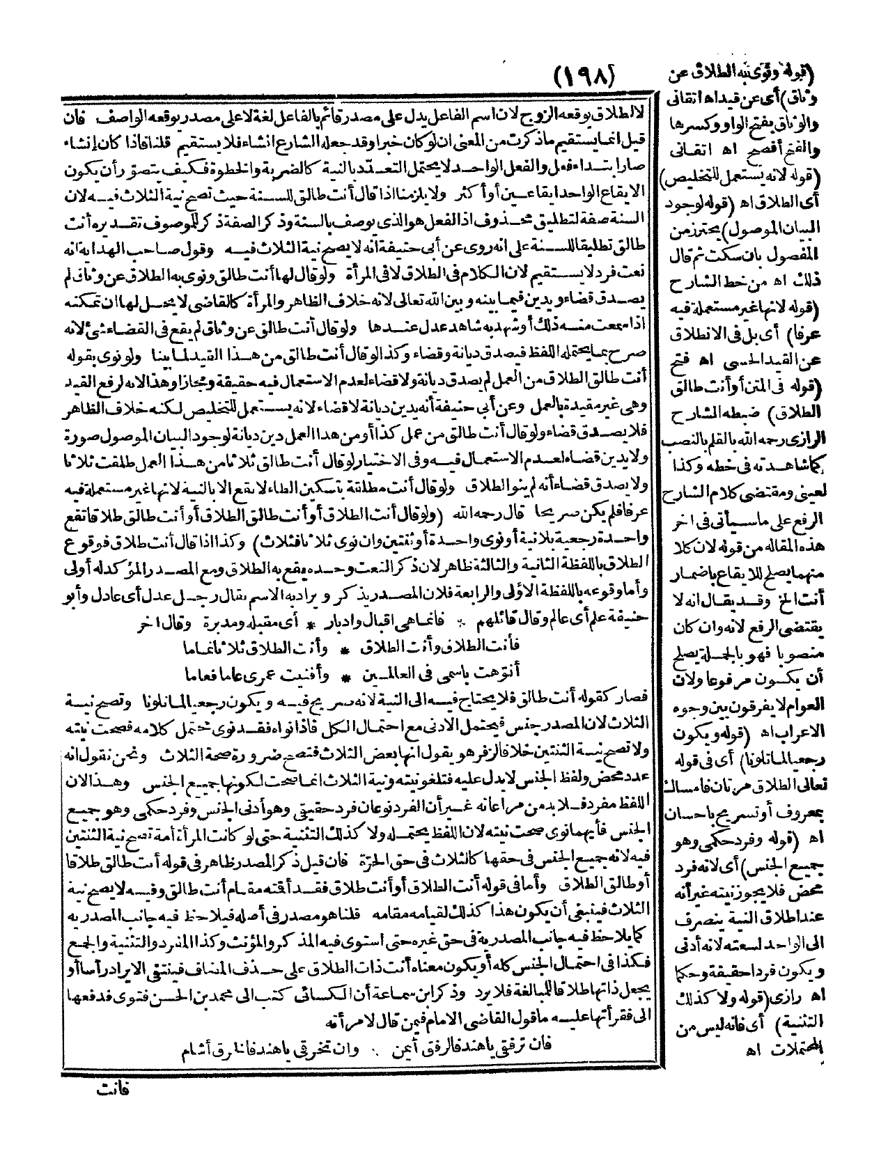 (قَوْلُهُ فِي الْمَتْنِ أَوْ أَنْتِ طَالِقٌ الطَّلَاقَ) ضَبَطَهُ الشَّارِحُ الرَّازِيّ - رَحِمَهُ اللَّهُ - بِالْقَلَمِ بِالنَّصْبِ كَمَا شَاهَدْتُهُ فِي خَطِّهِ، وَكَذَا الْعَيْنِيُّ وَمُقْتَضَى كَلَامِ الشَّارِحِ الرَّفْعُ عَلَى مَا سَيَأْتِي فِي آخِرِ هَذِهِ الْمَقَالَةِ مِنْ قَوْلِهِ؛ لِأَنَّ كُلًّا مِنْهُمَا يَصْلُحُ لِلْإِيقَاعِ بِإِضْمَارِ أَنْتِ إلَخْ وَقَدْ يُقَالُ إنَّهُ لَا يَقْتَضِي الرَّفْعَ؛ لِأَنَّهُ وَإِنْ كَانَ مَنْصُوبًا فَهُوَ بِالْجُمْلَةِ يَصْلُحُ أَنْ يَكُونَ مَرْفُوعًا، وَلِأَنَّ الْعَوَامَّ لَا يُفَرِّقُونَ بَيْنَ وُجُوهِ الْإِعْرَابِ. اهـ. (قَوْلُهُ وَيَكُونُ رَجْعِيًّا لِمَا تَلَوْنَا) أَيْ فِي قَوْله تَعَالَى {الطَّلاقُ مَرَّتَانِ فَإِمْسَاكٌ بِمَعْرُوفٍ أَوْ تَسْرِيحٌ بِإِحْسَانٍ} [البقرة: 229]. اهـ. (قَوْلُهُ وَفَرْدٌ حُكْمِيٌّ وَهُوَ جَمِيعُ الْجِنْسِ) أَيْ؛ لِأَنَّهُ فَرْدٌ مَحْضٌ فَلَا يَجُوزُ نِيَّتُهُ غَيْرَ أَنَّهُ عِنْدَ إطْلَاقِ النِّيَّةِ يَنْصَرِفُ إلَى الْوَاحِدِ لِسَعَتِهِ؛ لِأَنَّهُ أَدْنَى وَيَكُونُ فَرْدًا حَقِيقَةً وَحُكْمًا. اهـ. رَازِيٌّ.