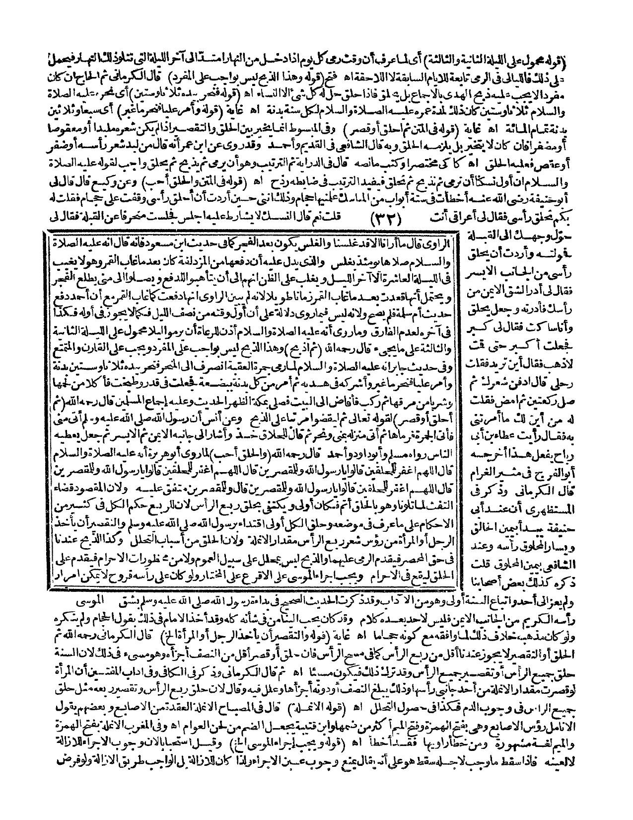 قَالَ الْكَرْمَانِيُّ وَذَكَرَ فِي الْمُسْتَظْهِرِيِّ أَنَّ عِنْدَ أَبِي حَنِيفَةَ يَبْدَأُ بِيَمِينِ الْحَالِقِ وَيَسَارِ الْمَحْلُوقِ رَأْسَهُ وَعِنْدَ الشَّافِعِيِّ بِيَمِينِ الْمَحْلُوقِ قُلْت ذَكَرَهُ كَذَلِكَ بَعْضُ أَصْحَابِنَا وَلَمْ يَعْزُ إلَى أَحَدٌ وَاتِّبَاعُ السُّنَّةِ أَوْلَى، وَهُوَ مِنْ الْآدَابِ وَقَدْ ذَكَرْت الْحَدِيثَ الصَّحِيحَ فِي بُدَاءَةِ رَسُولِ اللَّهِ - صَلَّى اللَّهُ عَلَيْهِ وَسَلَّمَ - بِشِقِّ رَأْسِهِ الْكَرِيمِ مِنْ الْجَانِبِ الْأَيْمَنِ فَلَيْسَ لِأَحَدٍ بَعْدَهُ كَلَامٌ وَقَدْ كَانَ يُحِبُّ التَّيَامُنَ فِي شَأْنِهِ كُلِّهِ وَقَدْ أَخَذَ الْإِمَامُ فِي ذَلِكَ بِقَوْلِ الْحَجَّامِ وَلَمْ يُنْكِرْهُ وَلَوْ كَانَ مَذْهَبُهُ خِلَافَ ذَلِكَ لَمَا وَافَقَهُ مَعَ كَوْنِهِ حَجَّامًا. اهـ. غَايَةٌ (قَوْلُهُ وَالتَّقْصِيرُ أَنْ يَأْخُذَ الرَّجُلُ أَوْ الْمَرْأَةُ إلَخْ) قَالَ الْكَرْمَانِيُّ - رَحِمَهُ اللَّهُ - ثُمَّ الْحَلْقُ أَوْ التَّقْصِيرُ لَا يَجُوزُ عِنْدَنَا أَقَلُّ مِنْ رُبُعِ الرَّأْسِ كَمَا فِي مَسْحِ الرَّأْسِ فَإِنْ حَلَقَ أَوْ قَصَّرَ أَقَلَّ مِنْ النِّصْفِ أَجْزَأَهُ، وَهُوَ مُسِيءٌ فِي ذَلِكَ؛ لِأَنَّ السُّنَّةَ حَلْقُ جَمِيعِ الرَّأْسِ أَوْ تَقْصِيرُ جَمِيعِ الرَّأْسِ، وَقَدْ تَرَكَ ذَلِكَ فَيَكُونُ مُسِيئًا اهـ ثُمَّ قَالَ الْكَرْمَانِيُّ وَذَكَرَ فِي الْكَافِي وَفِي آدَابِ الْمُفْتِينَ أَنَّ الْمَرْأَةَ لَوْ قَصَّرَتْ مِقْدَارَ الْأُنْمُلَةِ مِنْ أَحَدِ جَانِبَيْ رَأْسِهَا وَذَلِكَ يَبْلُغُ النِّصْفَ أَوْ دُونَهُ أَجْزَأَهَا وَعَلَّلَ فِيهِ وَقَالَ؛ لِأَنَّ حَلْقَ رُبُعِ الرَّأْسِ أَوْ تَقْصِيرَ رُبُعِهِ مِثْلُ حَلْقِ جَمِيعِ الرَّأْسِ فِي وُجُوبِ الدَّمِ فَكَذَا فِي حُصُولِ التَّحَلُّلِ اهـ