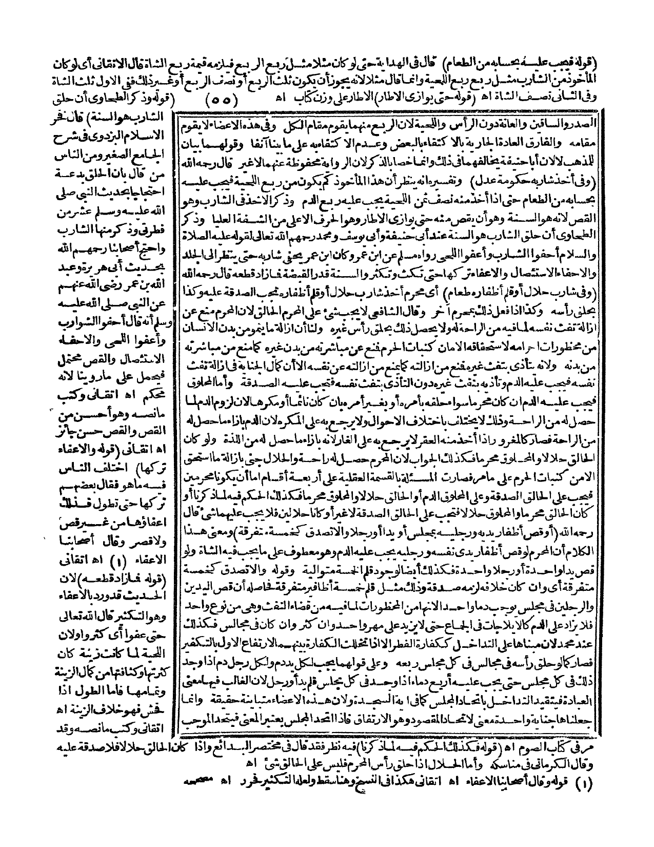 ـــــــــــــــــــــــــــــQقَوْلُهُ: فَيَجِبُ عَلَيْهِ بِحِسَابِهِ مِنْ الطَّعَامِ) قَالَ فِي الْهِدَايَةِ حَتَّى لَوْ كَانَ مَثَلًا مِثْلَ رُبْعِ الرُّبْعِ فَيَلْزَمُهُ قِيمَةُ رُبْعِ الشَّاةِ قَالَ الْأَتْقَانِيُّ: أَيْ لَوْ كَانَ الْمَأْخُوذُ مِنْ الشَّارِبِ مِثْلَ رُبْعِ رُبْعِ اللِّحْيَةِ، وَإِنَّمَا قَالَ مَثَلًا؛ لِأَنَّهُ يَجُوزُ أَنْ يَكُونَ ثُلُثَ الرُّبْعِ أَوْ نِصْفَ الرُّبْعِ أَوْ غَيْرَ ذَلِكَ فَفِي الْأَوَّلِ ثُلُثُ الشَّاةِ، وَفِي الثَّانِي نِصْفُ الشَّاةِ. اهـ. (قَوْلُهُ حَتَّى يُوَازِيَ الْإِطَارَ) الْإِطَارُ عَلَى وَزْنِ كِتَابٍ. اهـ. (قَوْلُهُ: وَذَكَرَ الطَّحَاوِيُّ أَنَّ حَلْقَ الشَّارِبِ هُوَ السُّنَّةُ) قَالَ فَخْرُ الْإِسْلَامِ الْبَزْدَوِيُّ فِي شَرْحِ الْجَامِعِ الصَّغِيرِ: وَمِنْ النَّاسِ مَنْ قَالَ: بِأَنَّ الْحَلْقَ بِدْعَةٌ احْتِجَاجًا بِحَدِيثِ النَّبِيِّ - صَلَّى اللَّهُ عَلَيْهِ وَسَلَّمَ - «عَشْرٌ مِنْ فِطْرَتِي وَذَكَرَ مِنْهَا الشَّارِبَ» وَاحْتَجَّ أَصْحَابُنَا - رَحِمَهُمُ اللَّهُ - بِحَدِيثِ أَبِي هُرَيْرَةَ وَعَبْدِ اللَّهِ بْنِ عُمَرَ عَنْ النَّبِيِّ - صَلَّى اللَّهُ عَلَيْهِ وَسَلَّمَ - أَنَّهُ قَالَ «اُحْفُوا الشَّوَارِبَ وَأَعْفُوا اللِّحَى» وَالْإِحْفَاءُ الِاسْتِئْصَالُ، وَالْقَصُّ مُحْتَمَلٌ فَيُحْمَلُ عَلَى مَا رَوَيْنَا؛ لِأَنَّهُ مُحْكَمٌ. اهـ. أَتْقَانِيٌّ وَكَتَبَ مَا نَصُّهُ: وَهُوَ أَحْسَنُ مِنْ الْقَصِّ، وَالْقَصُّ حَسَنٌ جَائِزٌ. اهـ. أَتْقَانِيٌّ (قَوْلُهُ: وَالْإِعْفَاءُ تَرْكُهَا) اخْتَلَفَ النَّاسُ فِيهِ مَا هُوَ فَقَالَ بَعْضُهُمْ: تَرْكُهَا حَتَّى تَطُولَ فَذَلِكَ إعْفَاؤُهَا مِنْ غَيْرِ قَصٍّ، وَلَا قَصْرٍ، وَقَالَ أَصْحَابُنَا: الْإِعْفَاءُ. اهـ. أَتْقَانِيٌّ (قَوْلُهُ: فَمَا زَادَ قَطَعَهُ)؛ لِأَنَّ الْحَدِيثَ قَدْ وَرَدَ بِالْإِعْفَاءِ، وَهُوَ التَّكْثِيرُ قَالَ اللَّهُ تَعَالَى {حَتَّى عَفَوْا} [الأعراف: 95] أَيْ كَثُرُوا وَلِأَنَّ اللِّحْيَةَ لَمَّا كَانَتْ زِينَةً كَانَ كَثْرَتُهَا وَكَثَافَتُهَا مِنْ كَمَالِ الزِّينَةِ وَتَمَامِهَا، فَأَمَّا الطُّولُ إذَا فَحُشَ فَهُوَ خِلَافُ الزِّينَةِ. اهـ. أَتْقَانِيٌّ وَكَتَبَ مَا نَصُّهُ وَقَدْ مَرَّ فِي كِتَابِ الصَّوْمِ. اهـ.