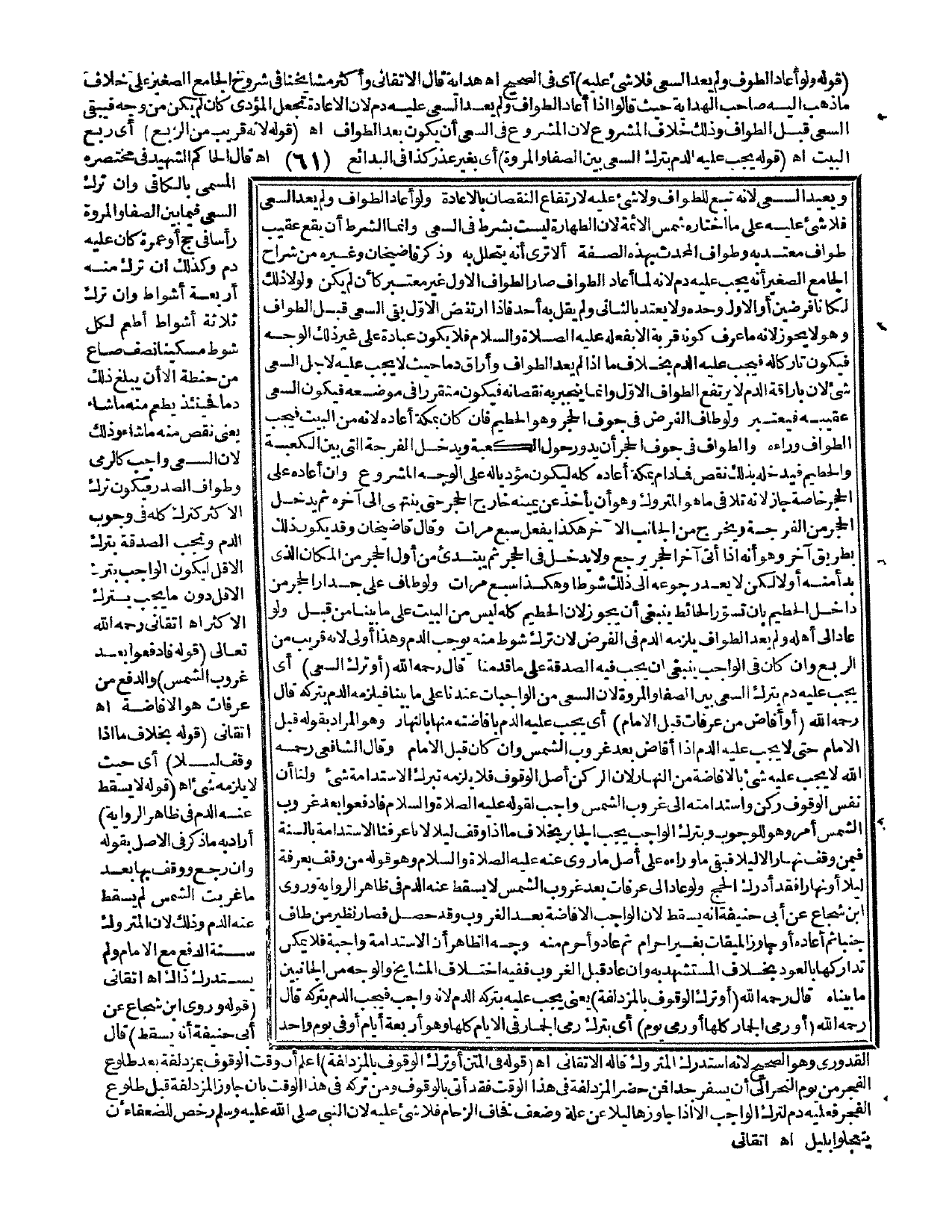 (قَوْلُهُ فِي الْمَتْنِ: أَوْ تَرَكَ الْوُقُوفَ بِالْمُزْدَلِفَةِ) اعْلَمْ أَنَّ وَقْتَ الْوُقُوفِ بِمُزْدَلِفَةَ بَعْدَ طُلُوعِ الْفَجْرِ مِنْ يَوْمِ النَّحْرِ إلَى أَنْ يُسْفِرَ جِدًّا فَمَنْ حَضَرَ الْمُزْدَلِفَةَ فِي هَذَا الْوَقْتِ فَقَدْ أَتَى بِالْوُقُوفِ وَمَنْ تَرَكَهُ فِي هَذَا الْوَقْتِ بِأَنْ جَاوَزَ الْمُزْدَلِفَةَ قَبْلَ طُلُوعِ الْفَجْرِ فَعَلَيْهِ دَمٌ لِتَرْكِ الْوَاجِبِ إلَّا إذَا جَاوَزَهَا لَيْلًا عَنْ عِلَّةٍ وَضَعْفٍ فَخَافَ الزِّحَامَ فَلَا شَيْءَ عَلَيْهِ؛ لِأَنَّ النَّبِيَّ - صَلَّى اللَّهُ عَلَيْهِ وَسَلَّمَ - «رَخَّصَ لِلضُّعَفَاءِ أَنْ يَتَعَجَّلُوا بِلَيْلٍ». اهـ. أَتْقَانِيٌّ