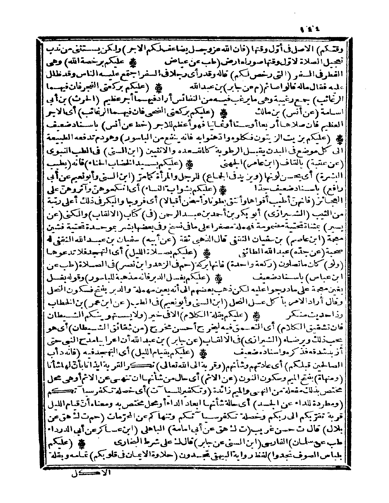 (عَلَيْكُم بِقِيَام اللَّيْل) أَي التَّهَجُّد فِيهِ (فَإِنَّهُ دأب الصَّالِحين قبلكُمْ) أَي عَادَتهم وشأنهم (وقربة إِلَى الله تَعَالَى) نكر الْقرْبَة إِيذَانًا بِأَن لَهَا شَأْنًا (ومنهاة) بِفَتْح الْمِيم وَسُكُون النُّون (عَن الْإِثْم) أَي حَال من شَأْنهَا أَن تنْهى عَن الْإِثْم أَو هِيَ مَحل مُخْتَصّ بذلك مفعلة من النَّهْي وَالْمِيم زَائِدَة (وتكفير للسيآت) أَي خصْلَة تكفر سيآتكم (ومطردة للداء عَن الْجَسَد) أَي حَالَة شَأْنهَا إبعاد الدَّاء أَو مَحل مُخْتَصّ بِهِ وَمَعْنَاهُ أَن قيام اللَّيْل قربَة تقربكم إِلَى ربكُم وخصلة تكفر سيآتكم وتنهاكم عَن الْمُحرمَات (حم ت ك هق عَن بِلَال) قَالَ ت // حسن غَرِيب // (ت ك هق عَن أبي أُمَامَة) الْبَاهِلِيّ (ابْن عَسَاكِر عَن أبي الدَّرْدَاء طب عَن سلمَان) الْفَارِسِي (ابْن السّني عَن جَابر) قَالَ ك على شَرط البُخَارِيّ