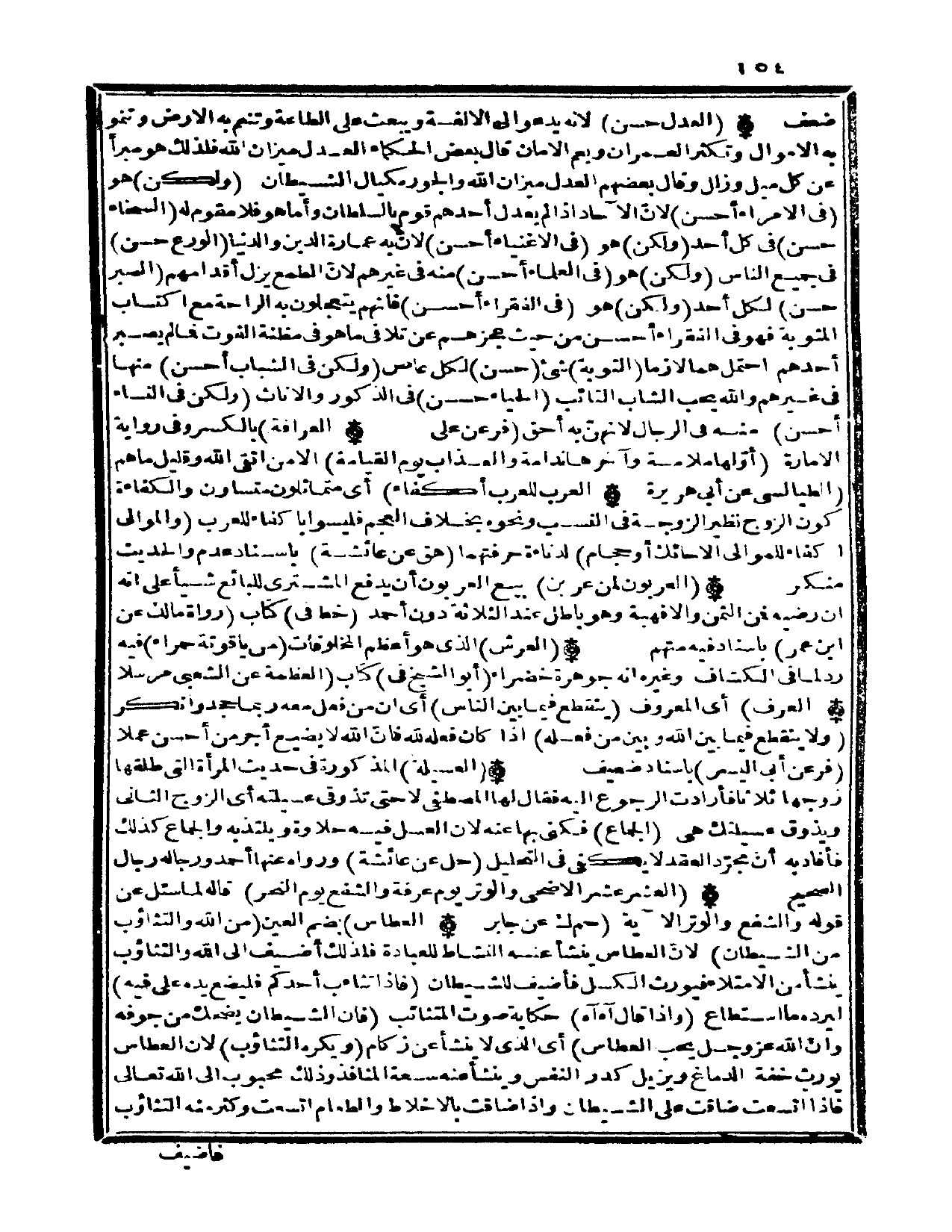 (الْعدْل حسن) لِأَنَّهُ يَدْعُو إِلَى الألفة وَيبْعَث على الطَّاعَة وتنعم بِهِ الأَرْض وتنمو بِهِ الْأَمْوَال وتكثر الْعمرَان ويعم الْأمان قَالَ بعض الْحُكَمَاء الْعدْل ميزَان الله فَلذَلِك هُوَ مبرأ عَن كل ميل وزلل وَقَالَ بَعضهم الْعدْل ميزَان الله والجور مكيال الشَّيْطَان
